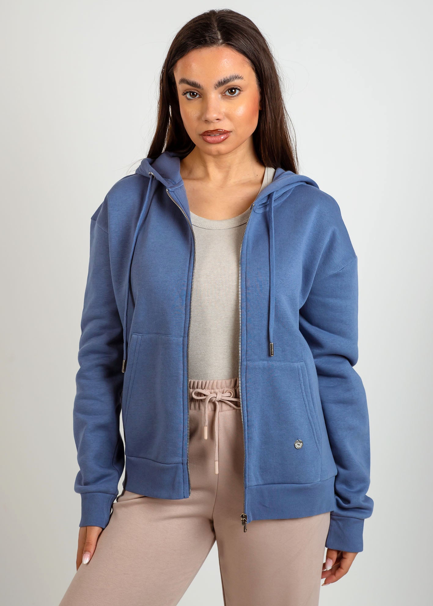Zακέτα φούτερ με κουκούλα, τσέπες στα πλάγια και ελαστικό τελείωμα. Κλείσιμο μπροστά με φερμουάρ.