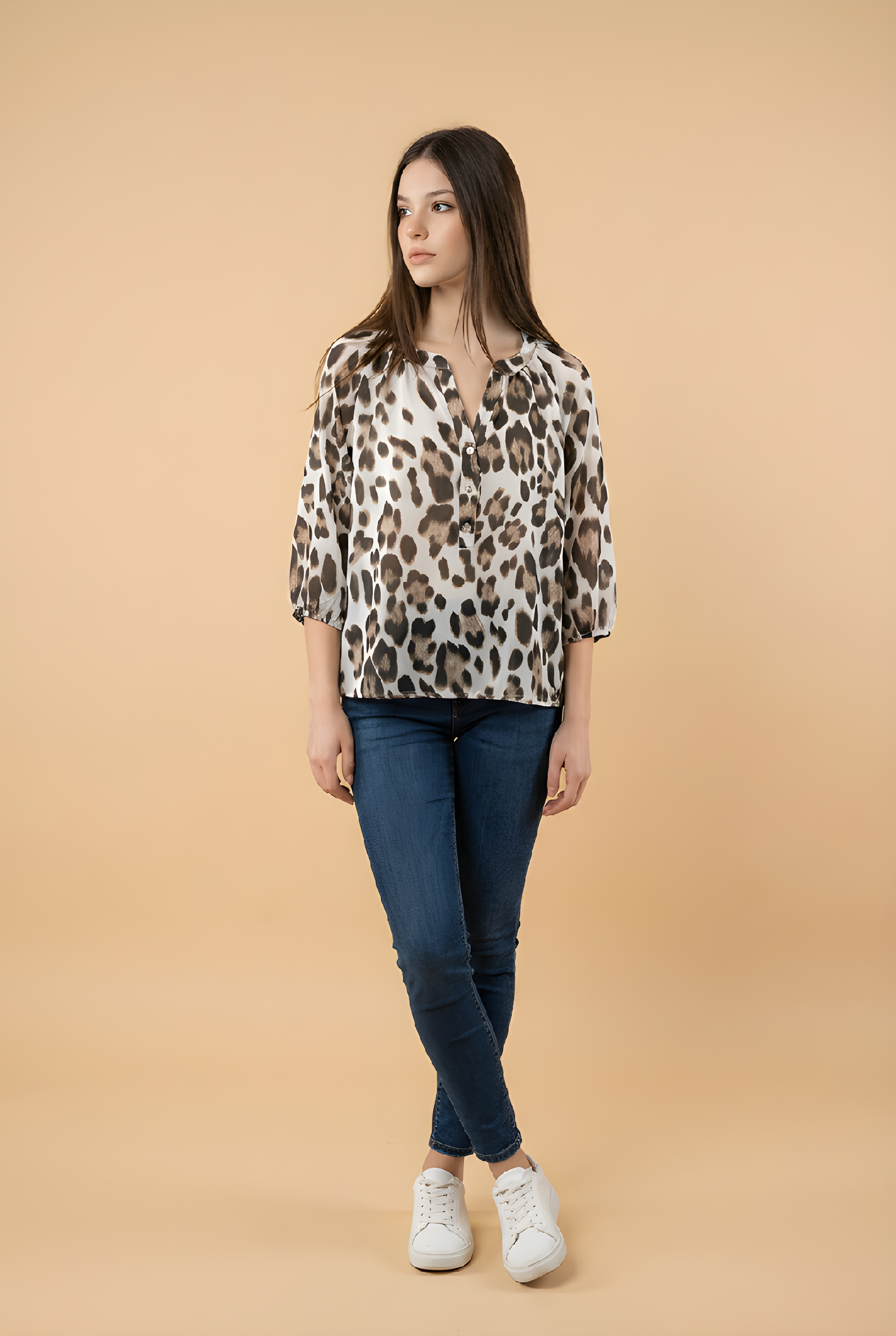 Μπλούζα πουκαμίσα με λεοπάρ σχέδιο, μανίκι 3/4 και στρογγυλή λαιμόκοψη. Κλείσιμο μπροστά με κουμπιά.