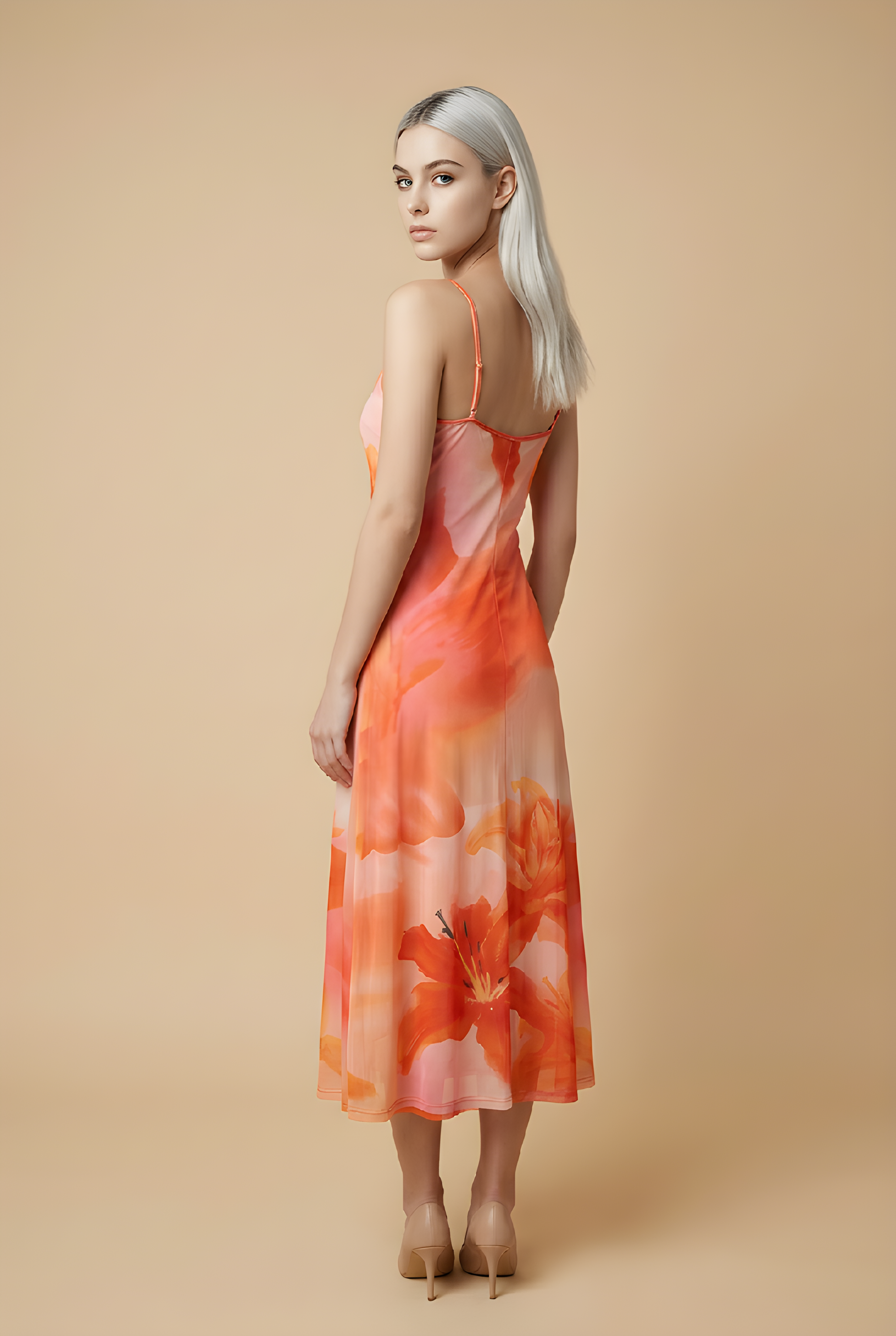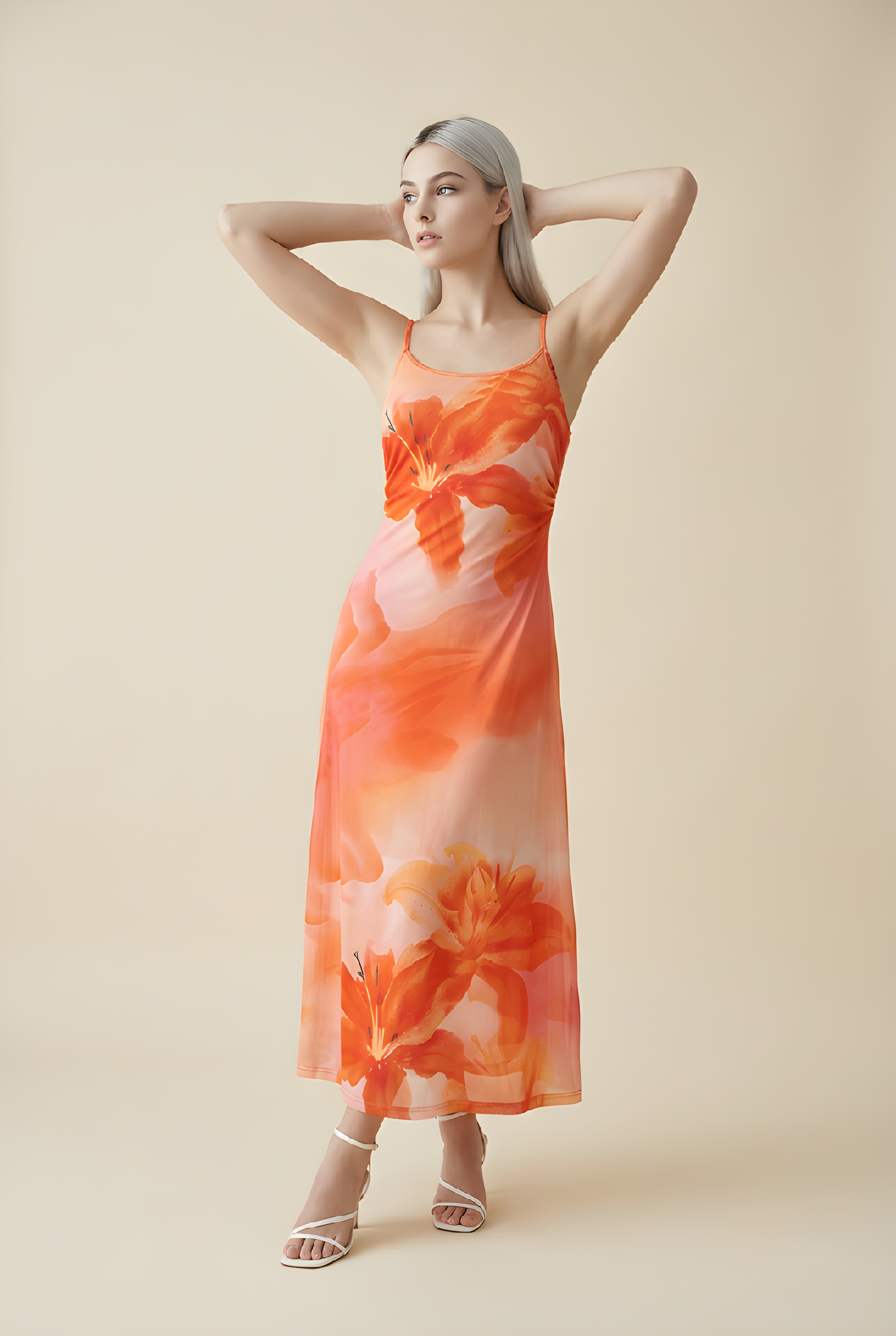 Μάξι φόρεμα με φλορά σχέδιο-πορτοκαλί