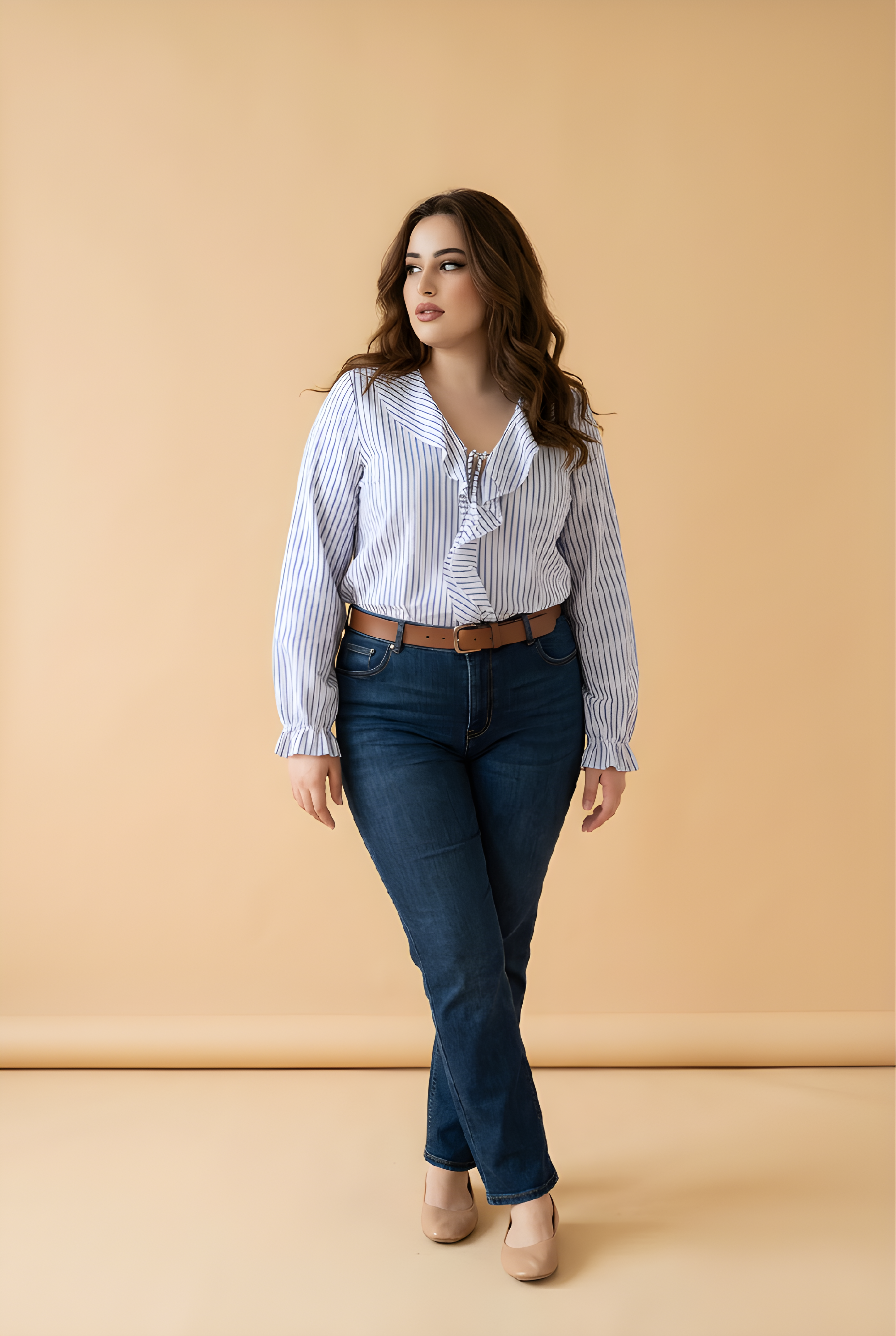 Ριγέ μπλούζα πουκαμίσα με μακρύ μανίκι, V ντεκολτέ και λεπτομέρεια με βολάν.