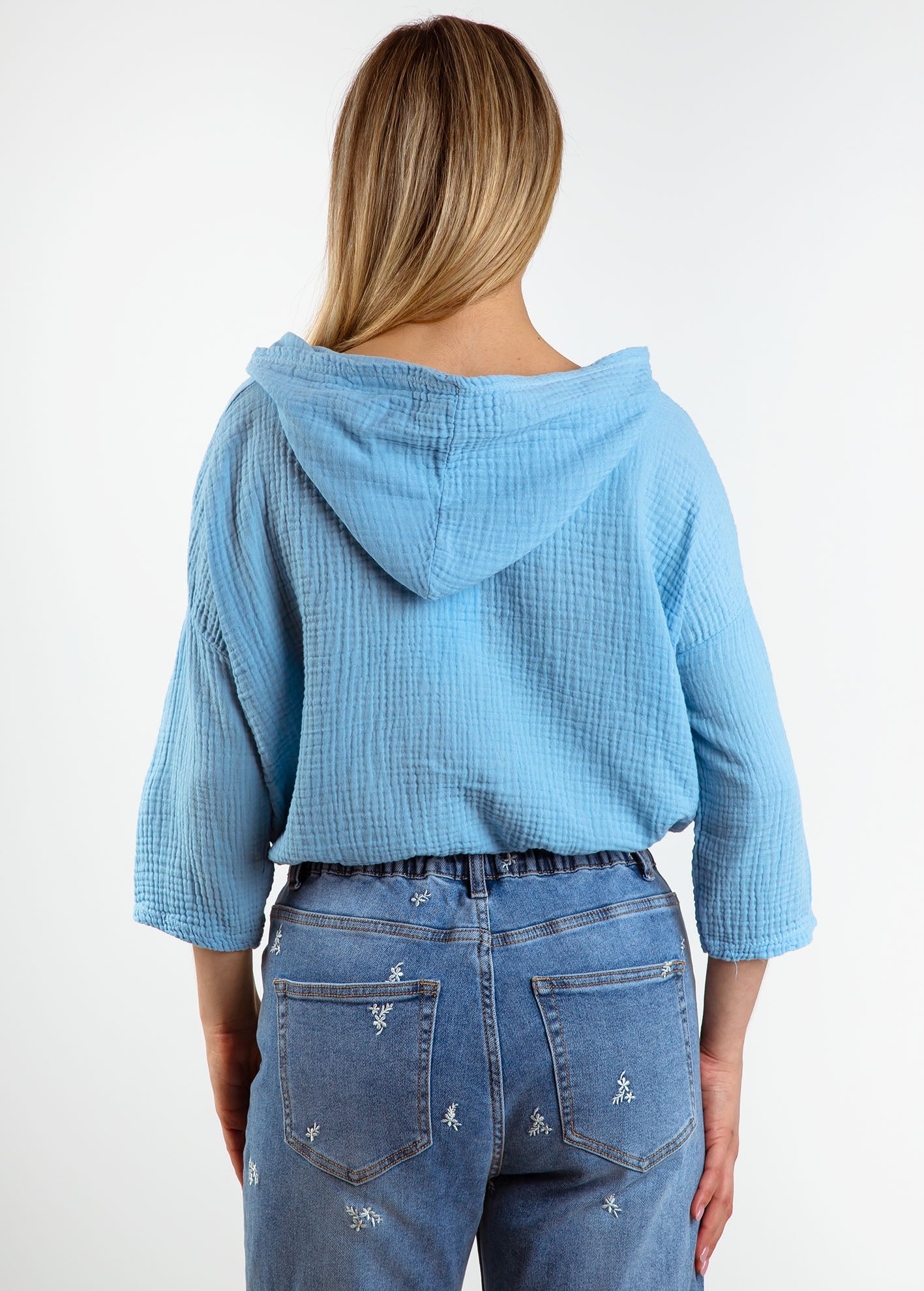 Πουκάμισο γκοφρέ με μανίκι 3/4, λεπτομέρεια με κουκούλα και ελαστικό τελείωμα με κορδόνι. Κλείσιμο μπροστά με κουμπιά.