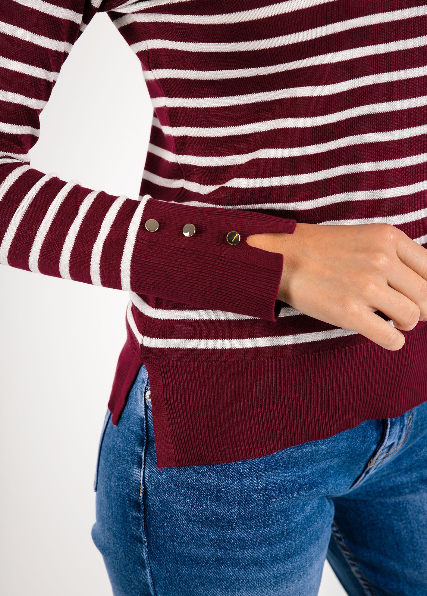 Ελαφρύ πλεκτό με ριγέ σχέδιο, μακρύ μανίκι και στρογγυλή λαιμόκοψη. Λεπτομέρεια με ανοίγματα στα πλάγια και διακοσμητικά χρυσά κουμπιά στο μανίκι.
