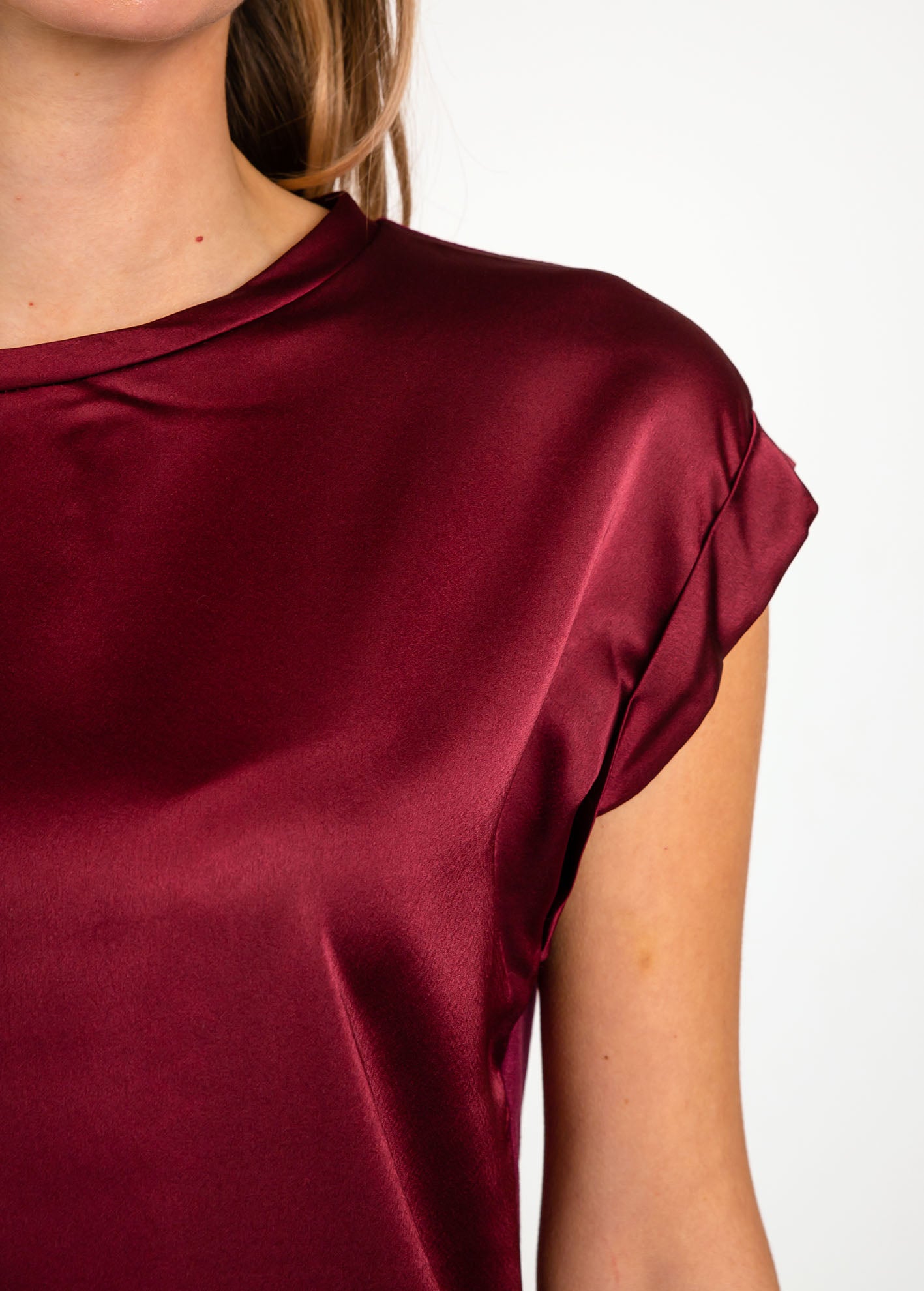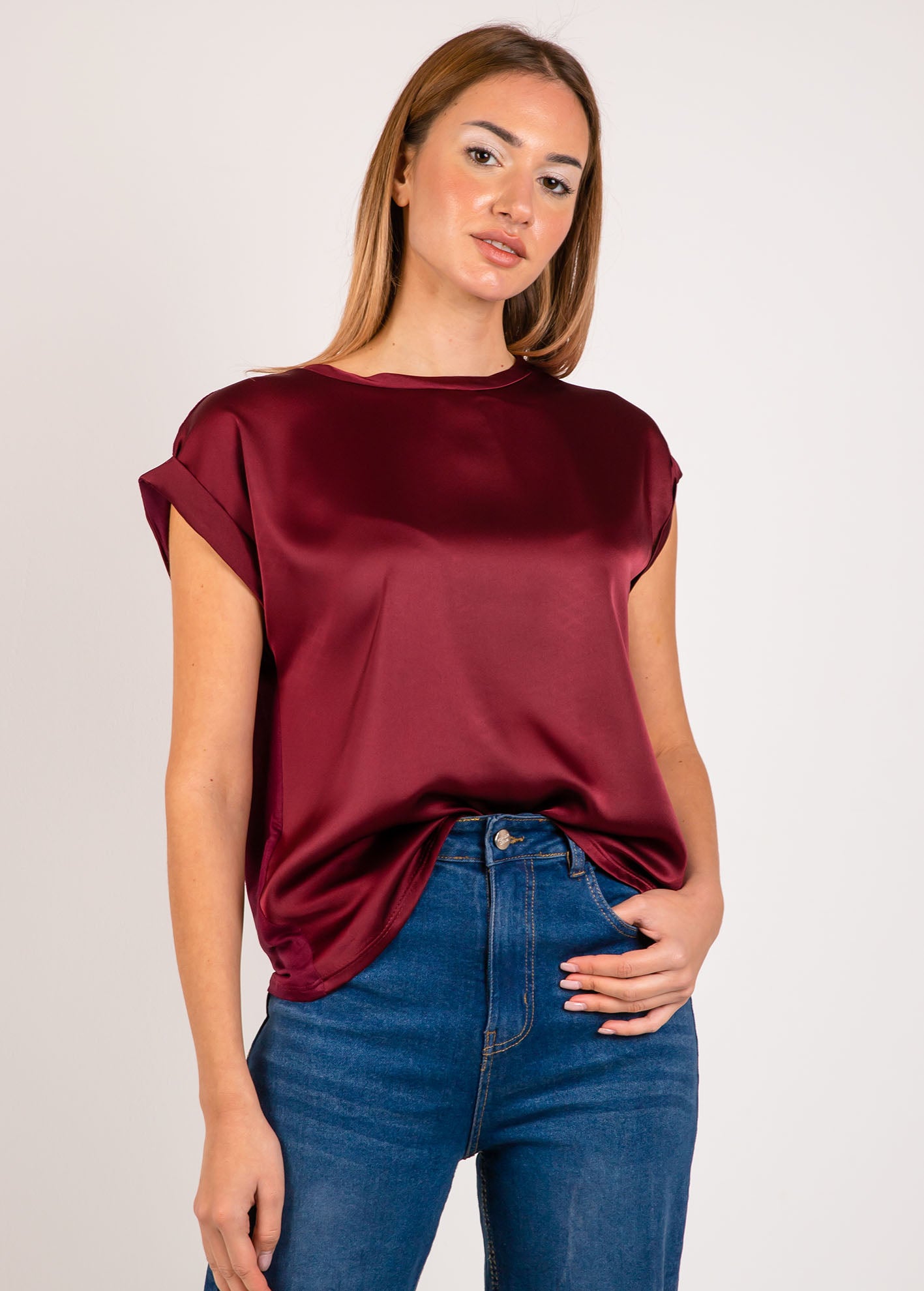 Σατινέ μπλούζα με κοντά γυριστά μανίκια και στρογγυλή λαιμόκοψη.