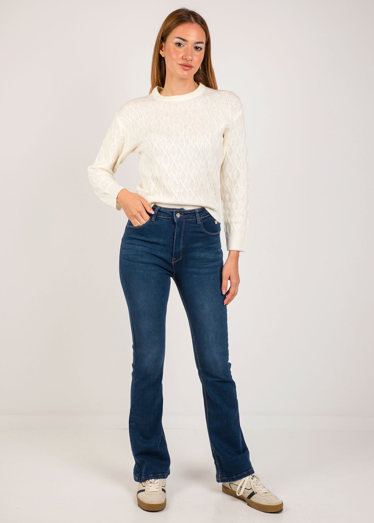 Παντελόνι ντένιμ με φαρδύ μπατζάκι, τσέπες στα πλάγια και πίσω και κλείσιμο μπροστά με φερμουάρ και κουμπί.