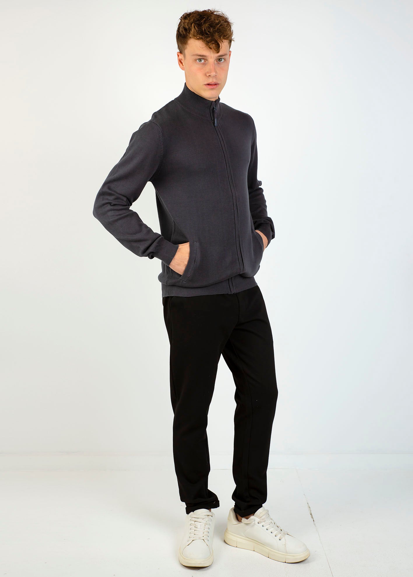 Πλεκτή ζακέτα μακρυμάνικη, με ελαστική μανσέτα και τσέπες στα πλάγια. Ριπ τελείωμα και κλείσιμο με φερμουάρ μπροστά.