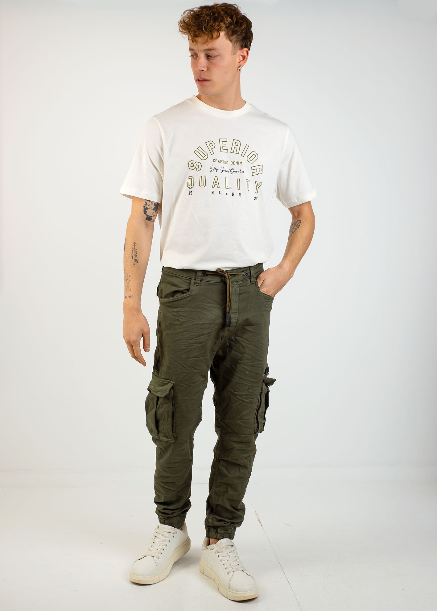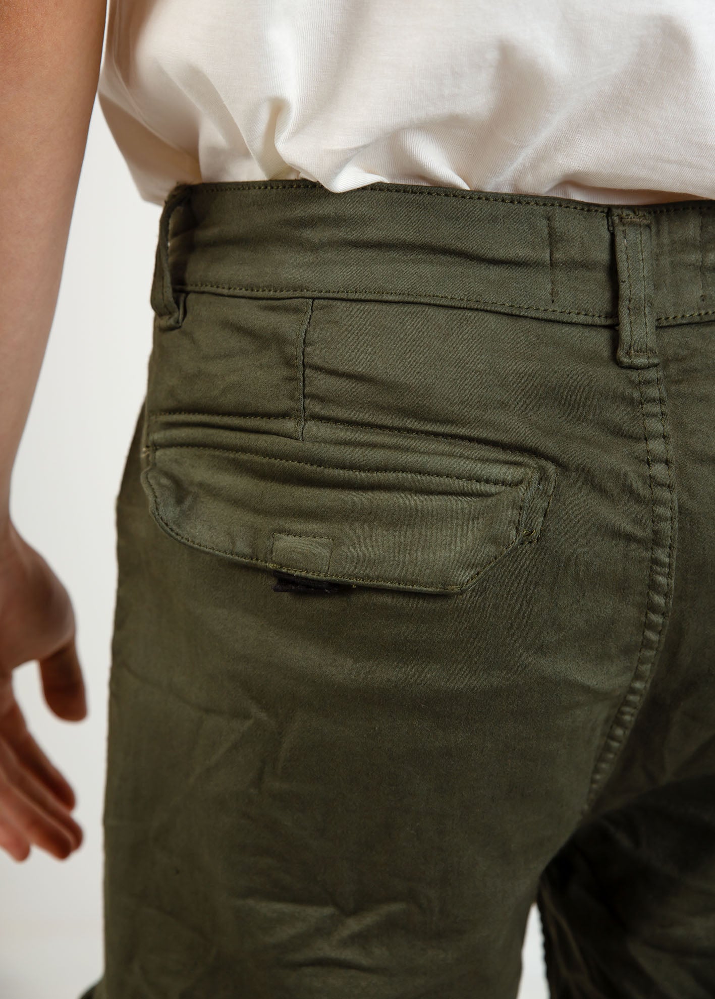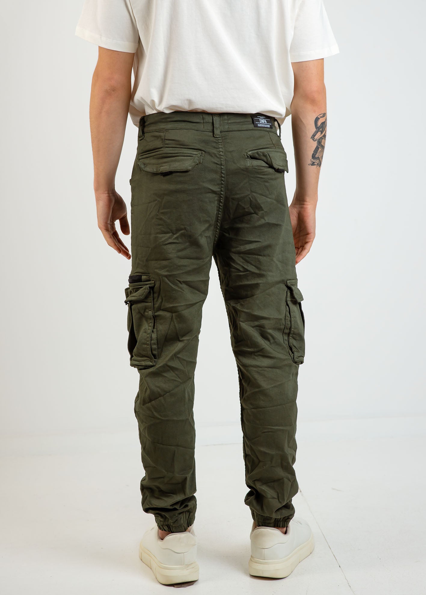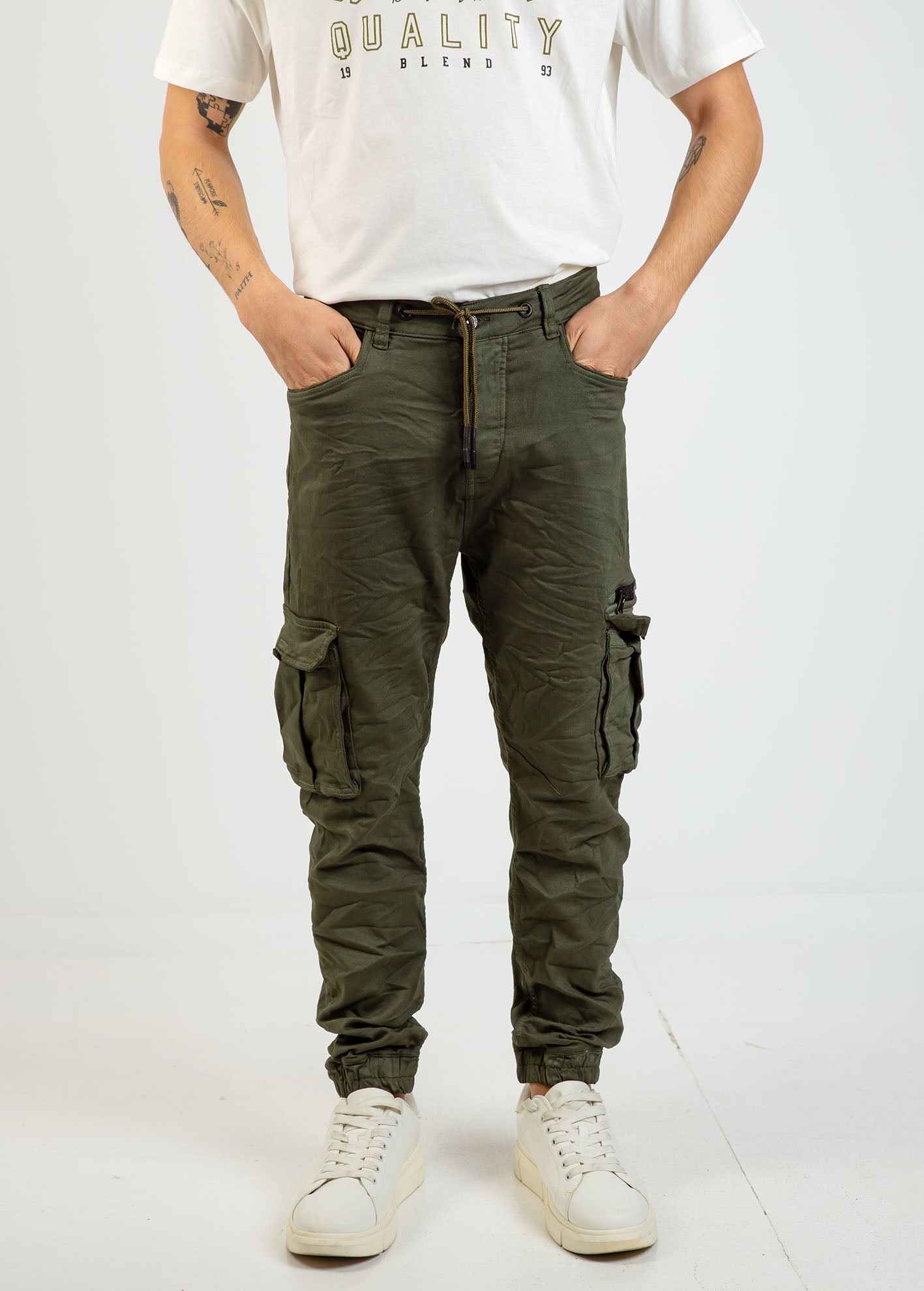 Παντελόνι cargo από ελαστικό ύφασμα, με τσέπες στα πλάγια και μπροστά, ελαστική μέση και ελαστικό τελείωμα.
