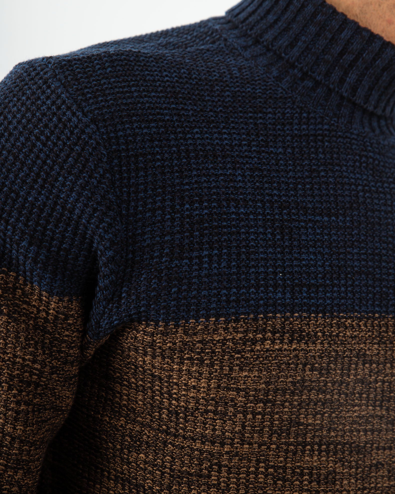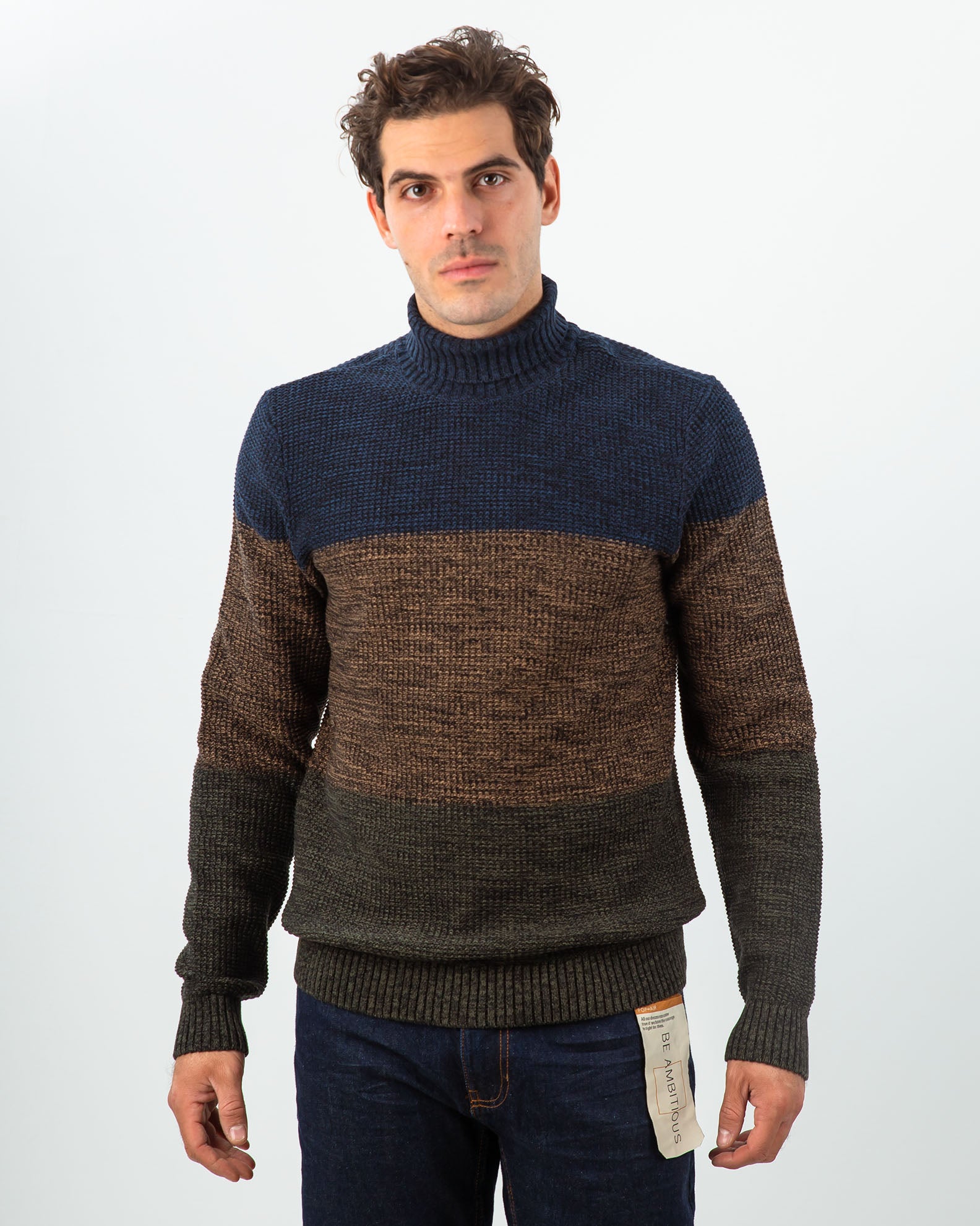Πλεκτό πουλόβερ τρίχρωμο με όρθιο γιακά και μακρύ μανίκι.