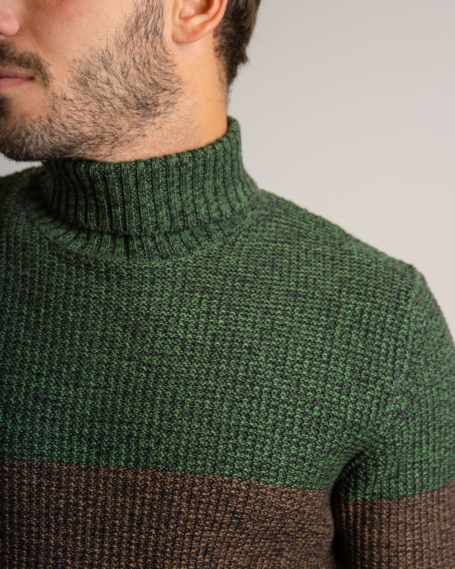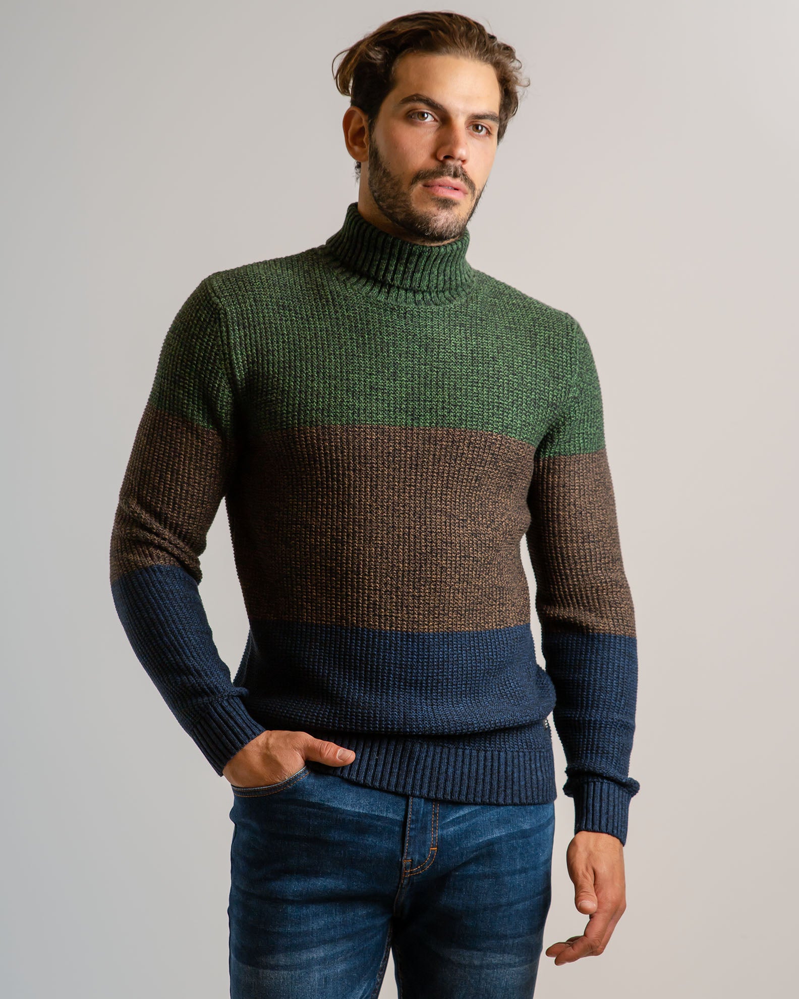 Τρίχρωμο πουλόβερ με σχέδιο πλέξης, όρθιο γιακά και μακρύ μανίκι.
