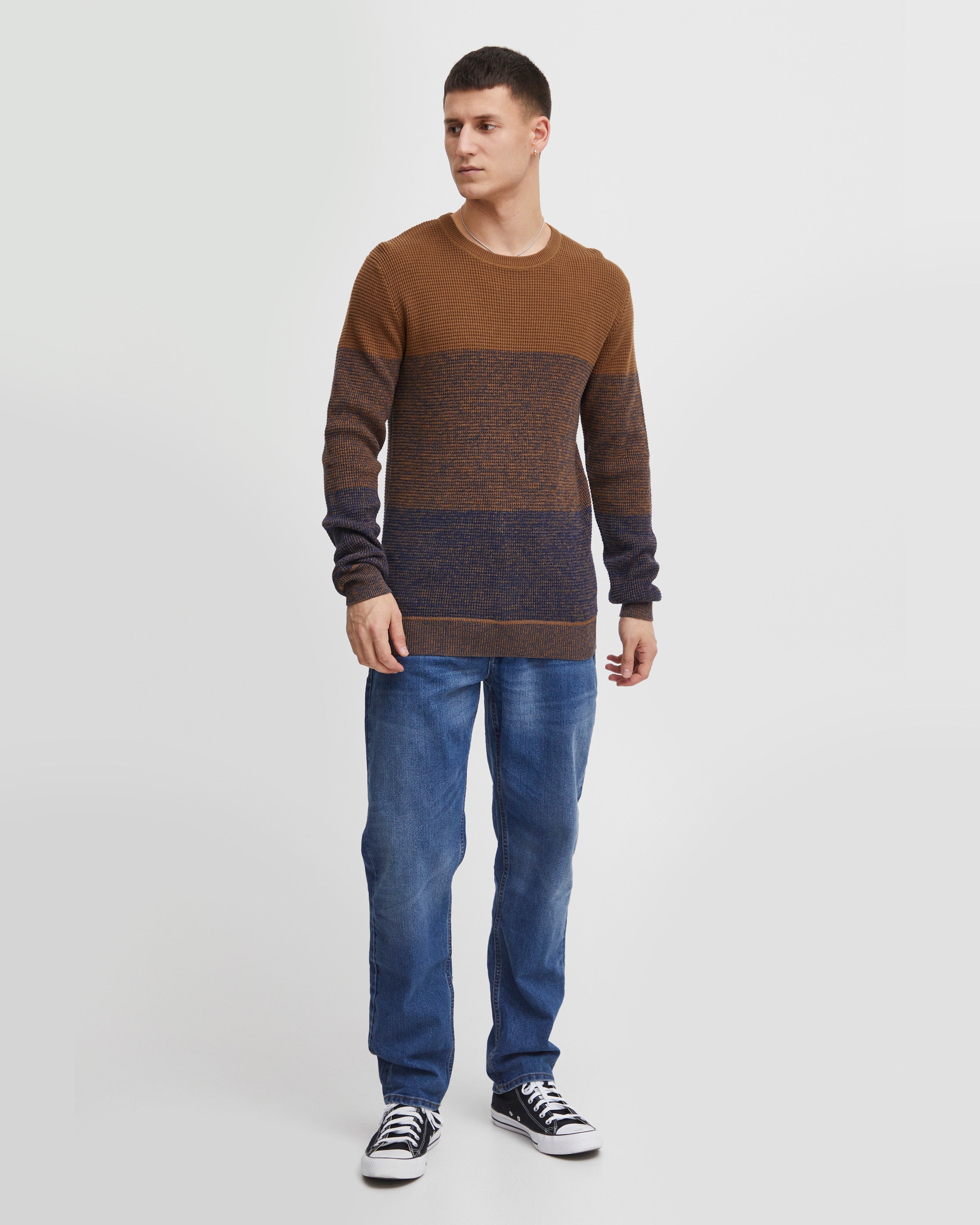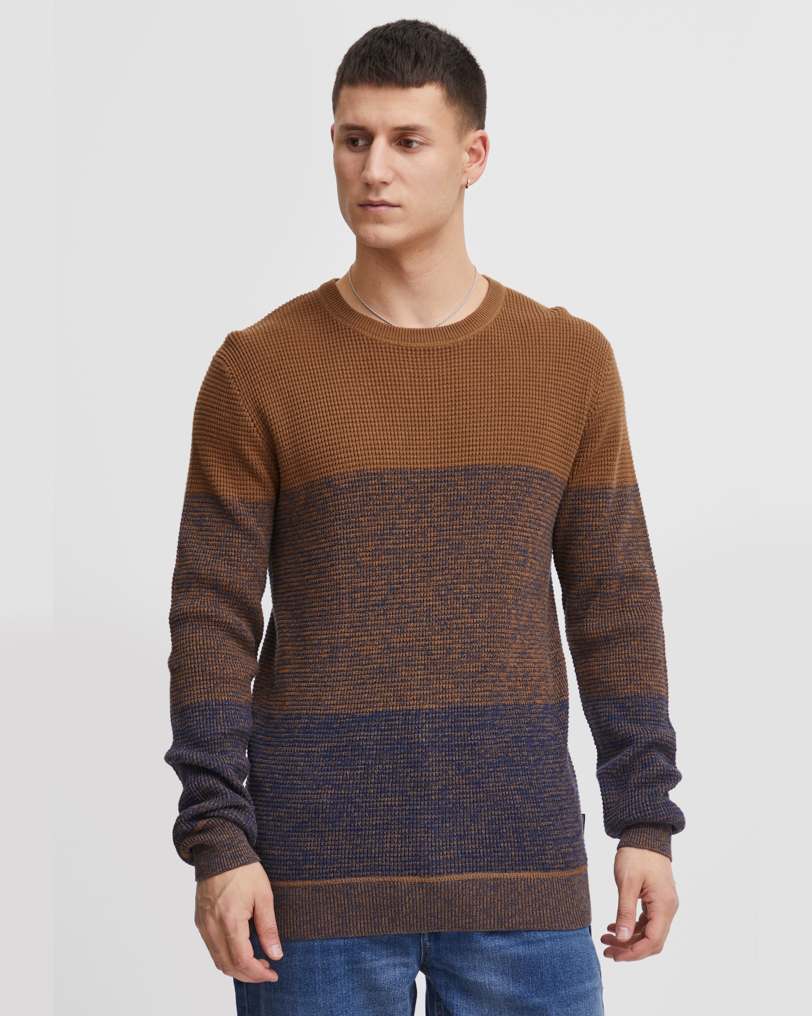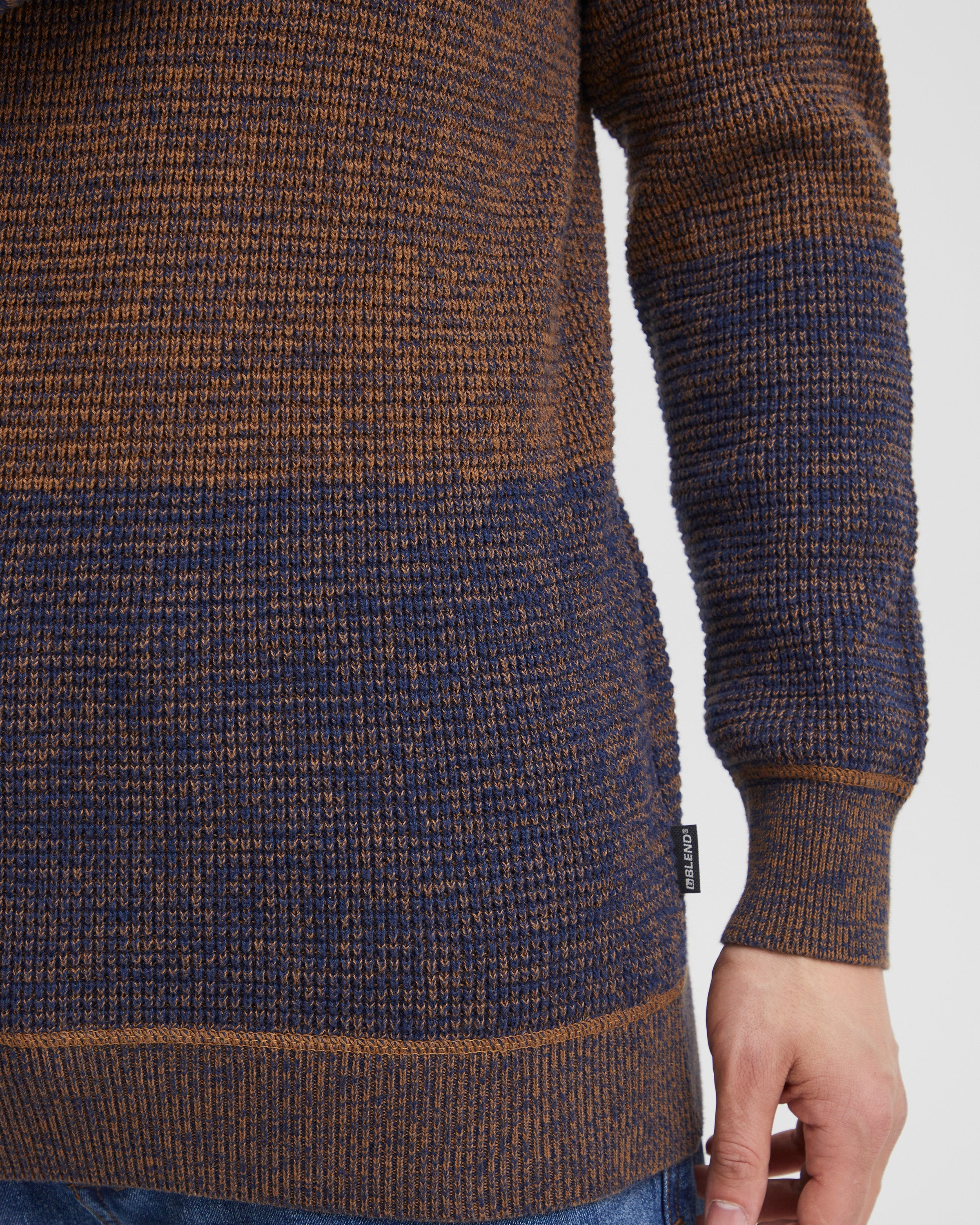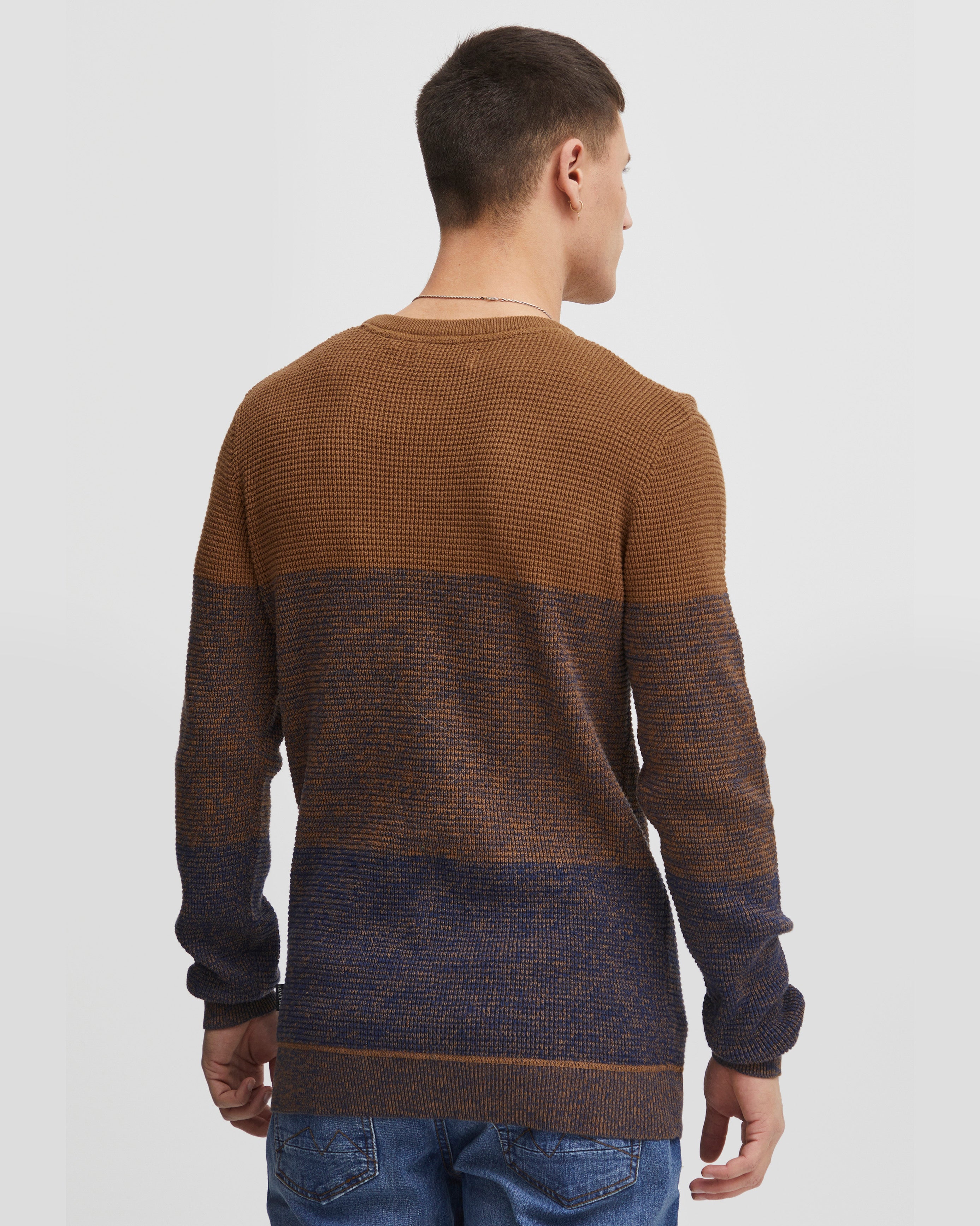 Πλεκτό πουλόβερ τρίχρωμο με σχέδιο πλέξης, μακρύ μανίκι και στρογγυλή λαιμόκοψη.