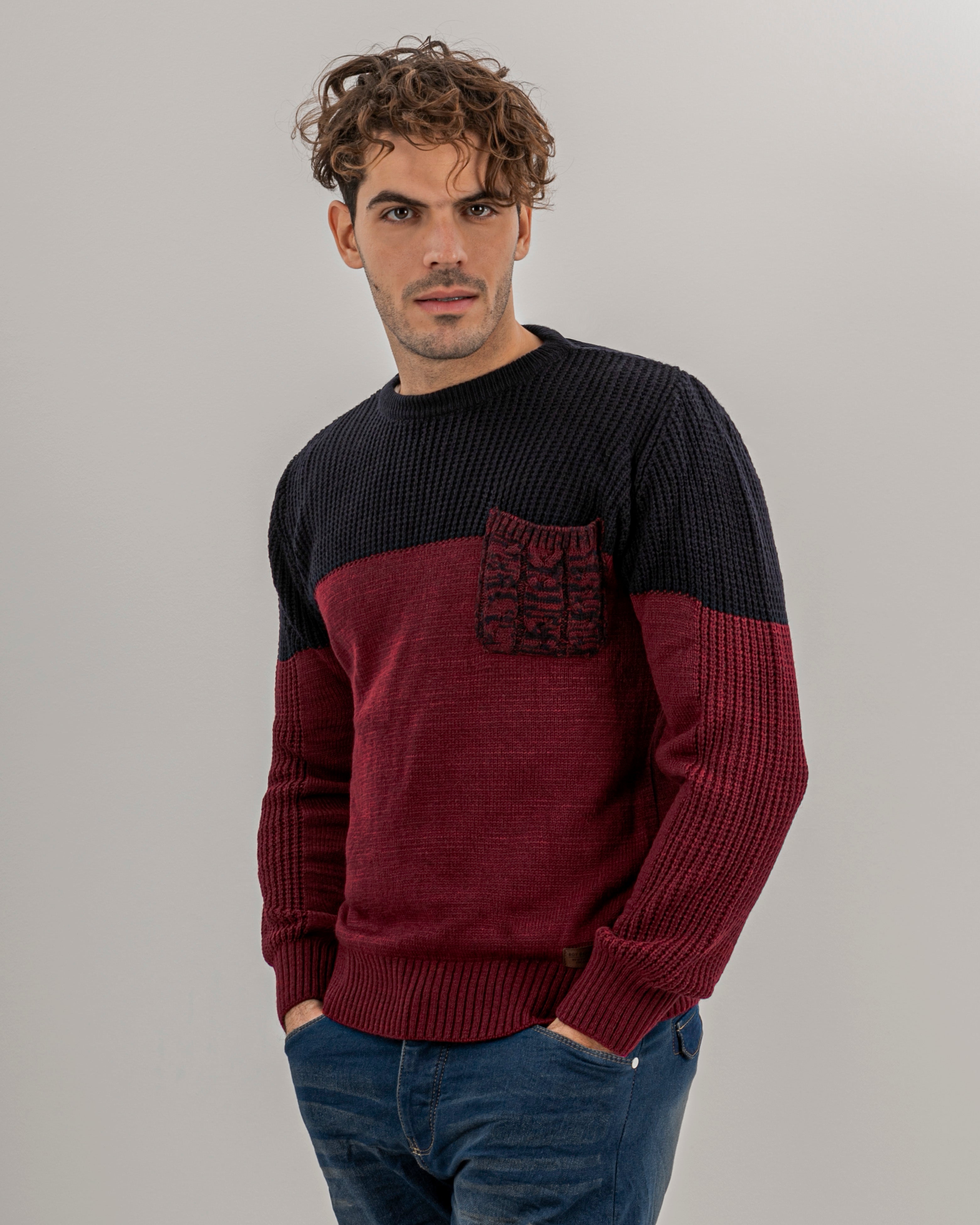 Πουλόβερ δίχρωμο με σχέδιο πλέξης, μακρύ μανίκι, στρογγυλή λαιμόκοψη και λεπτομέρεια με τσέπη στο στήθος.