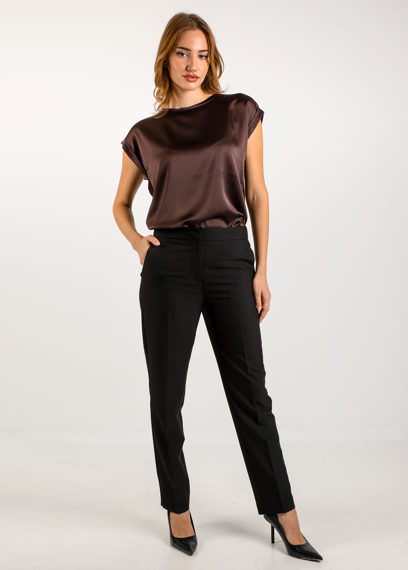 Υφασμάτινο ψηλόμεσο παντελόνι με ίσιο μπατζάκι, ελαστική μέση στο πίσω μέρος και τσέπες στα πλάγια. Κλείσιμο μπροστά με φερμουάρ.