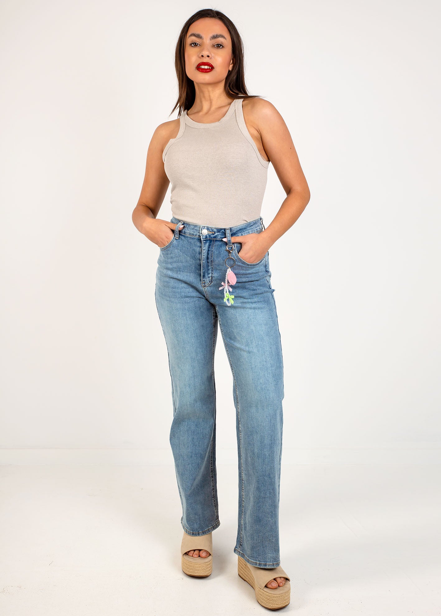 Ψηλόμεσο ντένιμ παντελόνι με φαρδύ μπατζάκι, τσέπες στα πλάγια και πίσω και λεπτομέρεια με διακοσμητικό. Κλείσιμο μπροστά με φερμουάρ.