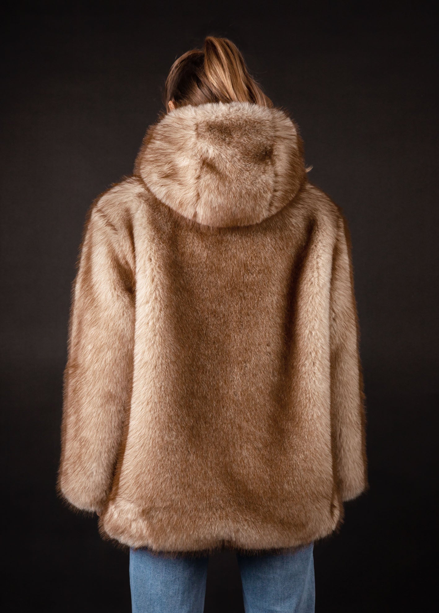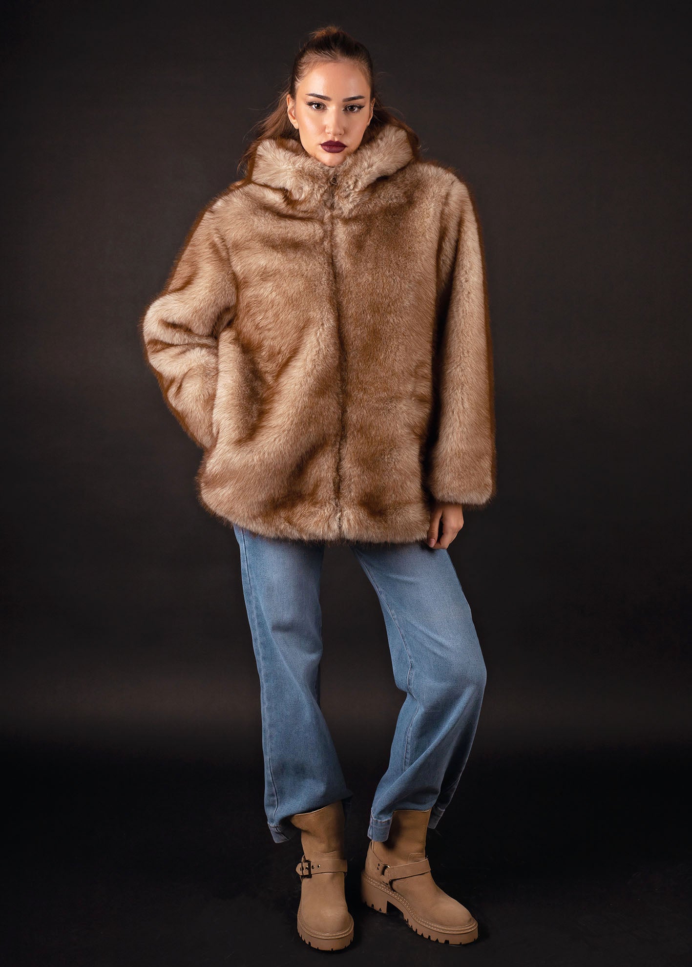 Τζάκετ σε φαρδιά΄γραμμή από οικολογική συνθετική γούνα με μακρύ μανίκι, τσέπες στα πλάγια, κουκούλα και κλείσιμο με φερμουάρ μπροστά.