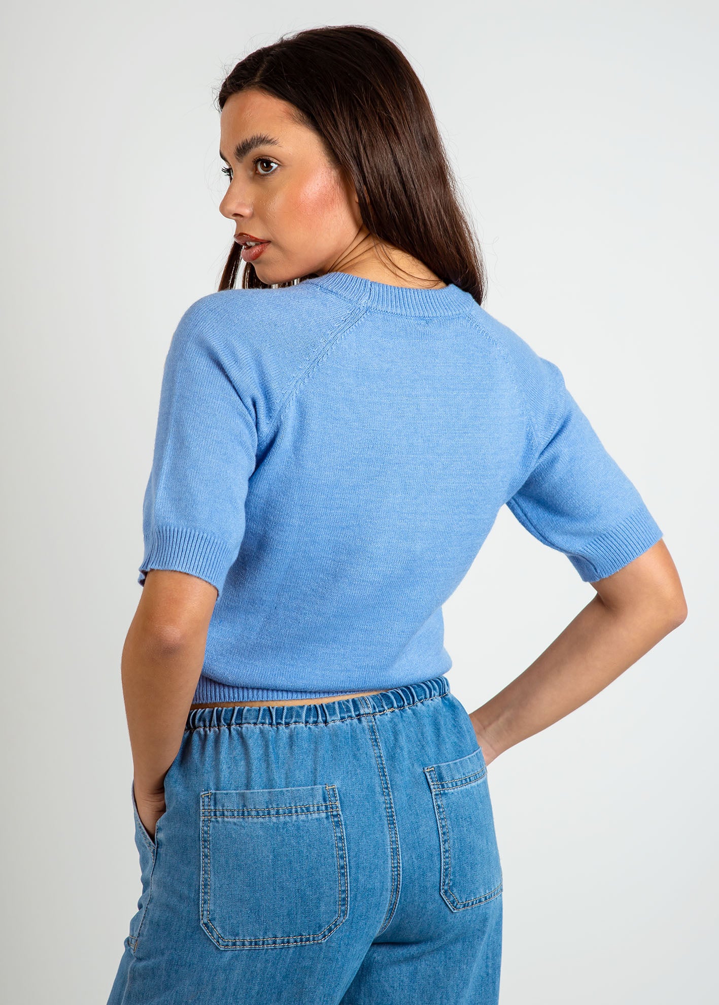 Κοντομάνικη νημάτινη μπλούζα με στρογγυλή λαιμόκοψη και σχέδιο. Τελείωμα ριπ