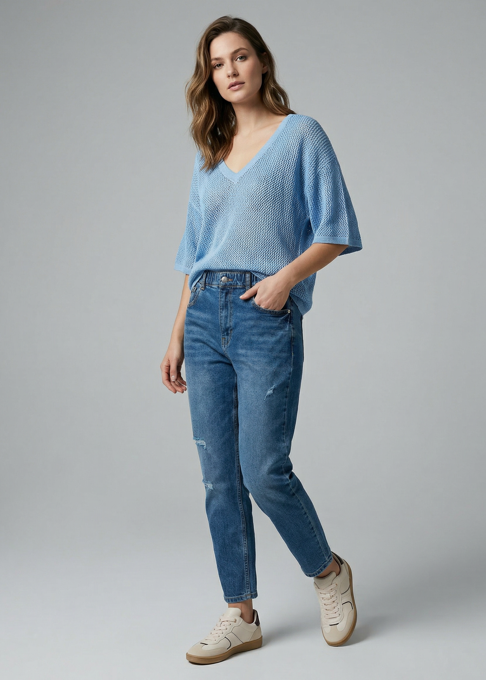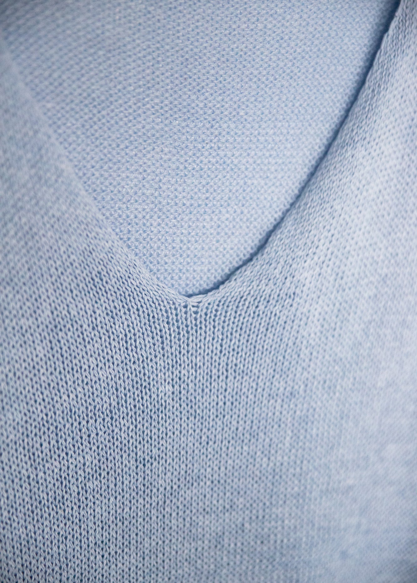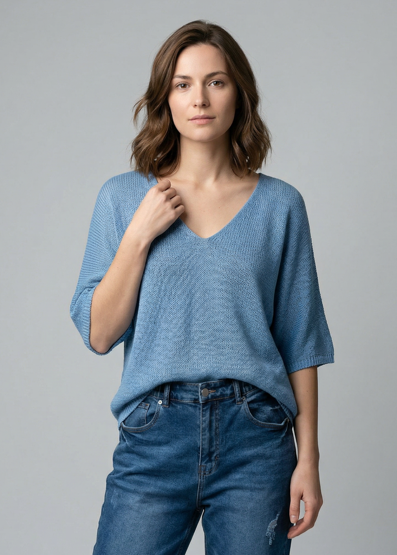 Ελαφριά πλεκτή μπλούζα ριχτή με φαρδύ μανίκι 3/4 και V ντεκολτέ.