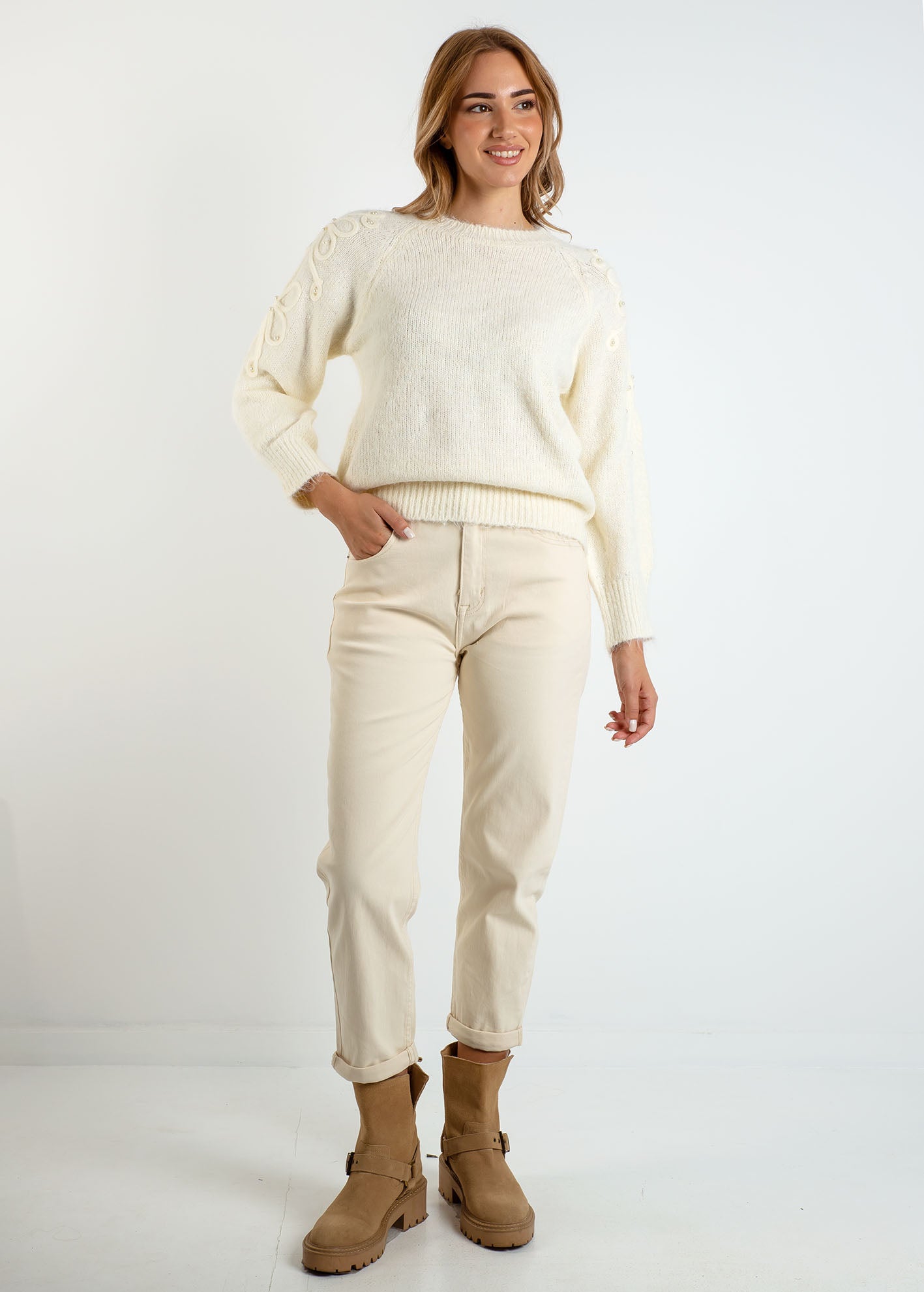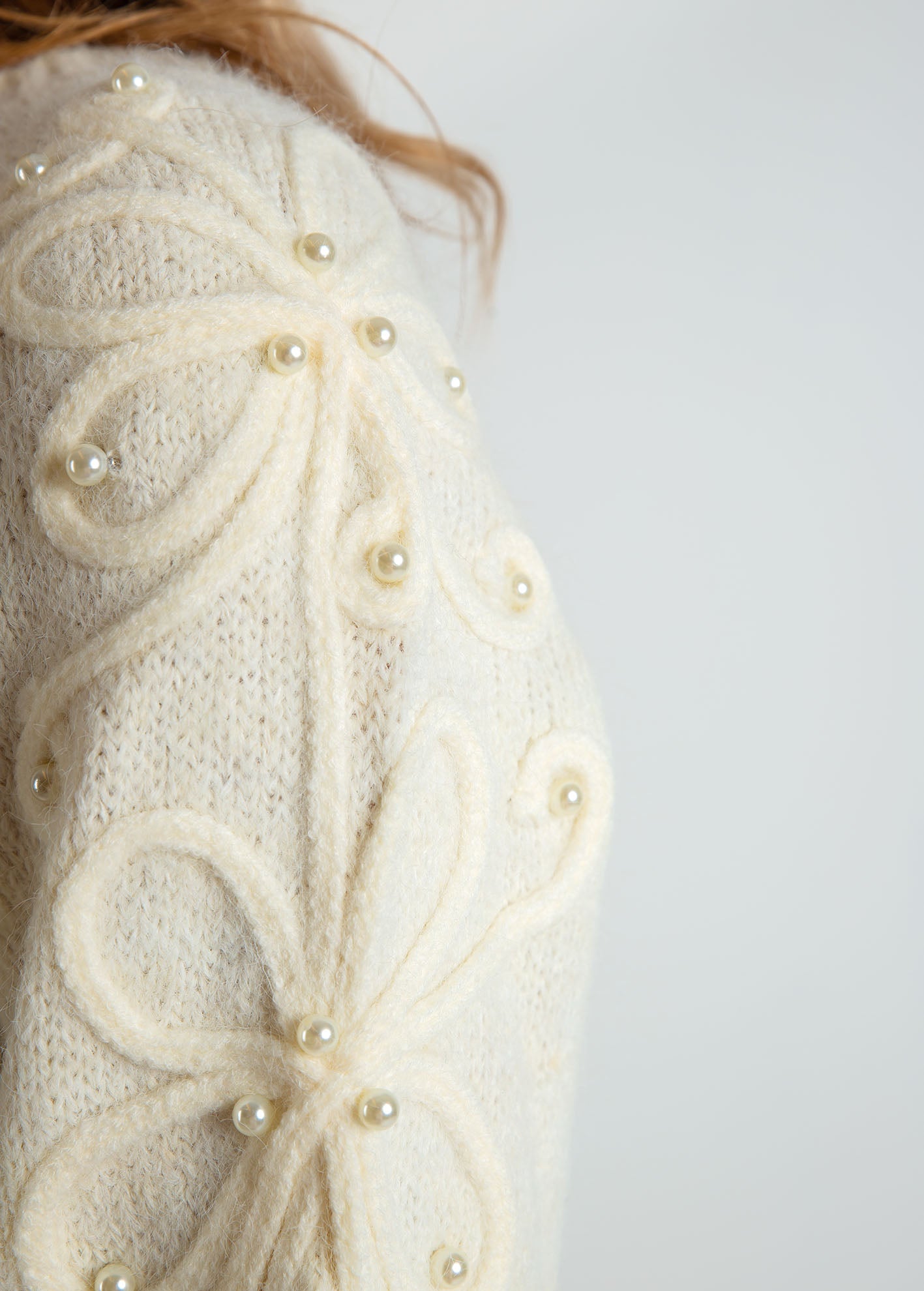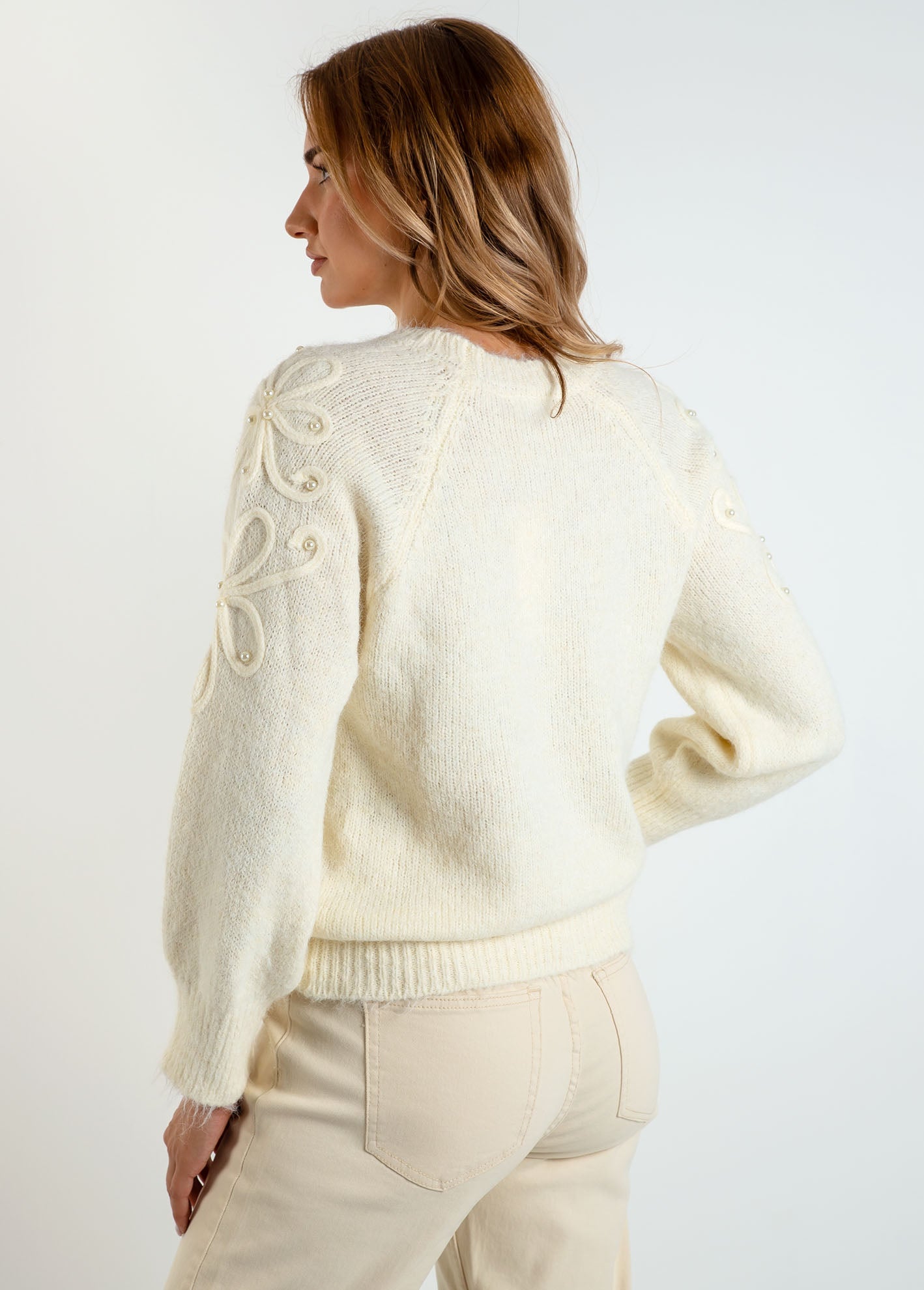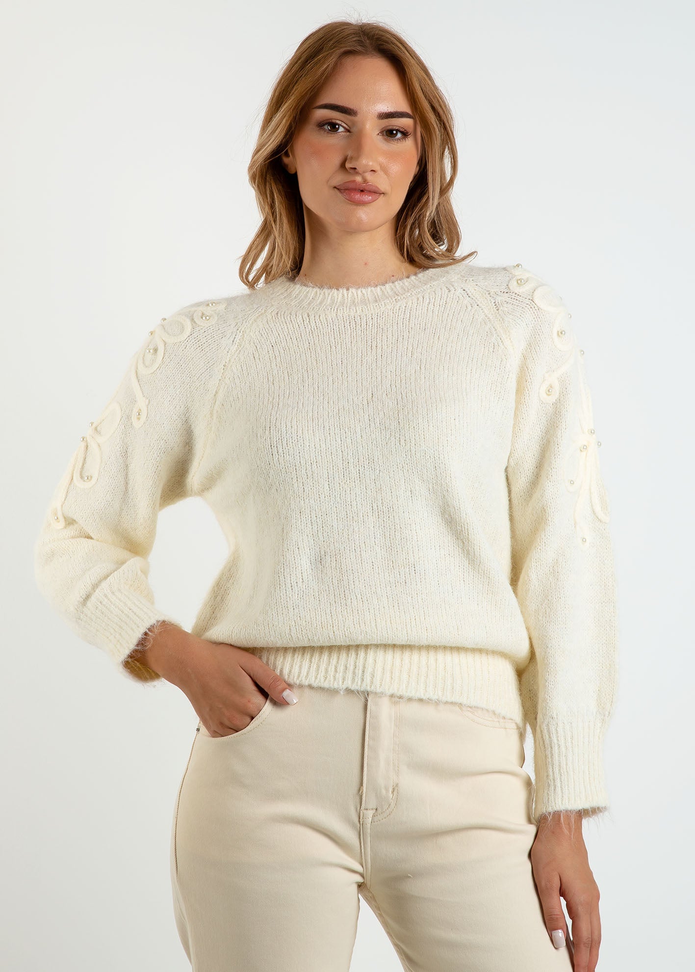Πλεκτό με σχέδιο πλέξης, μακρύ μανίκι διακοσμημένο με πέρλες και στρογγυλή λαιμόκοψη. Λεπτομέρεια με ριπ τελείωμα.