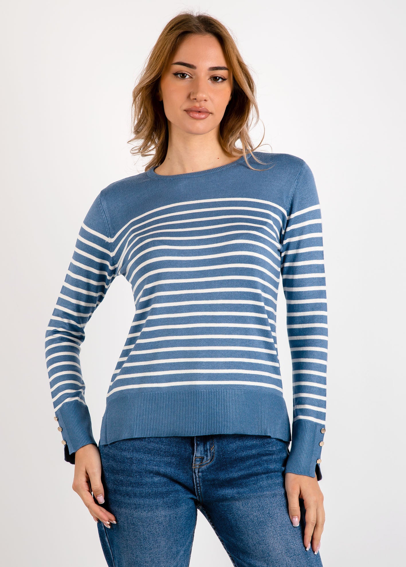 Ελαφρύ πλεκτό με ριγέ σχέδιο, μακρύ μανίκι και στρογγυλή λαιμόκοψη. Λεπτομέρεια με ανοίγματα στα πλάγια και διακοσμητικά χρυσά κουμπιά στο μανίκι.