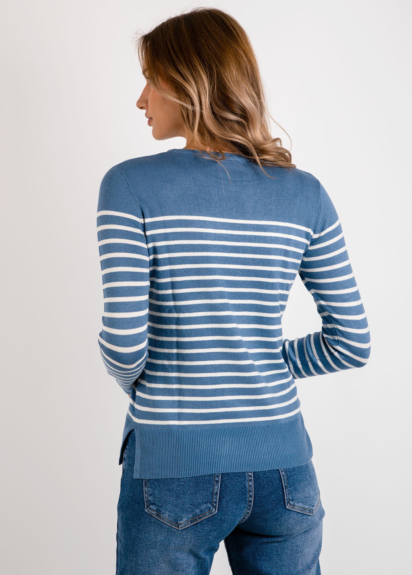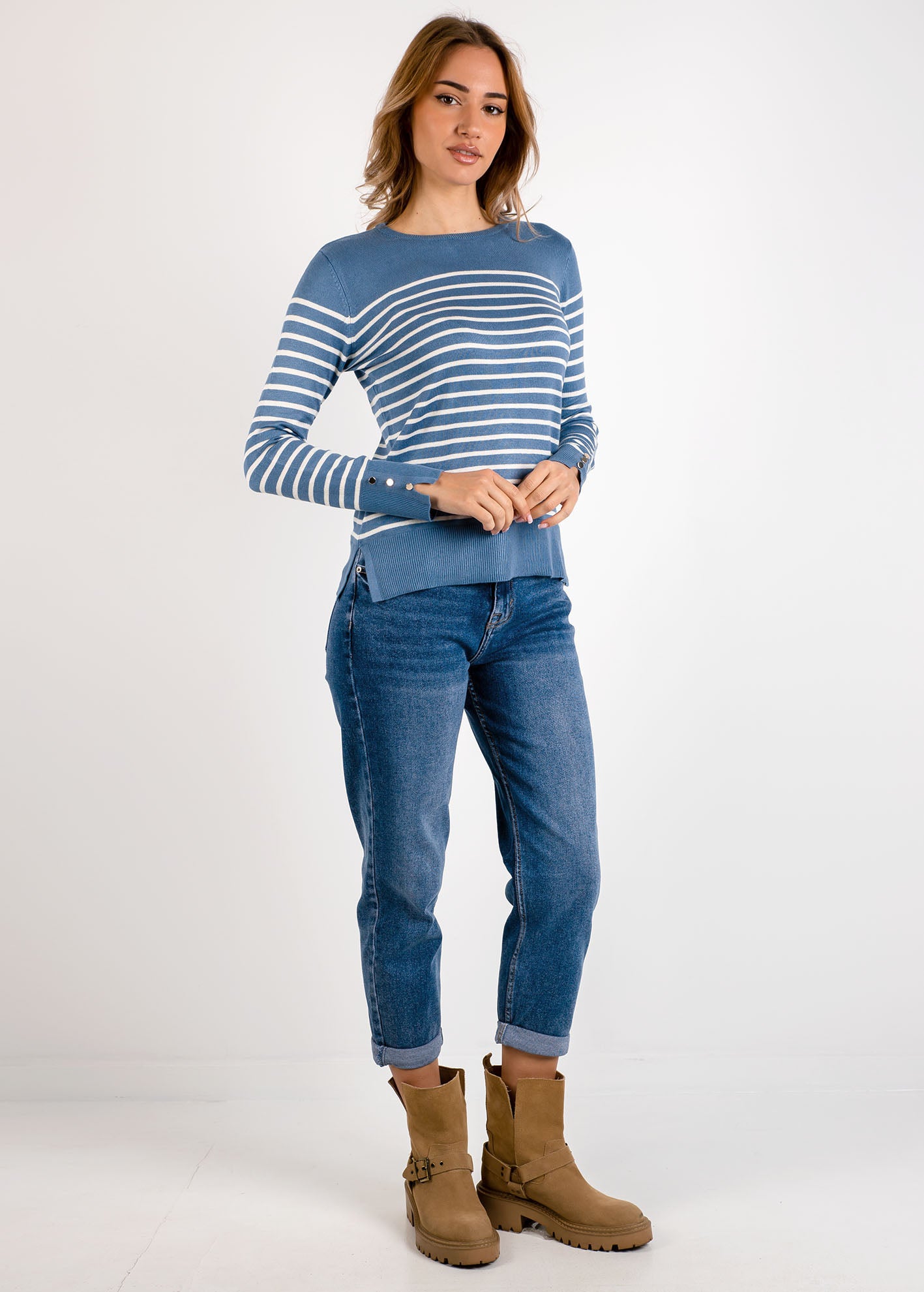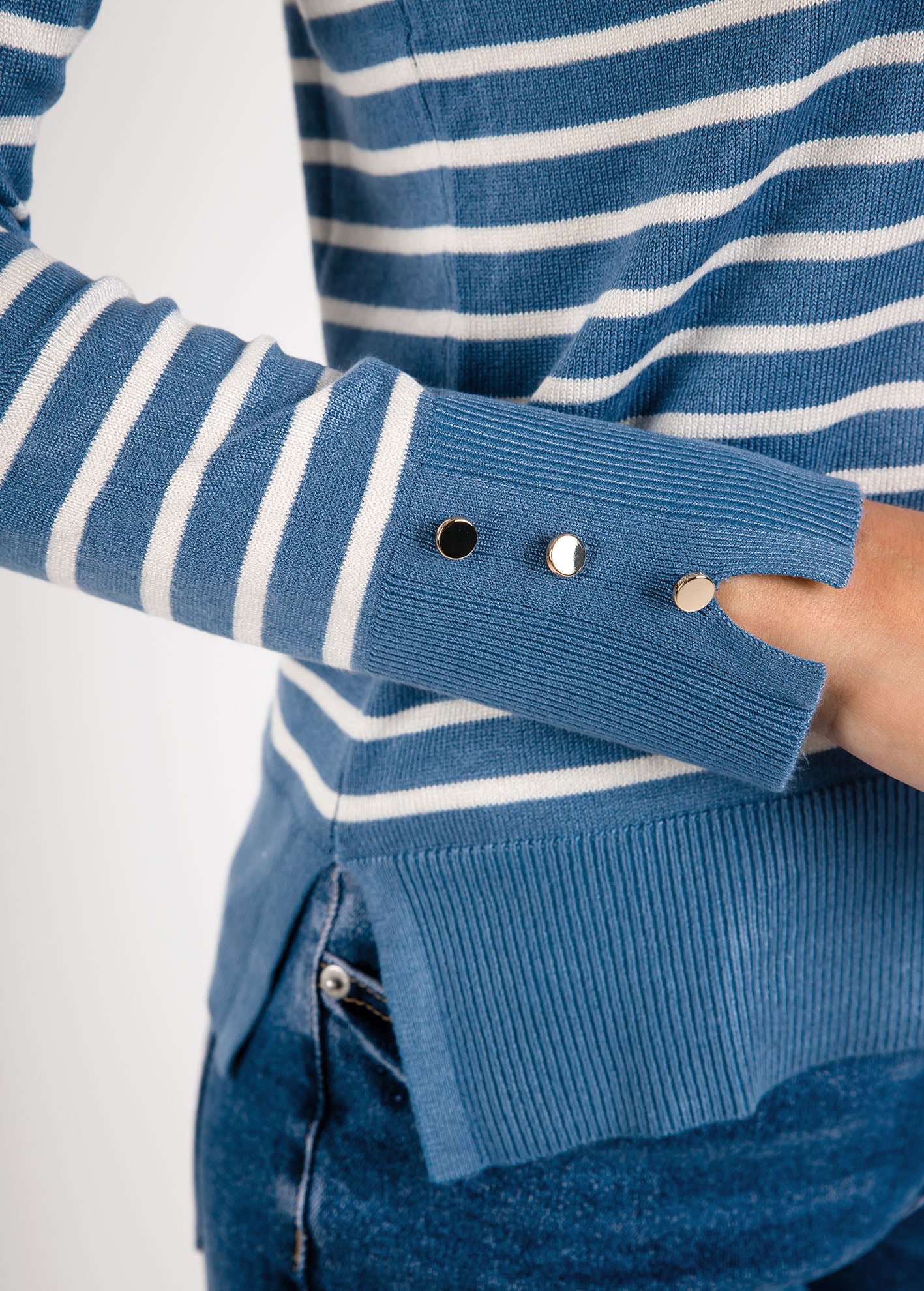 Ριγέ πλεκτό με ανοίγματα στα πλάγια και λεπτομέρεια κουμπιών στα μανίκια-DENIM