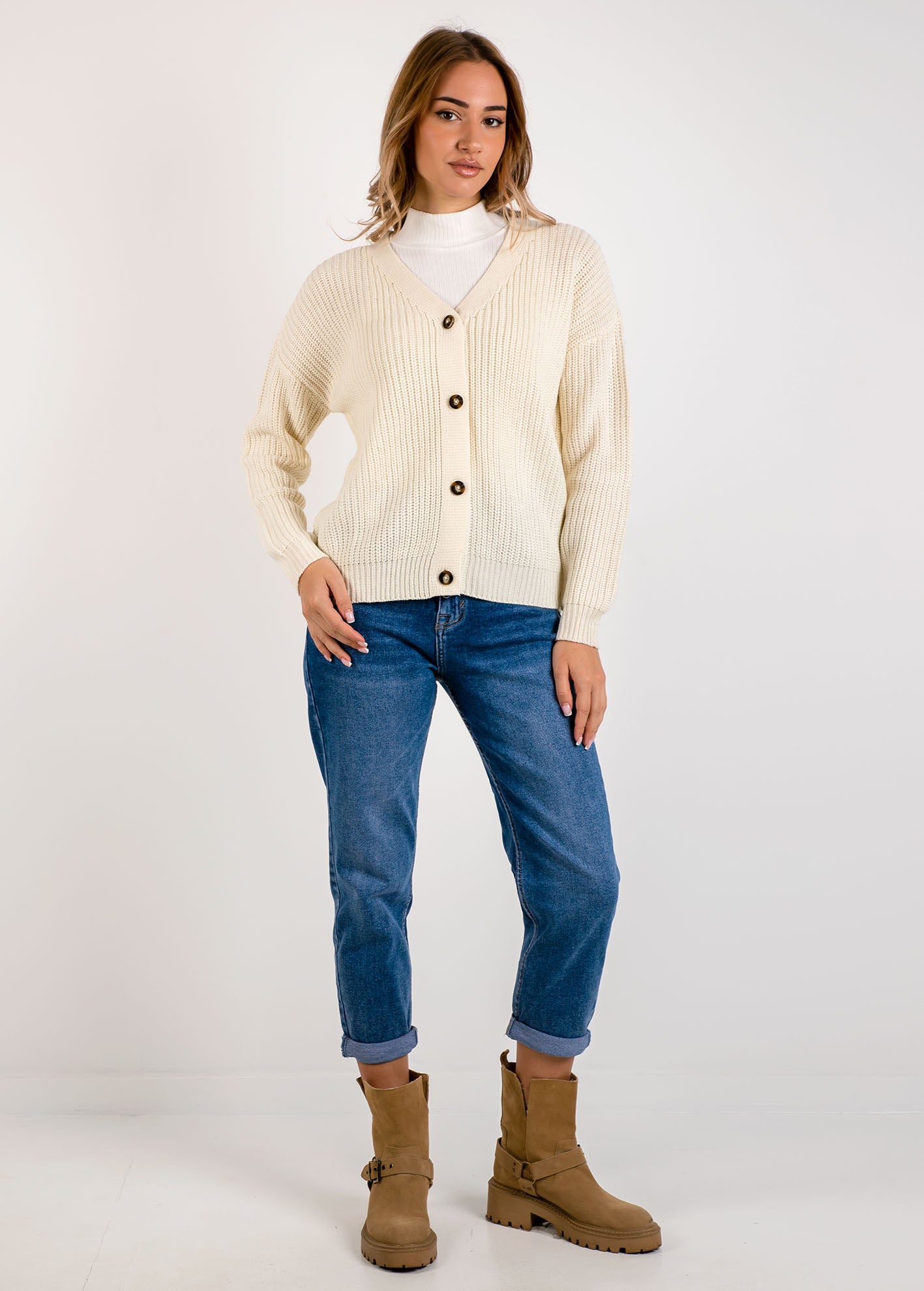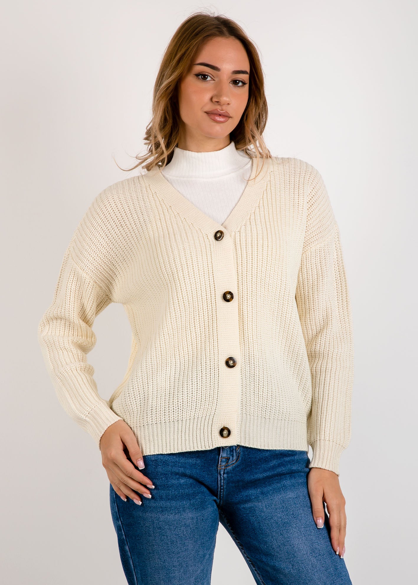 Ζακέτα πλεκτή με σχέδιο πλέξης, μακρύ μανίκι, V ντεκολτέ και κλείσιμο μπροστά με κουμπιά.