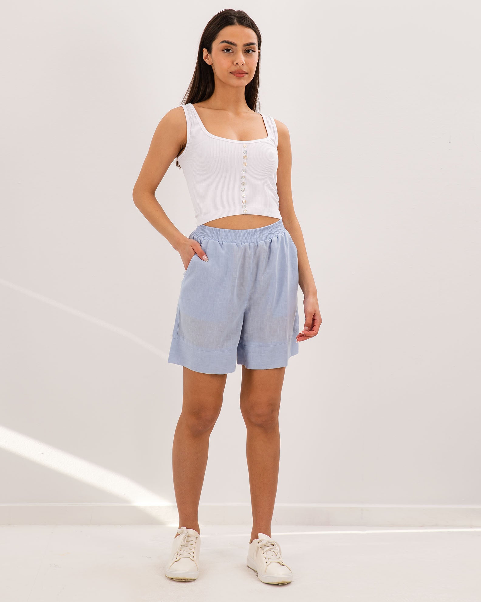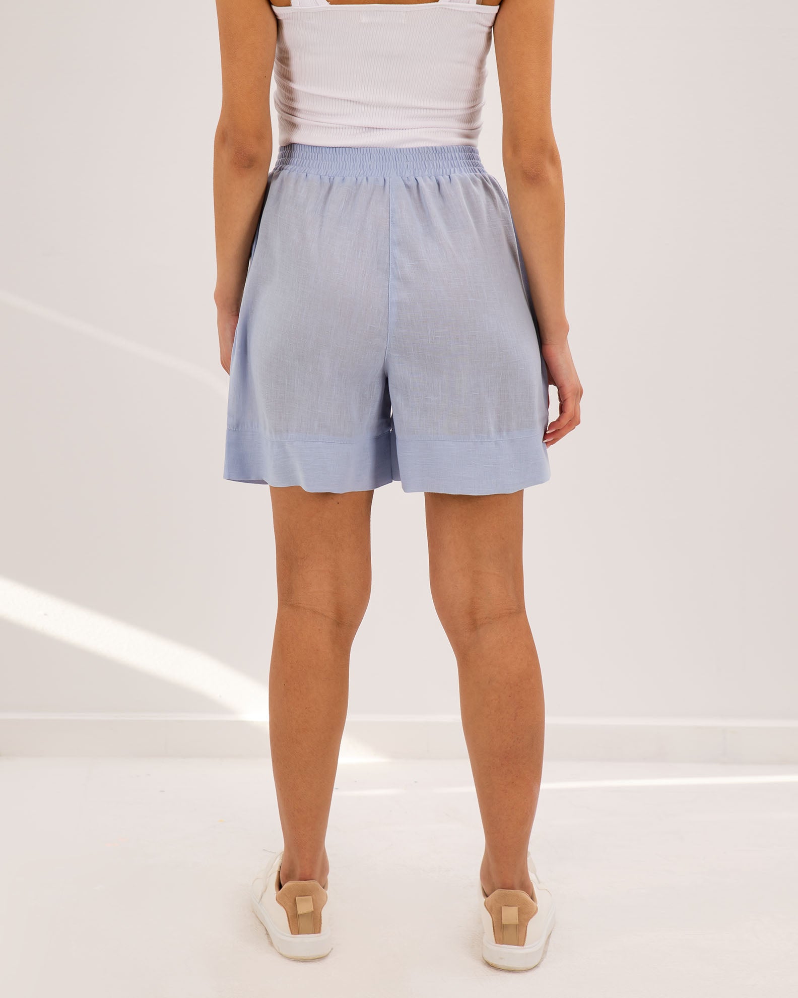 Σορτς βερμούδα όψη λινού, ψηλόμεσο, με ελαστική μέση και τσέπες στα πλάγια.