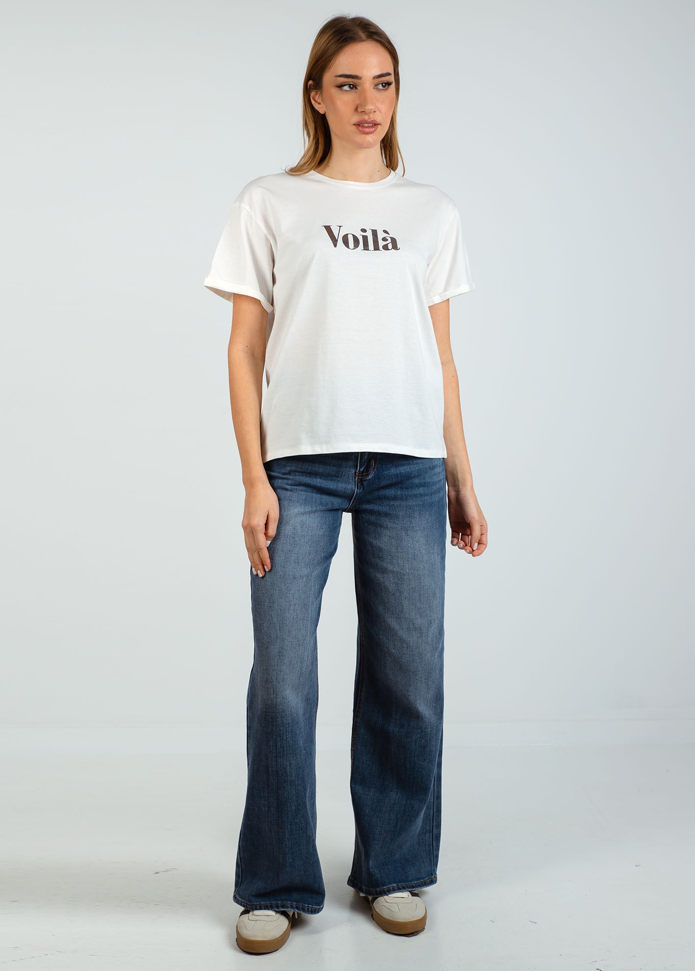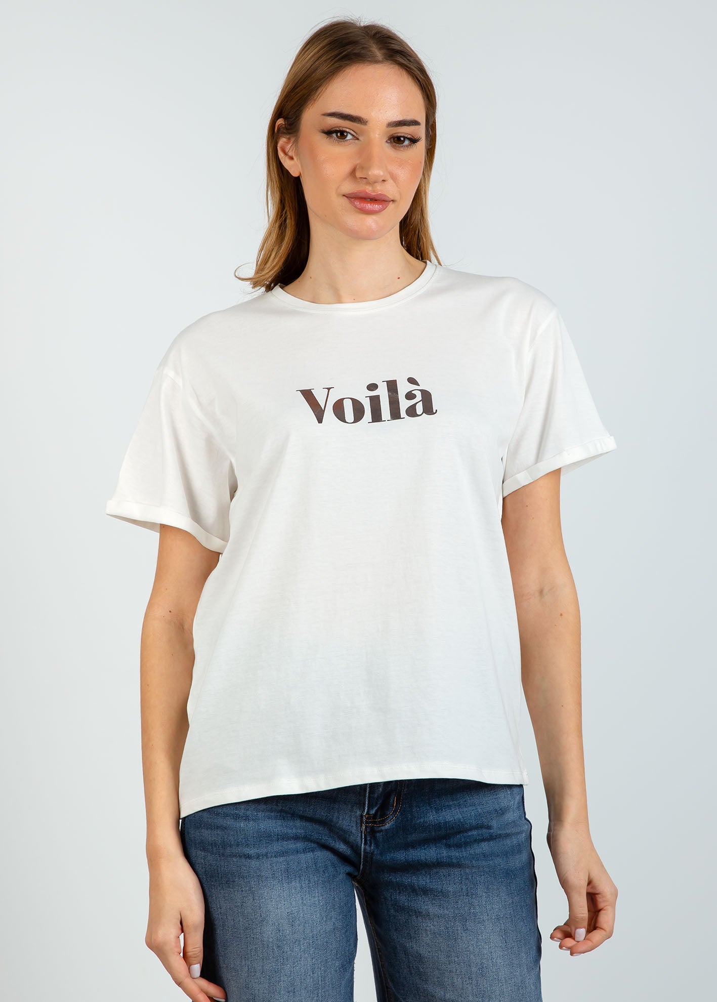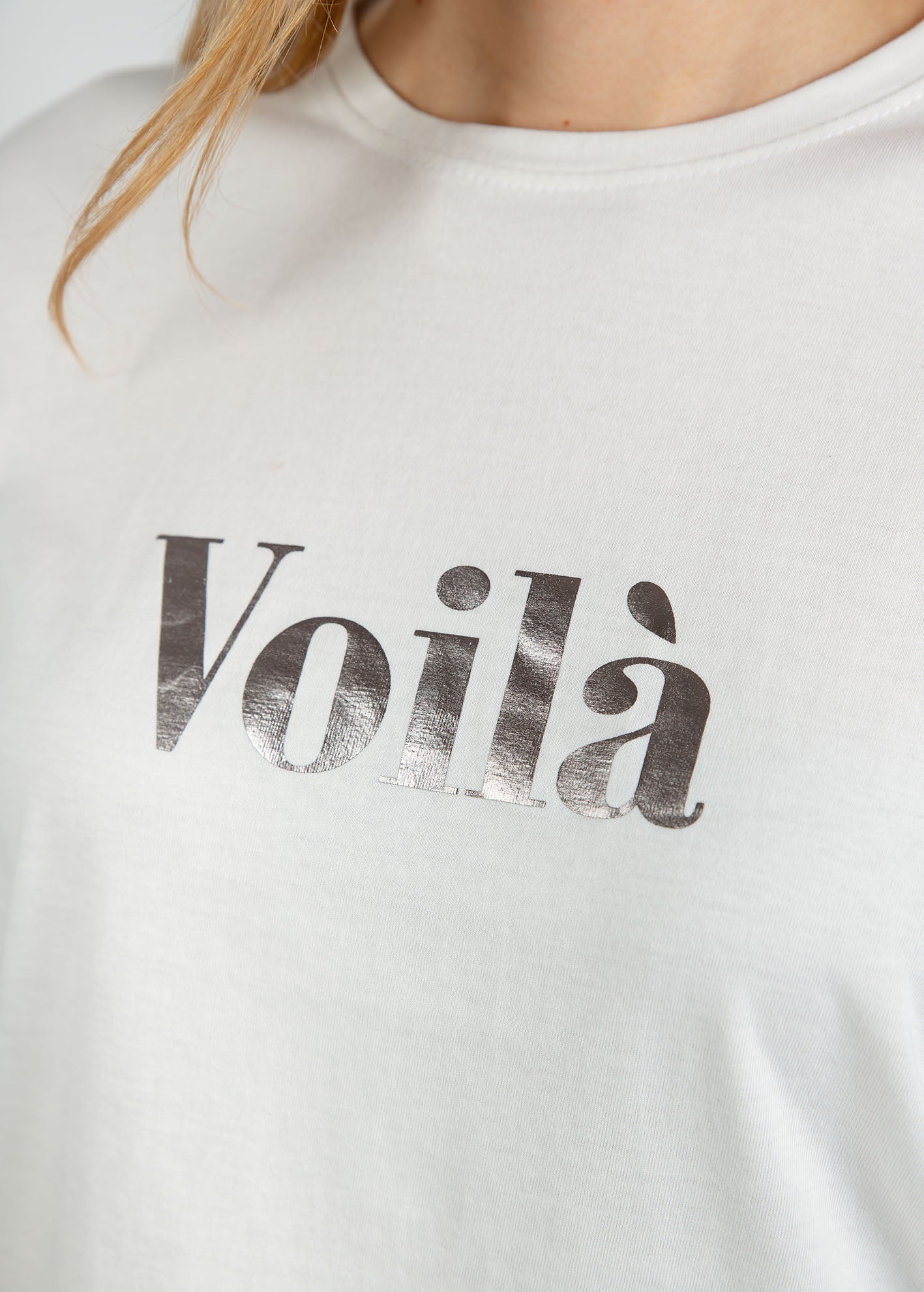 Γυναικεία κοντομάνικη μπλούζα με τύπωμα 'Voila'-OFFWHITE