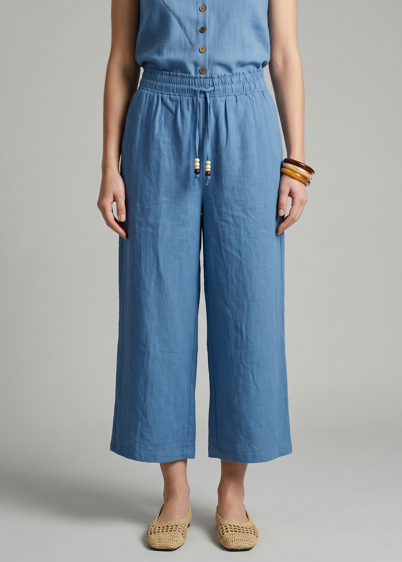 Παντελόνα culotte 7/8 όψη λινού, ψηλόμεση, σε χαλαρή γραμμή με τσέπες στο πλάι, ελαστική μέση και διακοσμητικά κορδόνια.