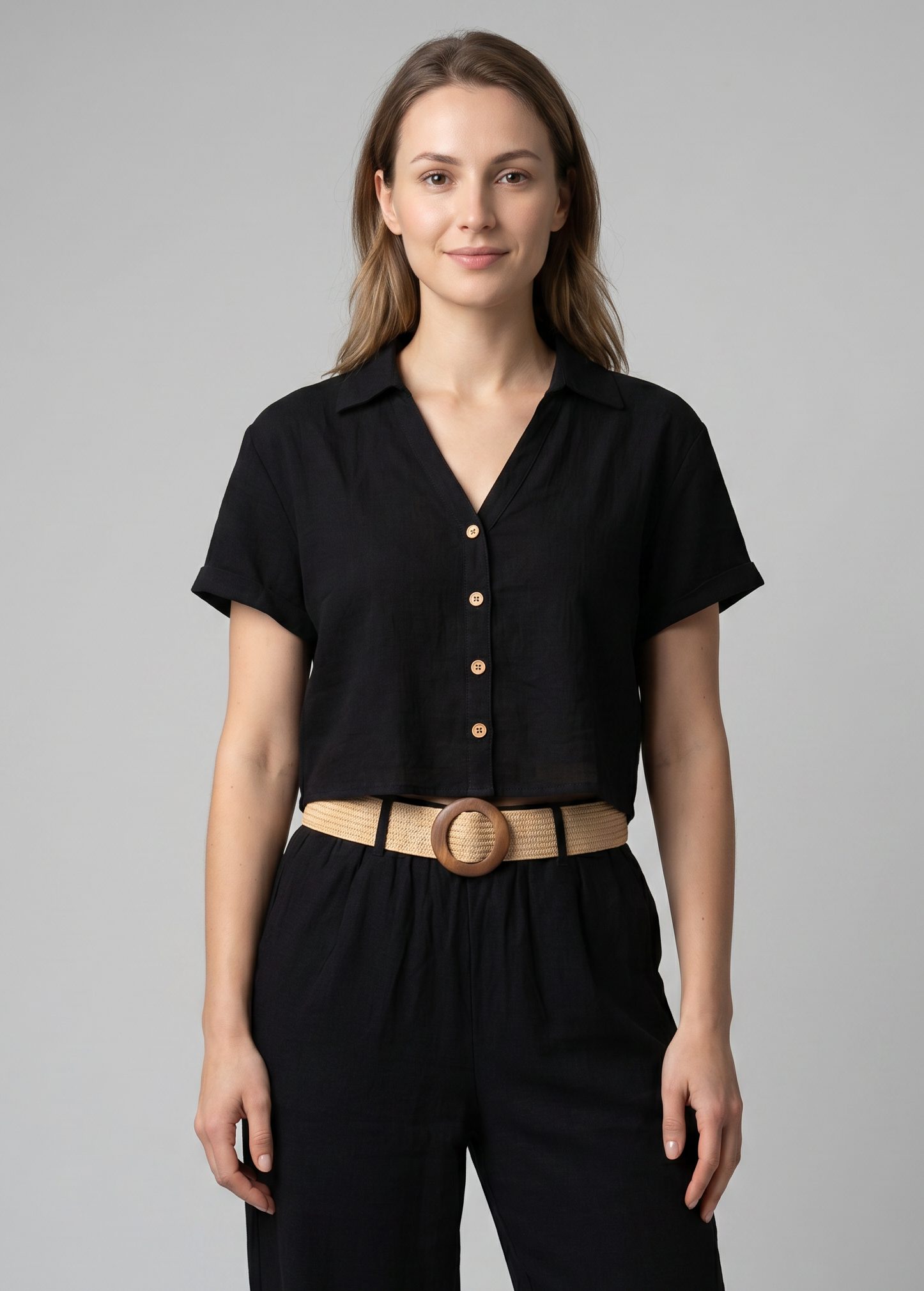 Πουκάμισο όψη λινού με κοντό μανίκι, γιακά, V ντεκολτέ και κλείσιμο μπροστά με κουμπιά.