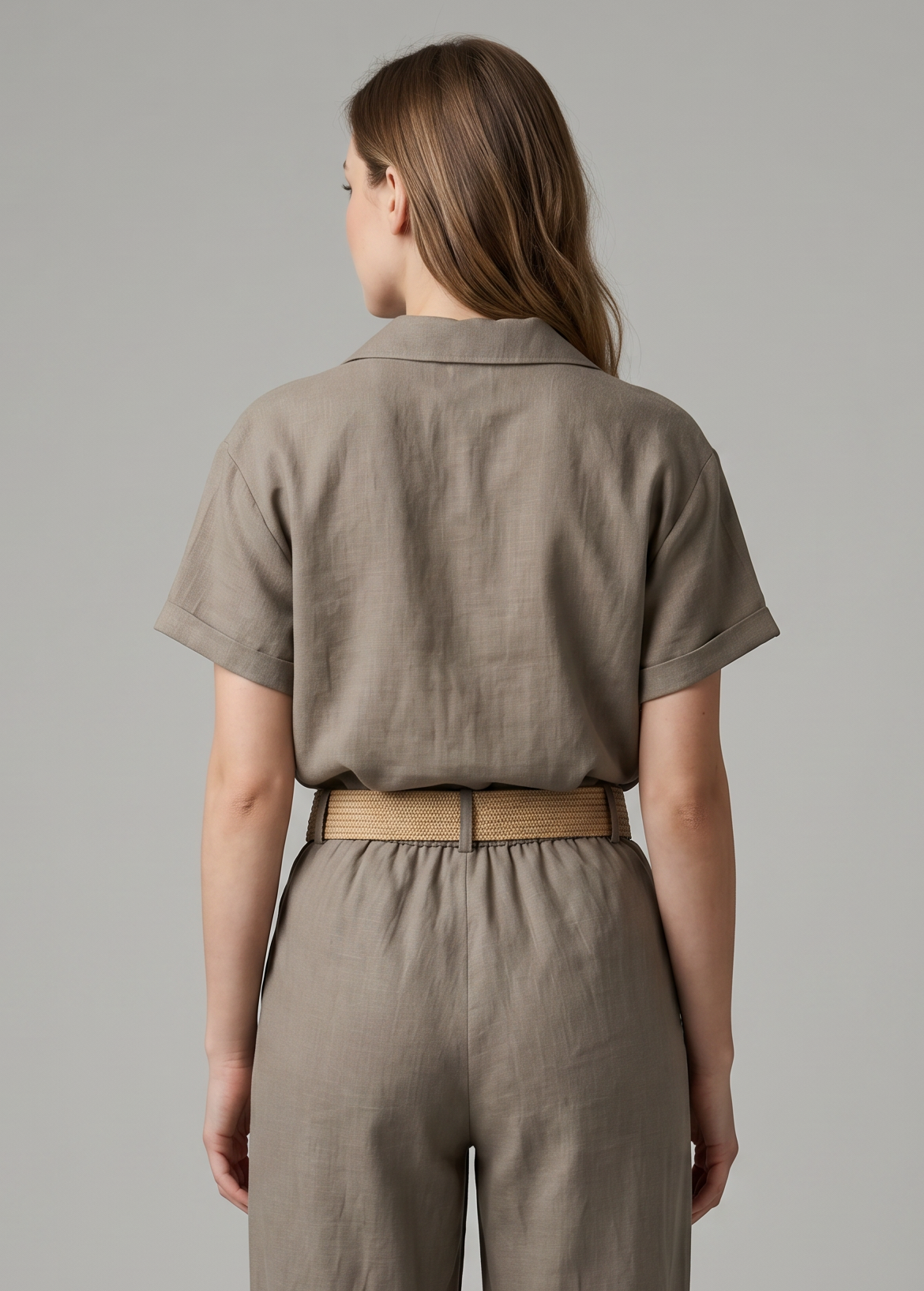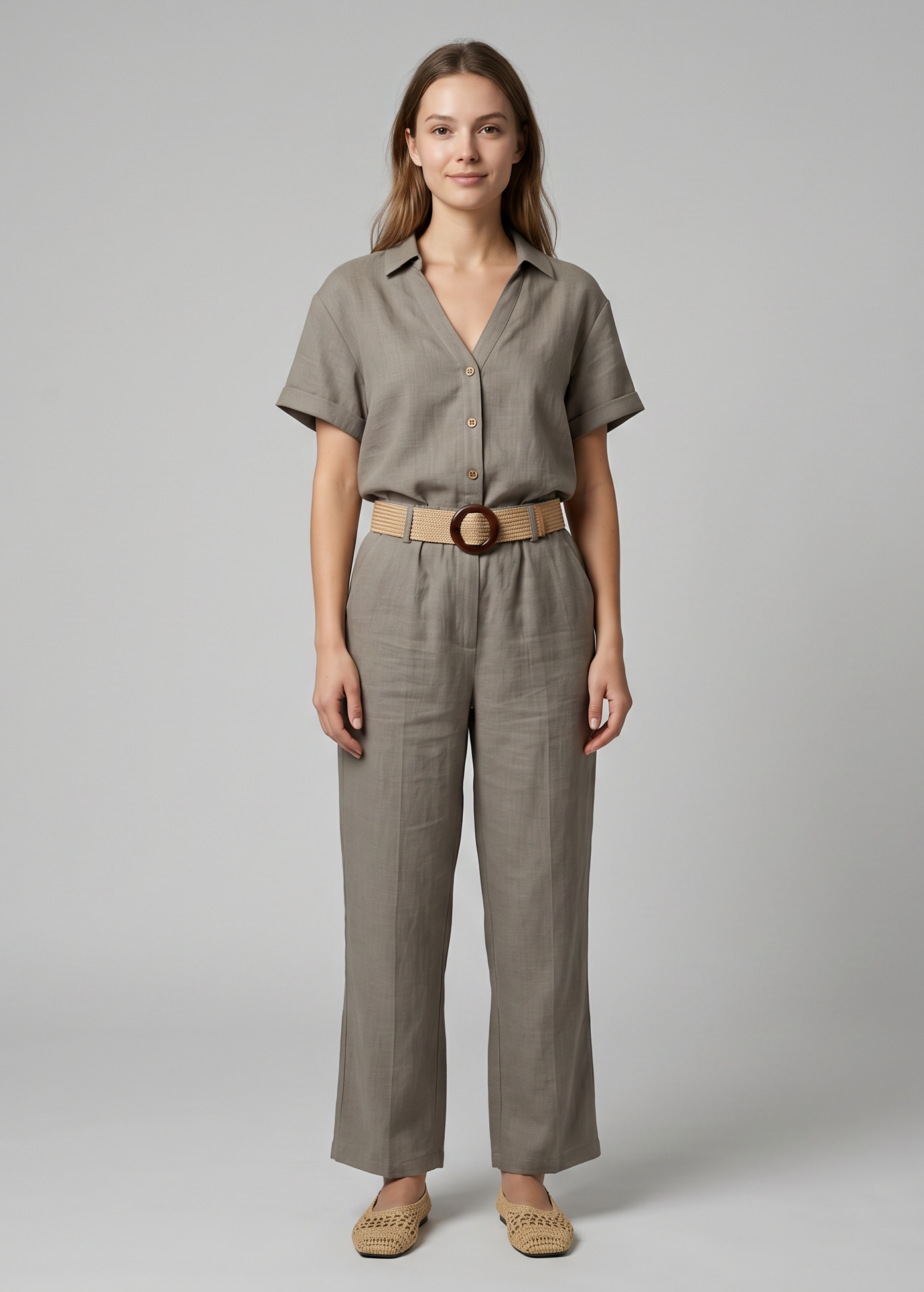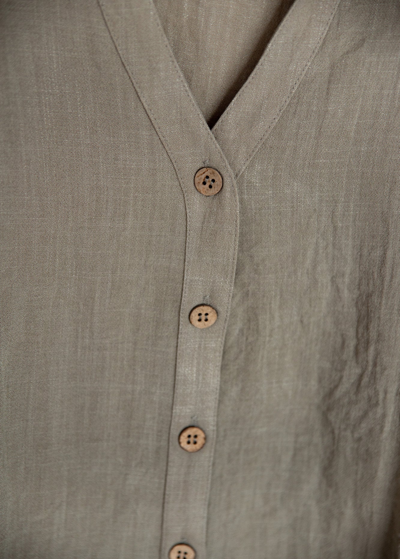 Πουκάμισο όψη λινού με κοντό μανίκι, γιακά, V ντεκολτέ και κλείσιμο μπροστά με κουμπιά.