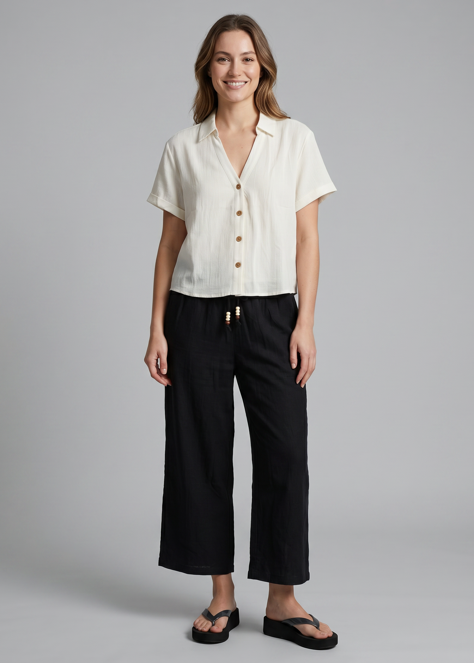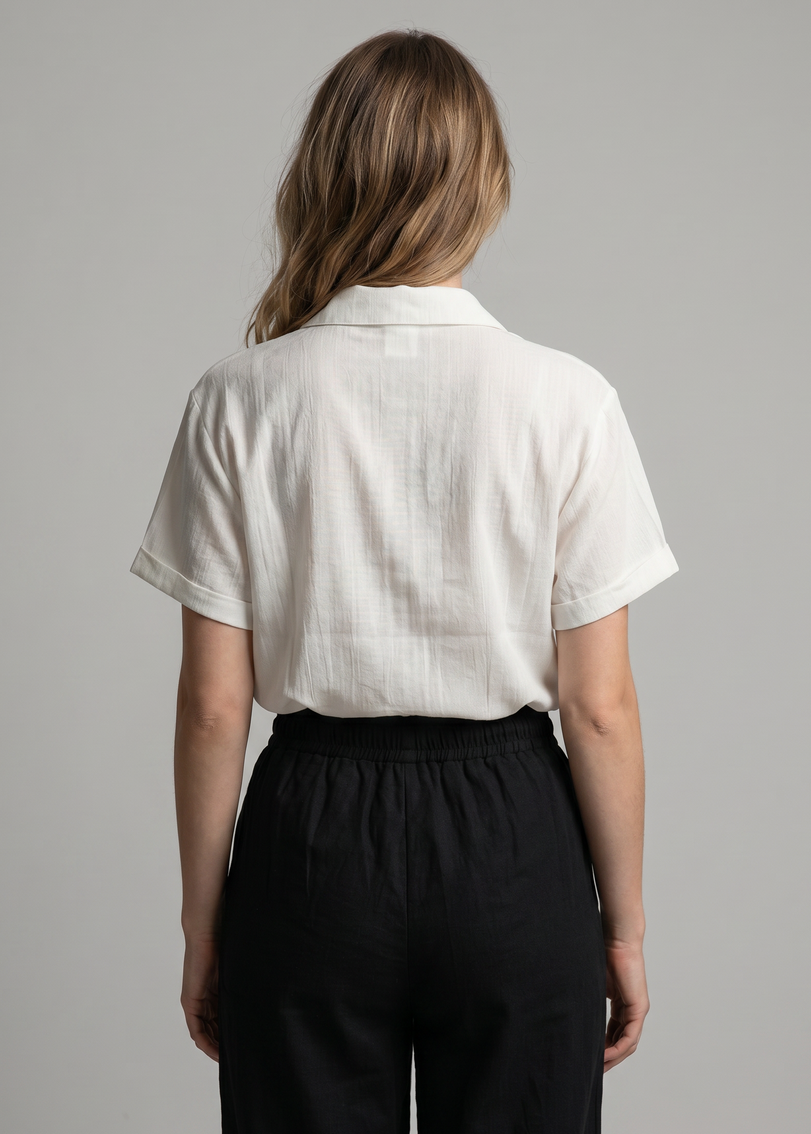 Πουκάμισο όψη λινού με κοντό μανίκι, γιακά, V ντεκολτέ και κλείσιμο μπροστά με κουμπιά.