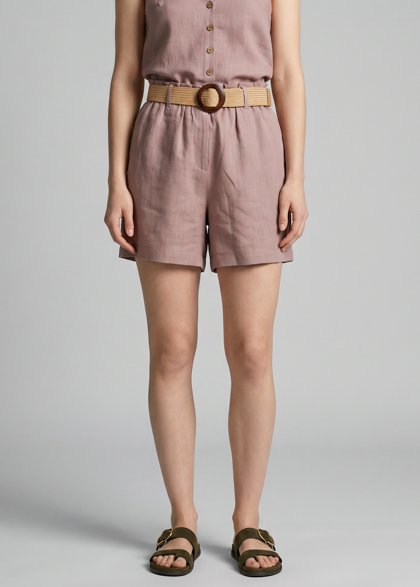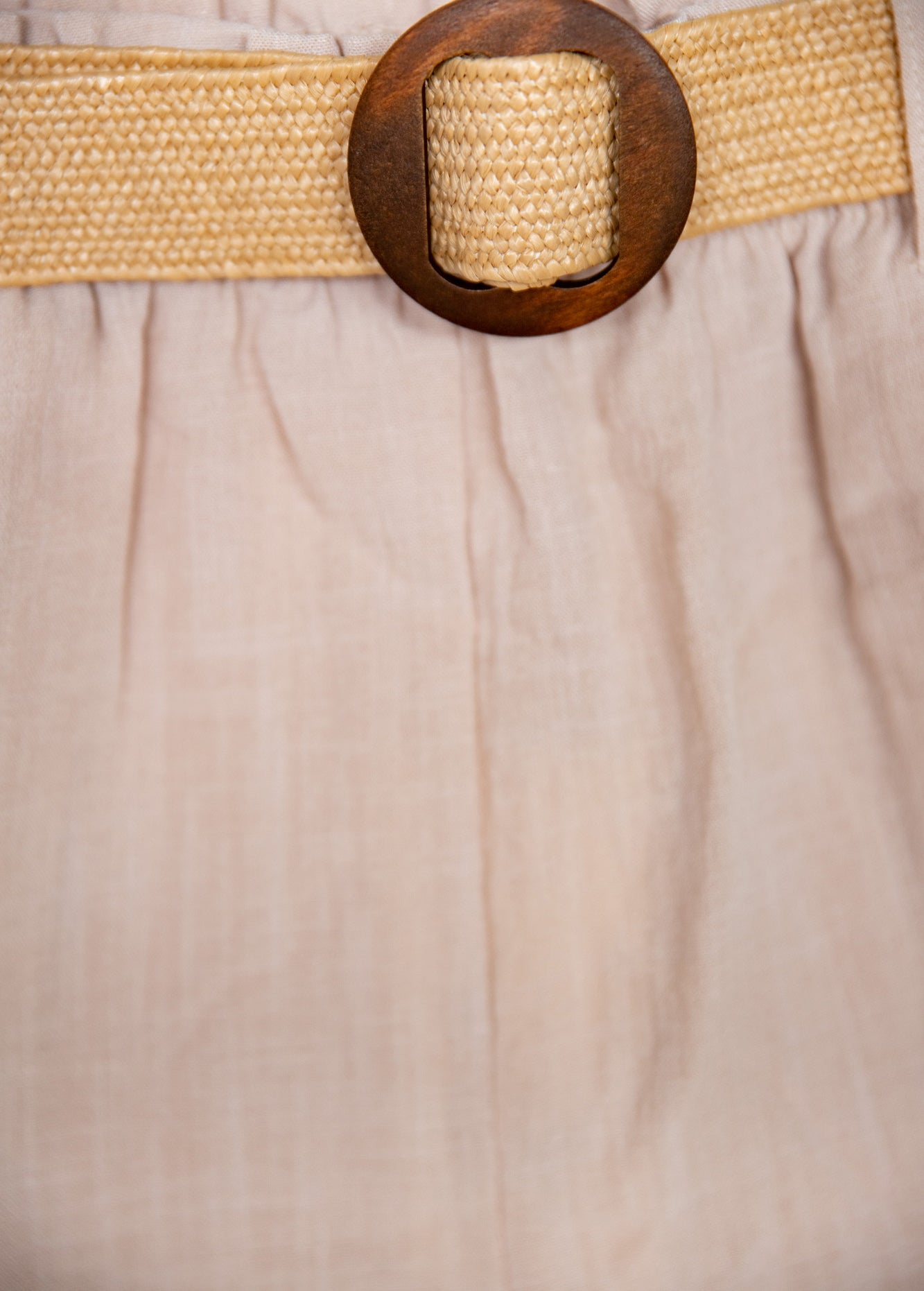 Σορτς όψη λινού σε χαλαρή γραμμή, ψηλόμεσο με τσέπες στα πλάγια και ψάθινη ζώνη.