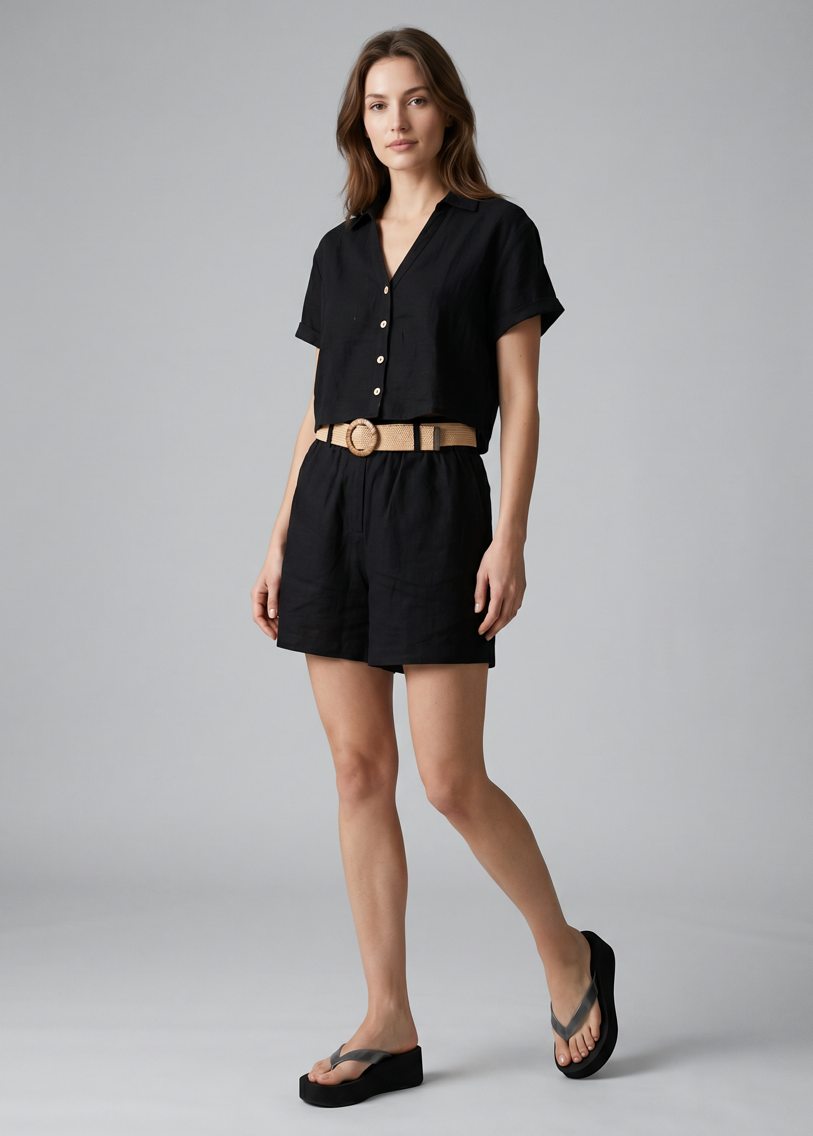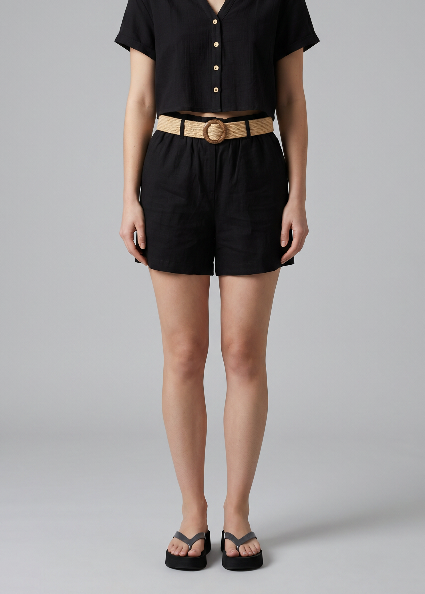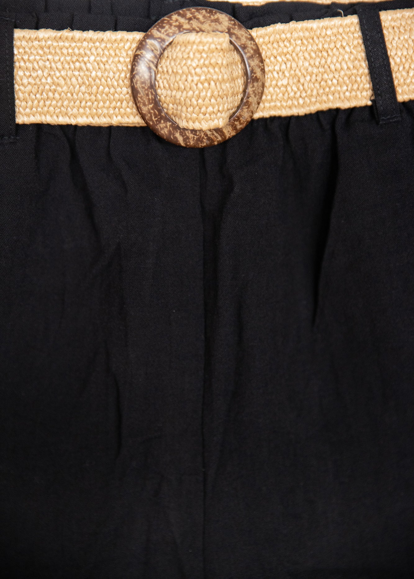 Σορτς όψη λινού σε χαλαρή γραμμή, ψηλόμεσο με τσέπες στα πλάγια και ψάθινη ζώνη.