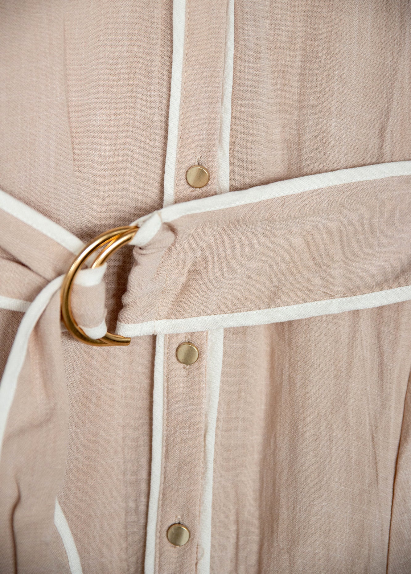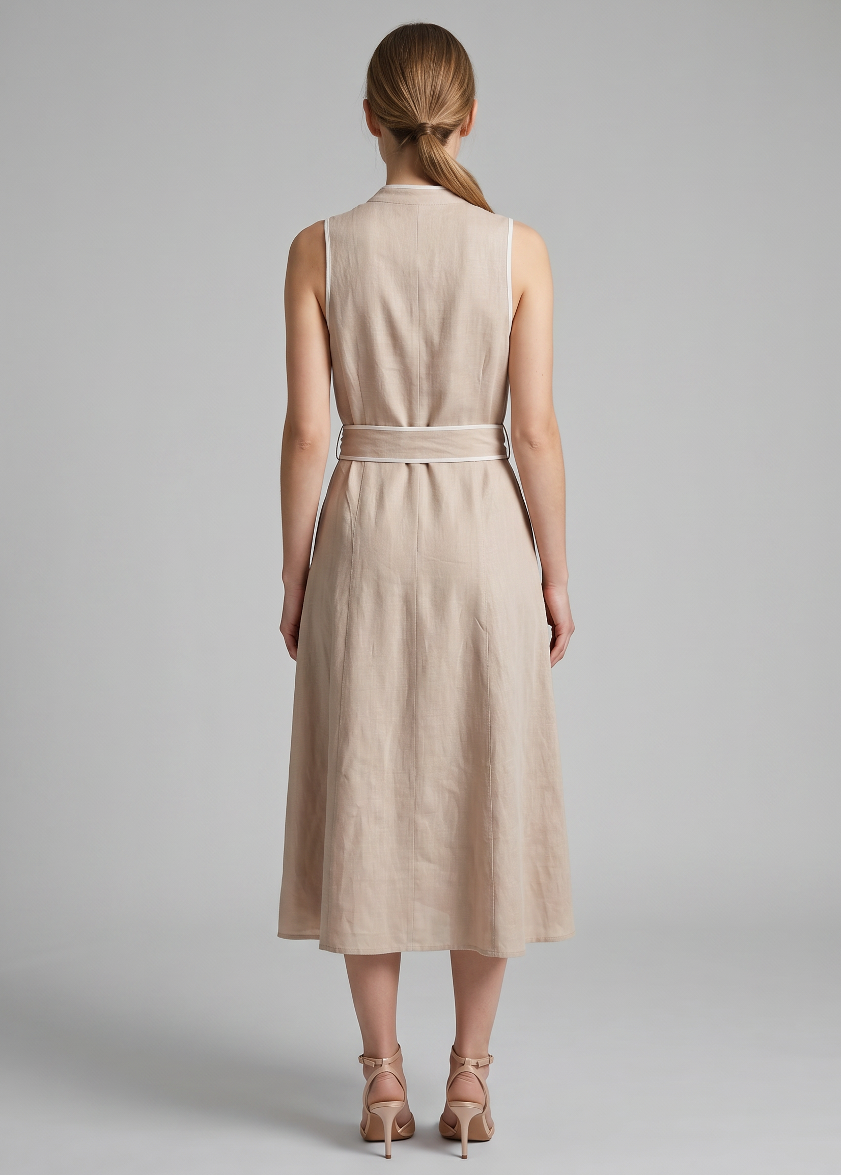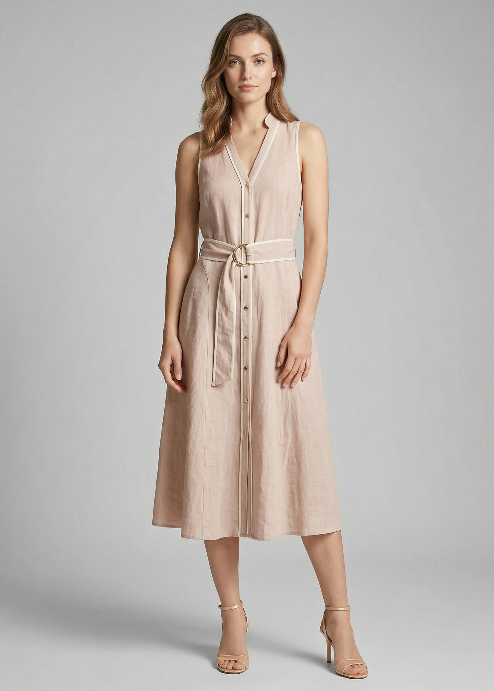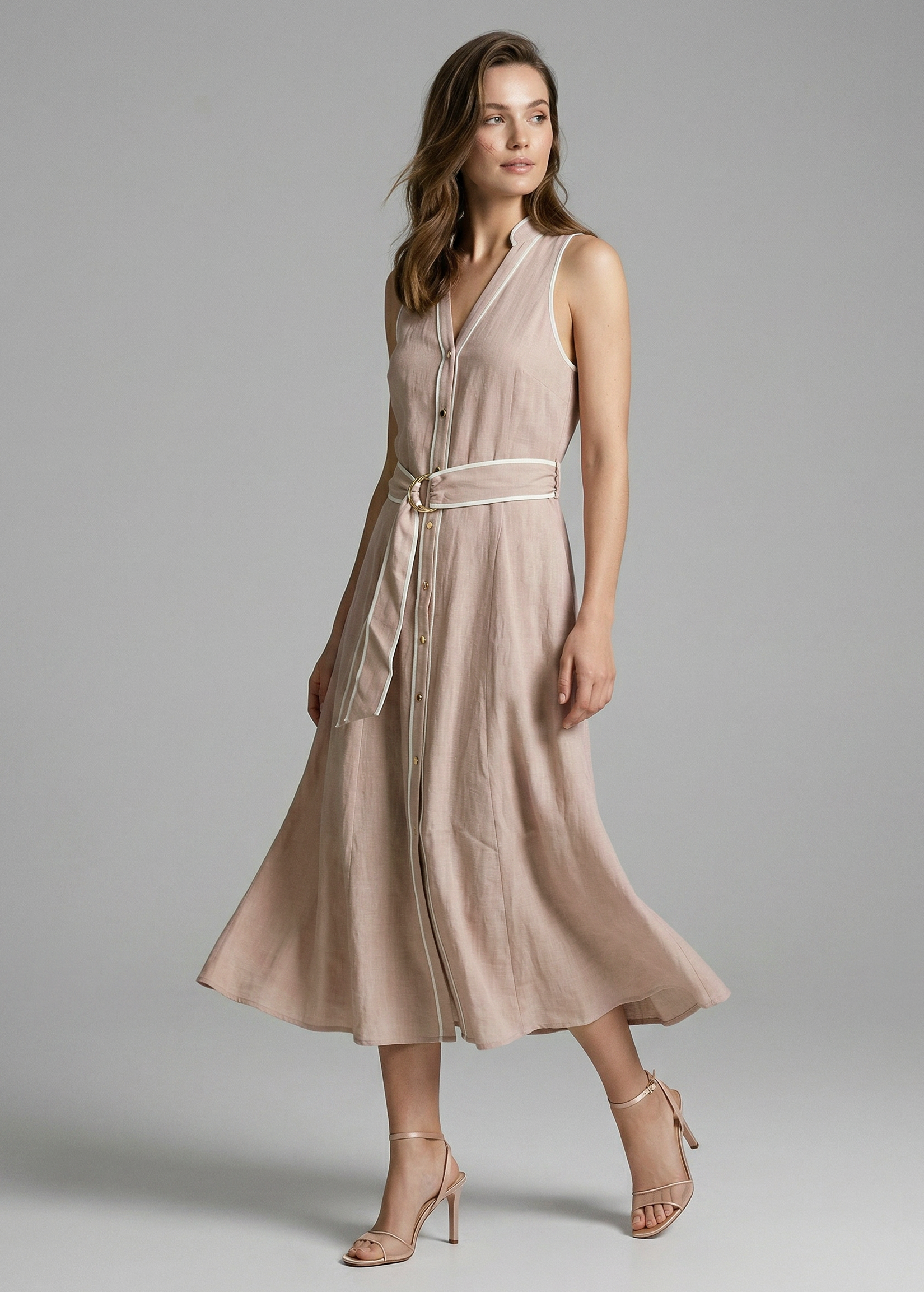 Μίντι φόρεμα όψη λινού σε χαλαρή γραμμή, αμάνικο με V ντεκολτέ και ρέλια σε αντίθεση. Λεπτομέρεια με ασορτί ζωνάκι και κλείσιμο μπροστά με κουμπιά.