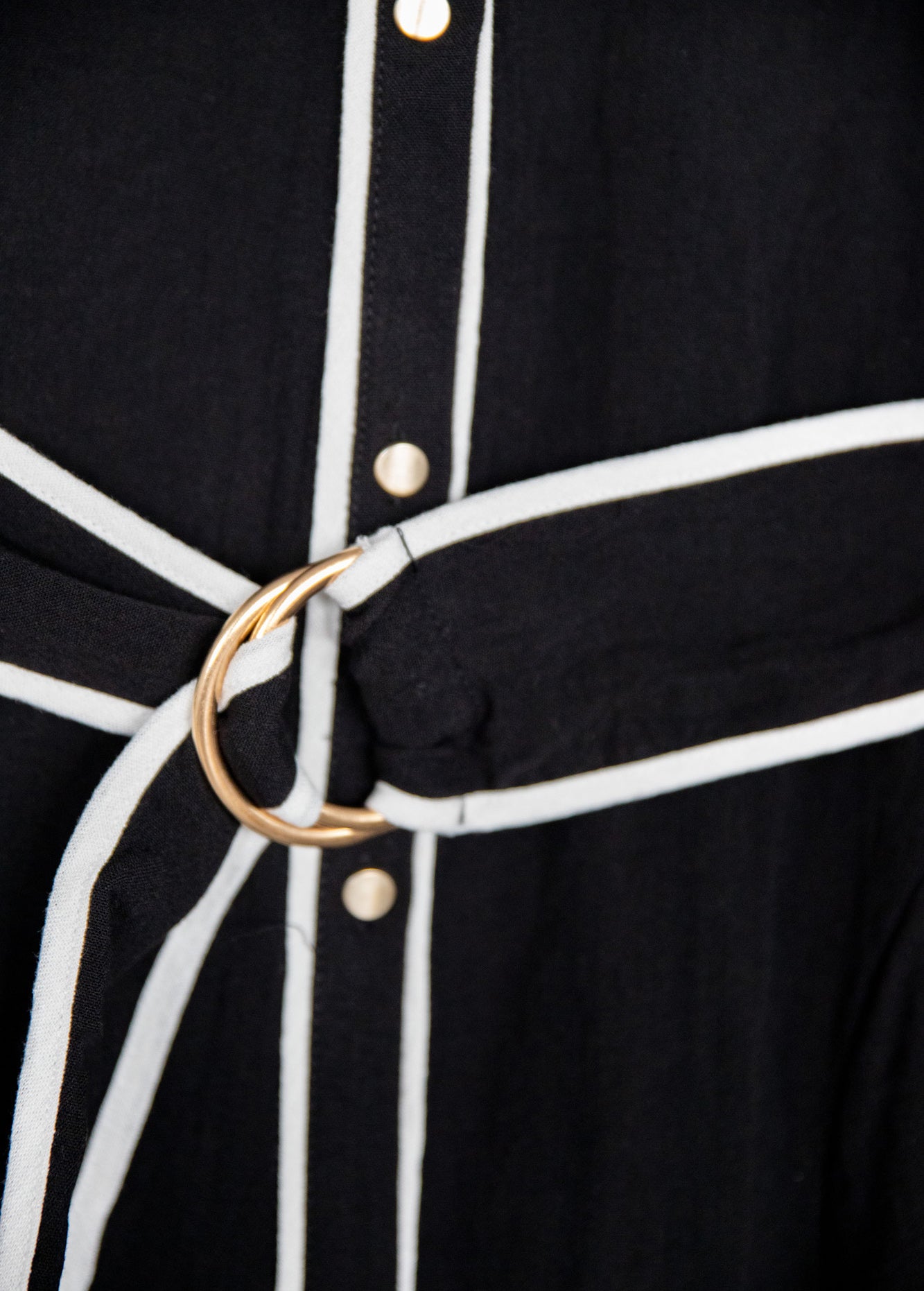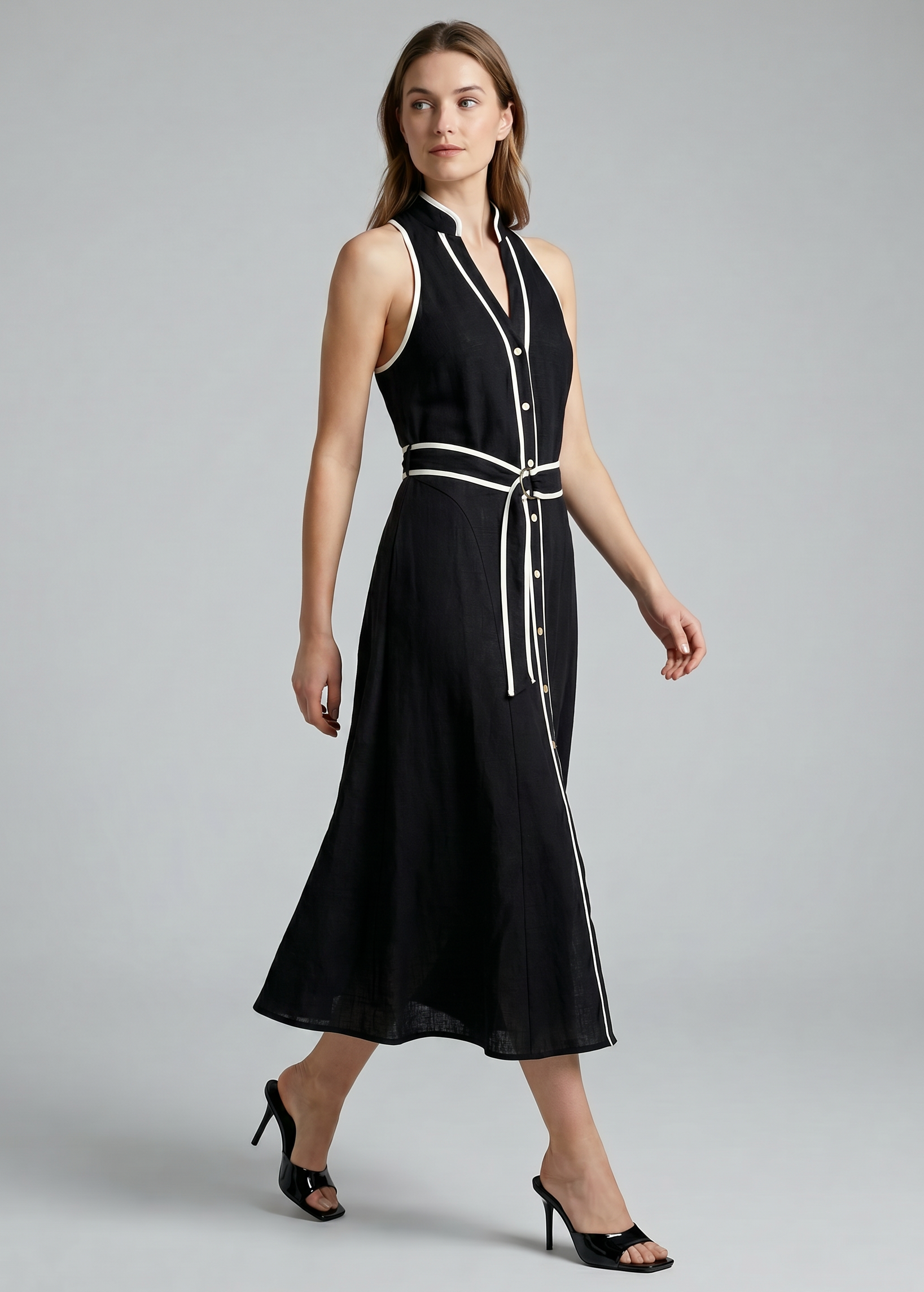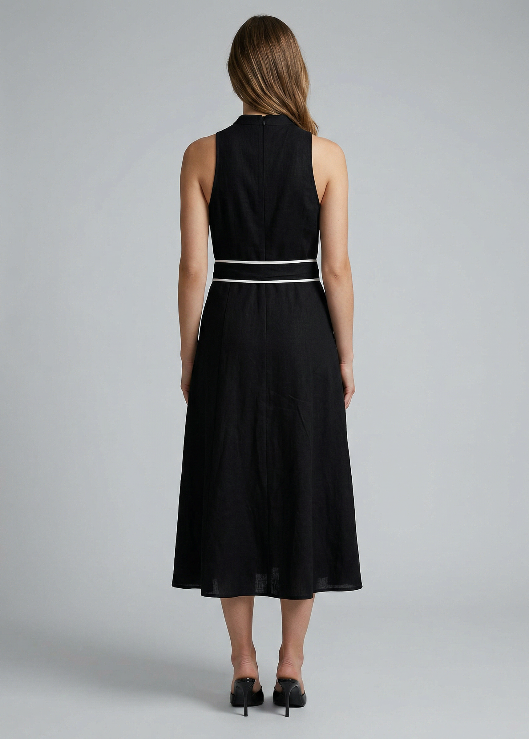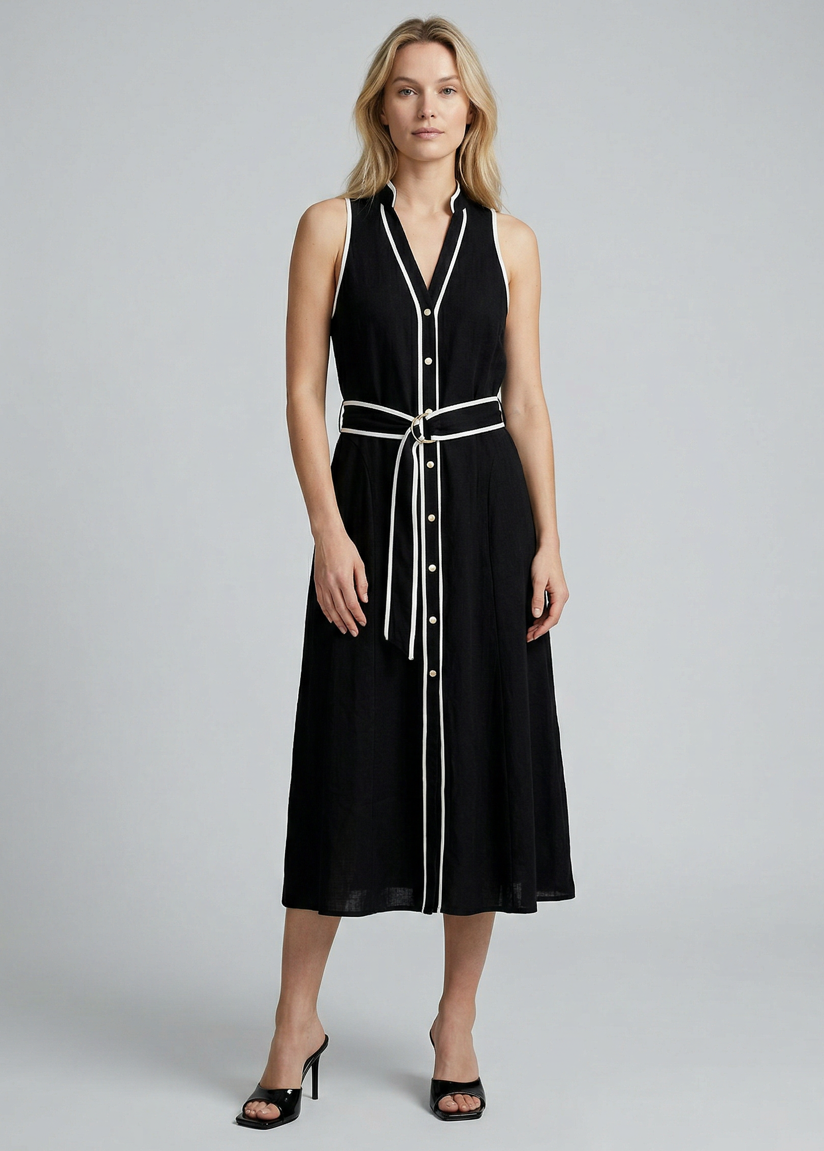 Μίντι φόρεμα όψη λινού σε χαλαρή γραμμή, αμάνικο με V ντεκολτέ και ρέλια σε αντίθεση. Λεπτομέρεια με ασορτί ζωνάκι και κλείσιμο μπροστά με κουμπιά.