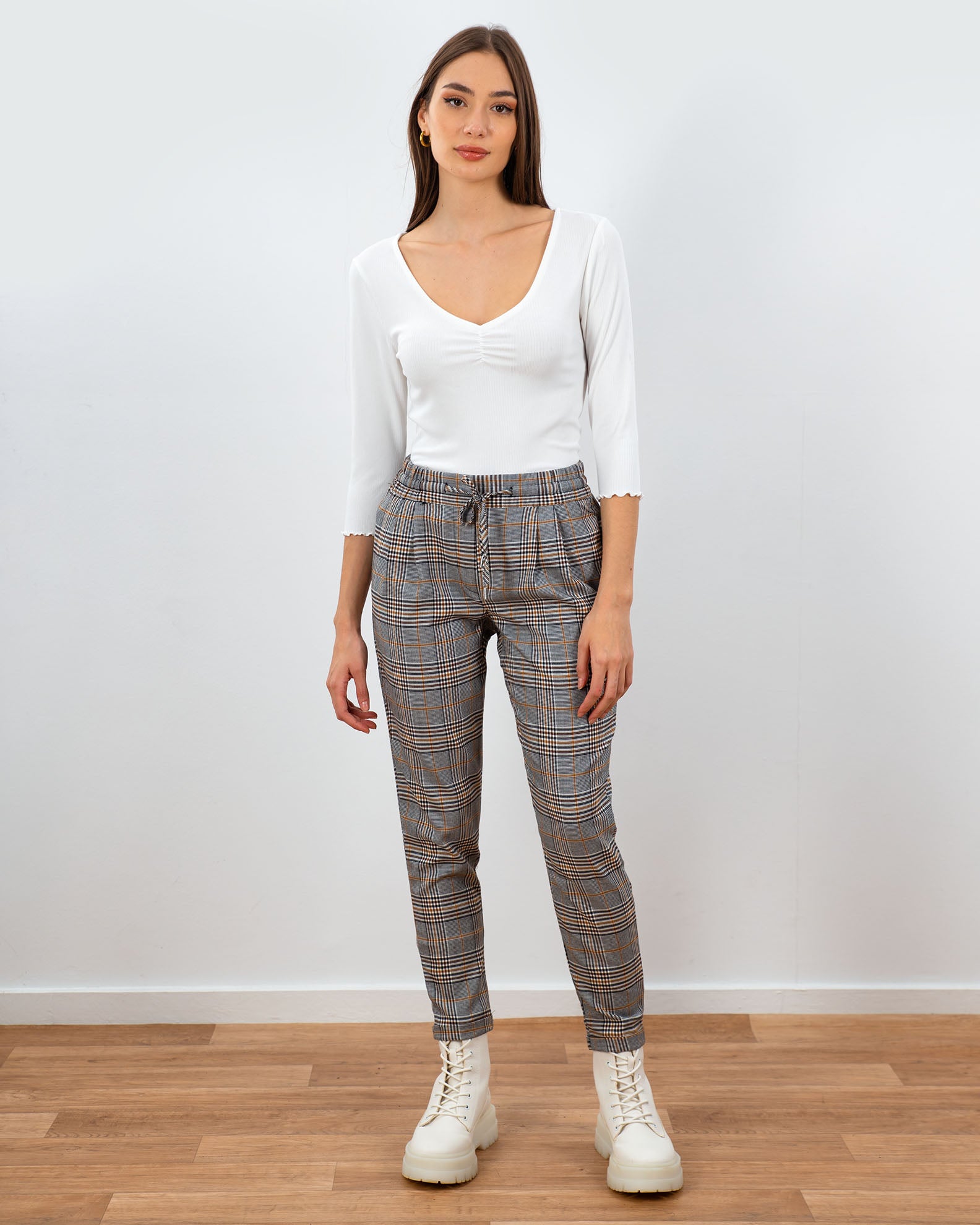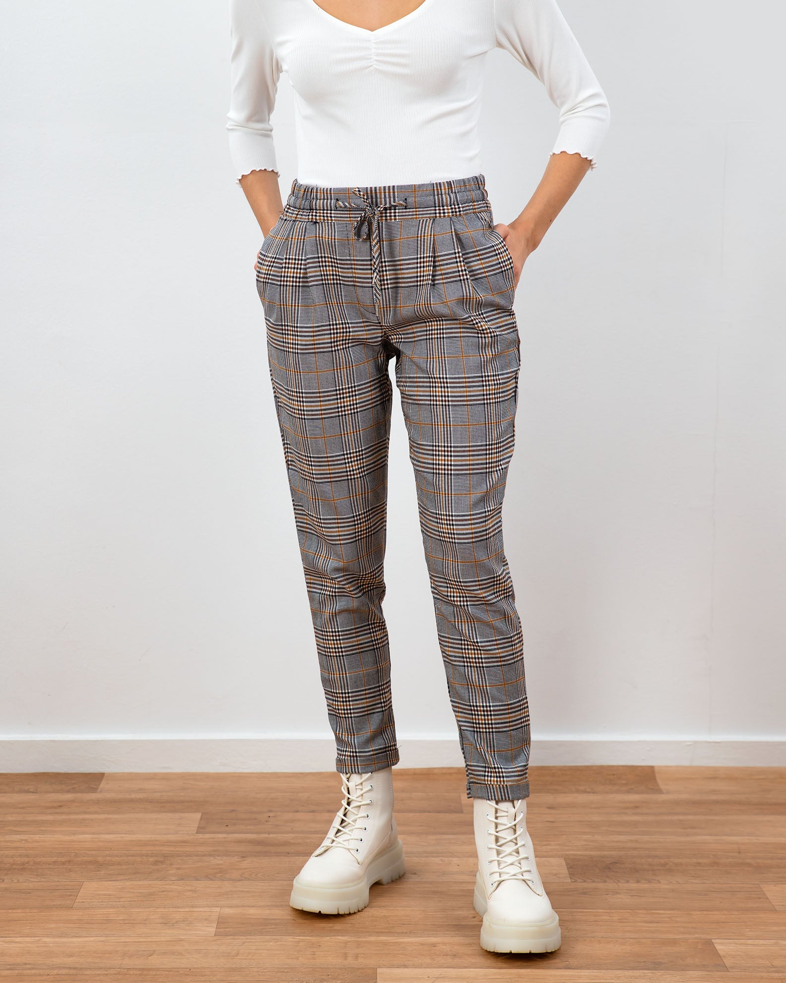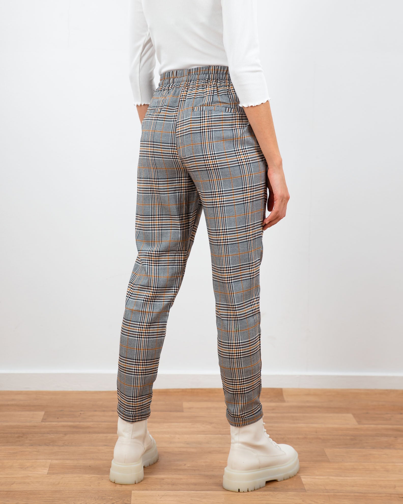 Παντελόνι σε ίσια γραμμή με καρό σχέδιο, τσέπες στα πλάγια και ελαστική μεσή.
