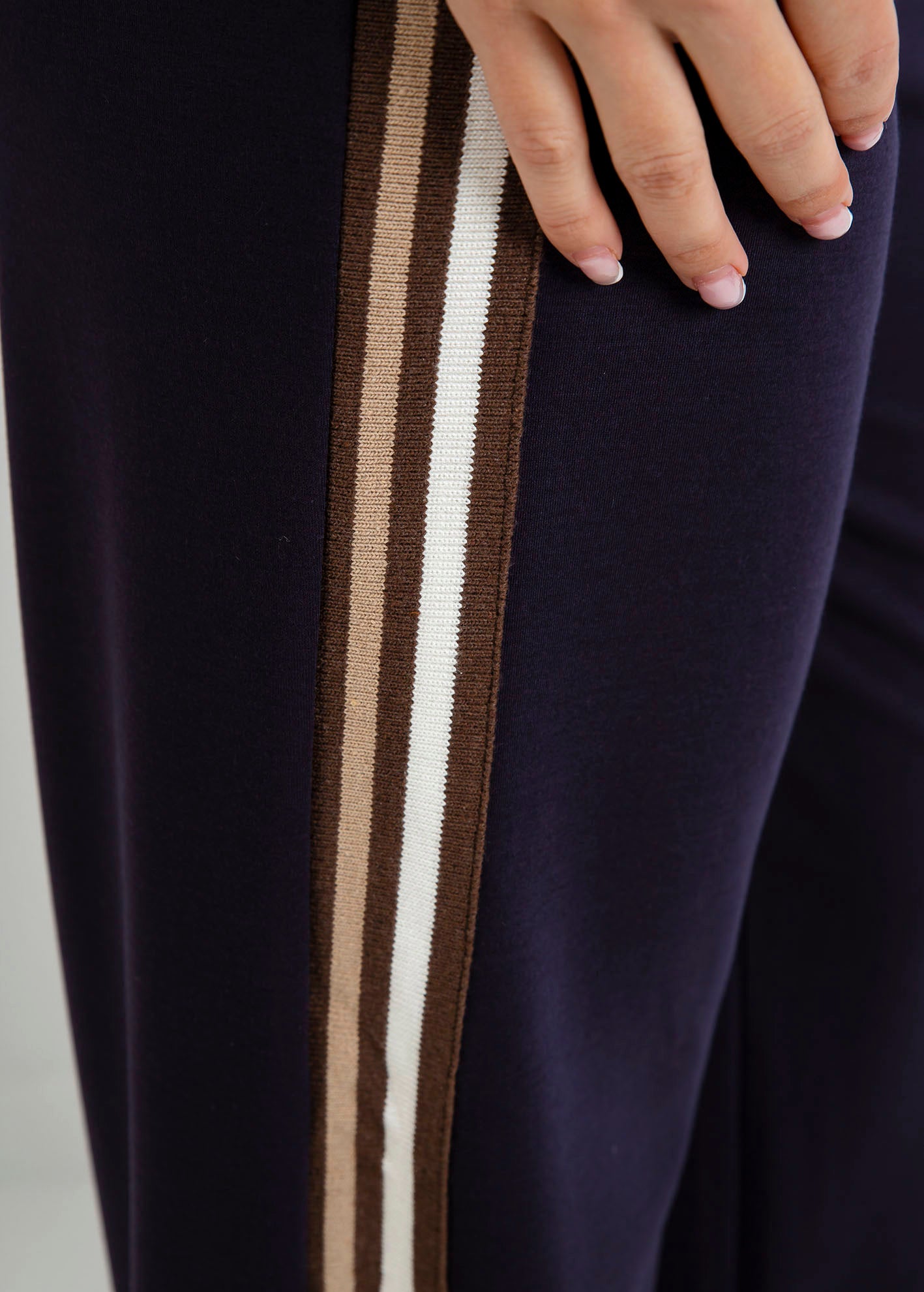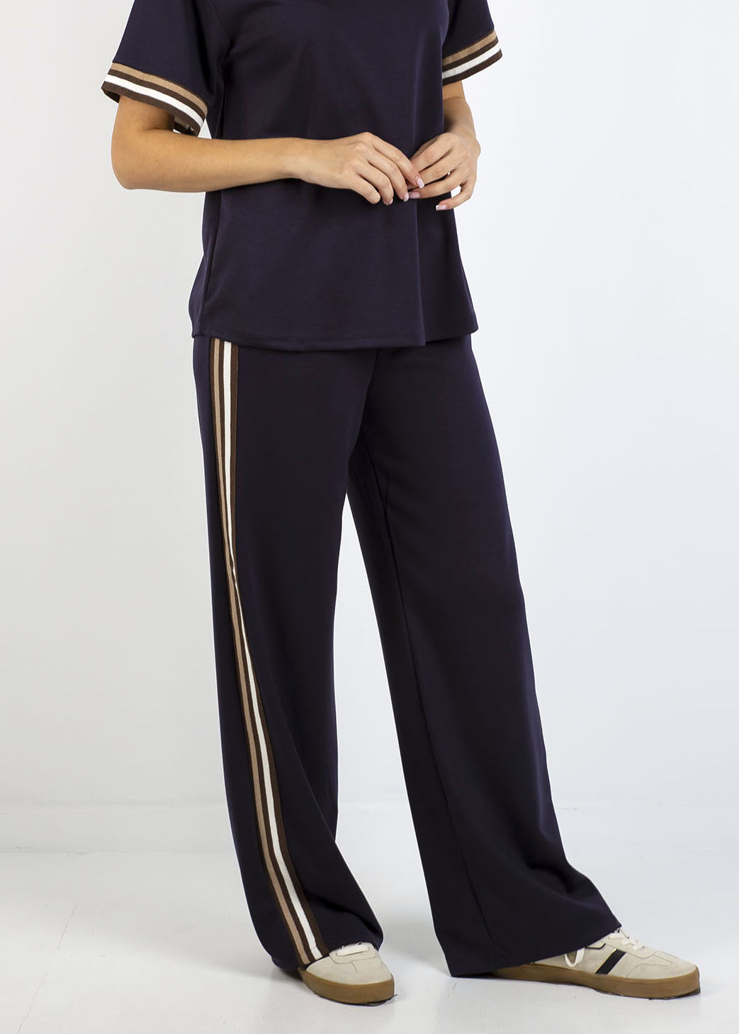 Παντελόνι φούτερ ψηλόμεσο, με ελαστική μέση, τσέπες στα πλάγια και λεπτομέρεια με ριγέ τρέσα στο πλάι.
