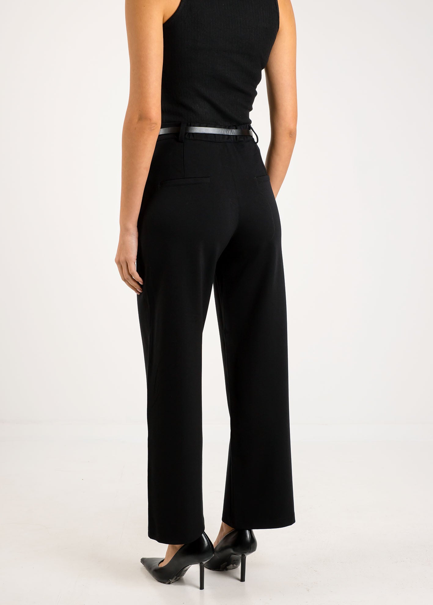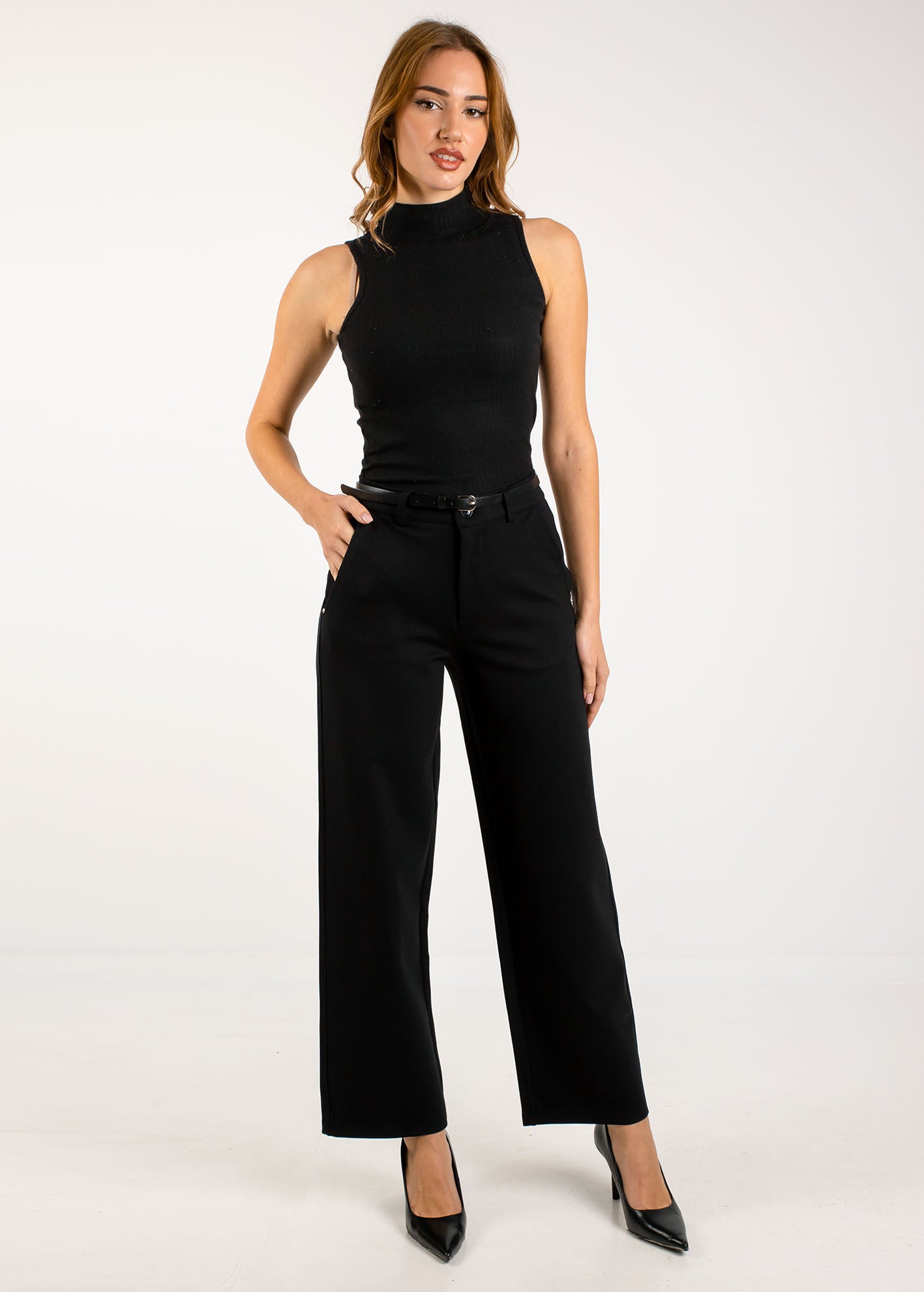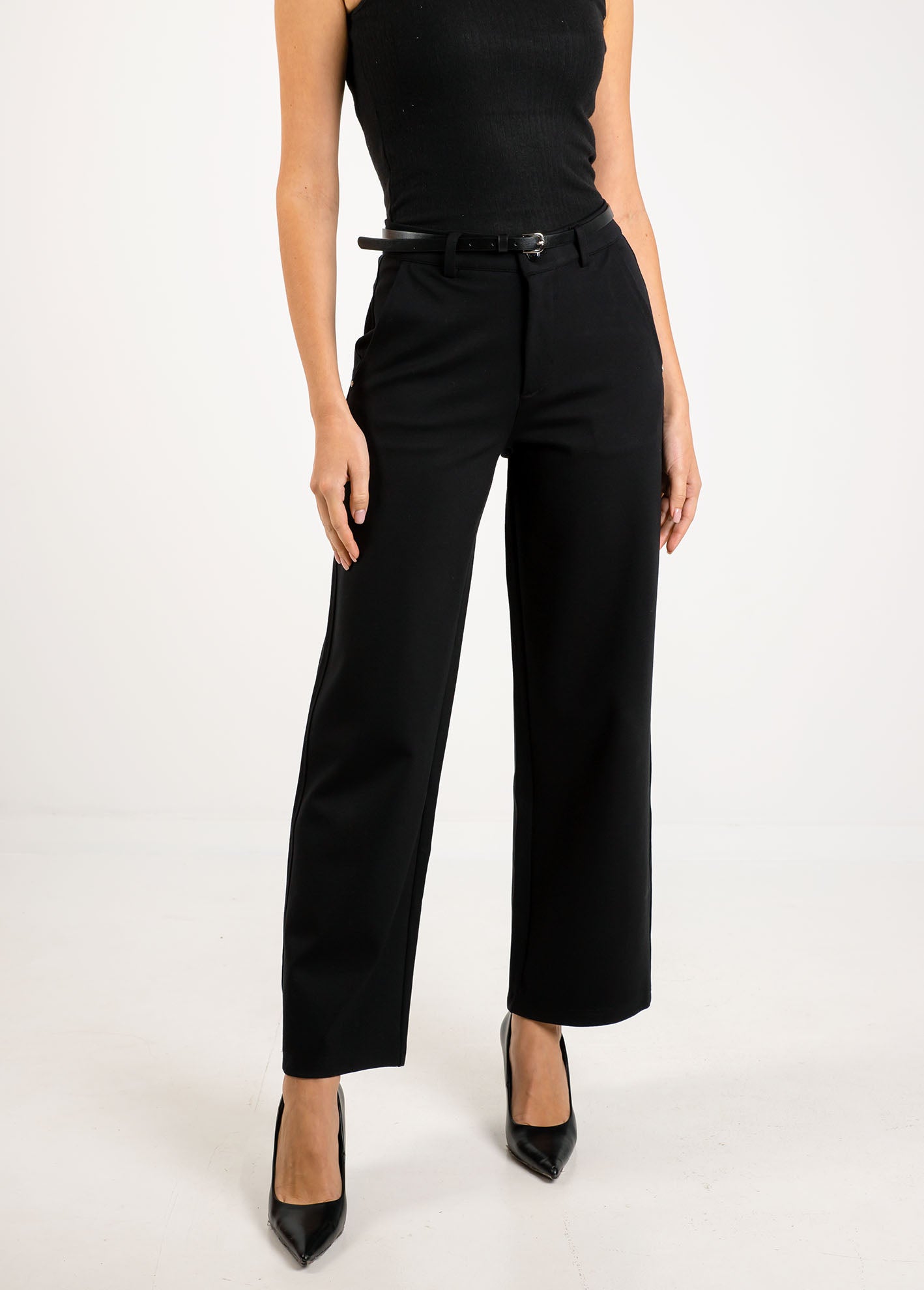Κλασικό μαύρο παντελόνι σε ίσια, wide-leg γραμμή, με ψηλή μέση που κολακεύει τη σιλουέτα. Διαθέτει αποσπώμενη λεπτή ζώνη, πλαϊνές τσέπες και κλείσιμο με φερμουάρ και κουμπί. Κατασκευασμένο από μαλακό ύφασμα με σταθερή εφαρμογή.