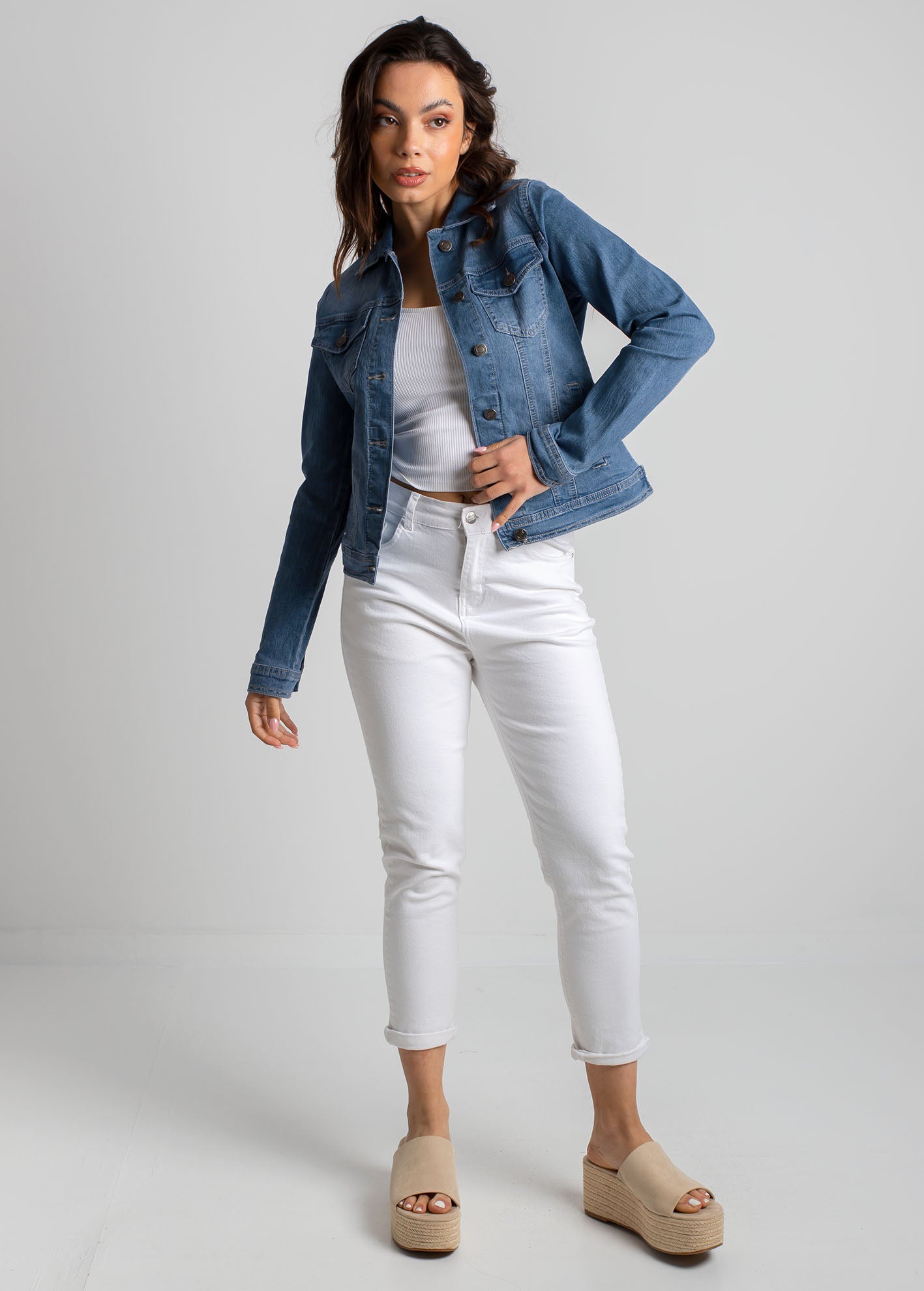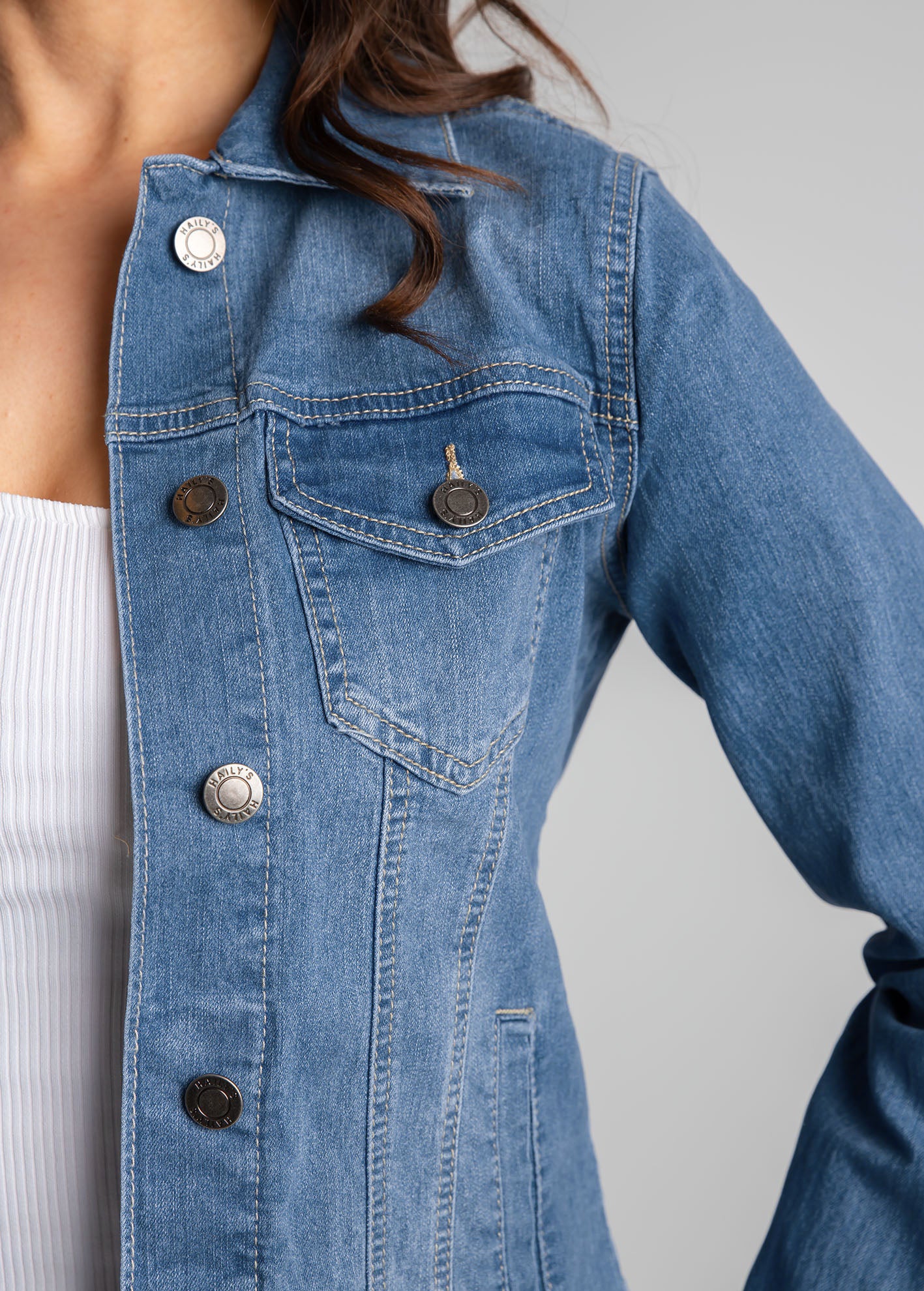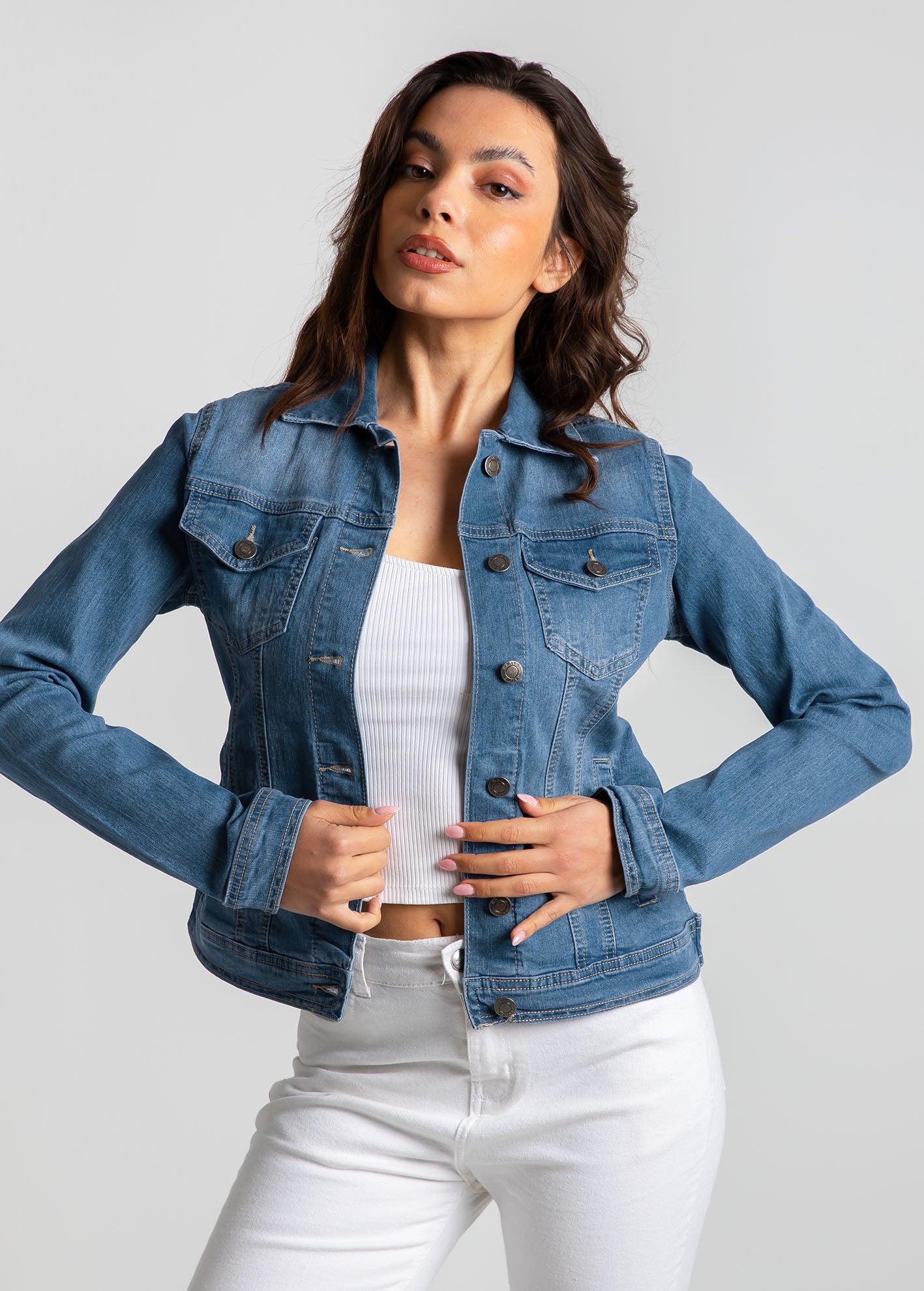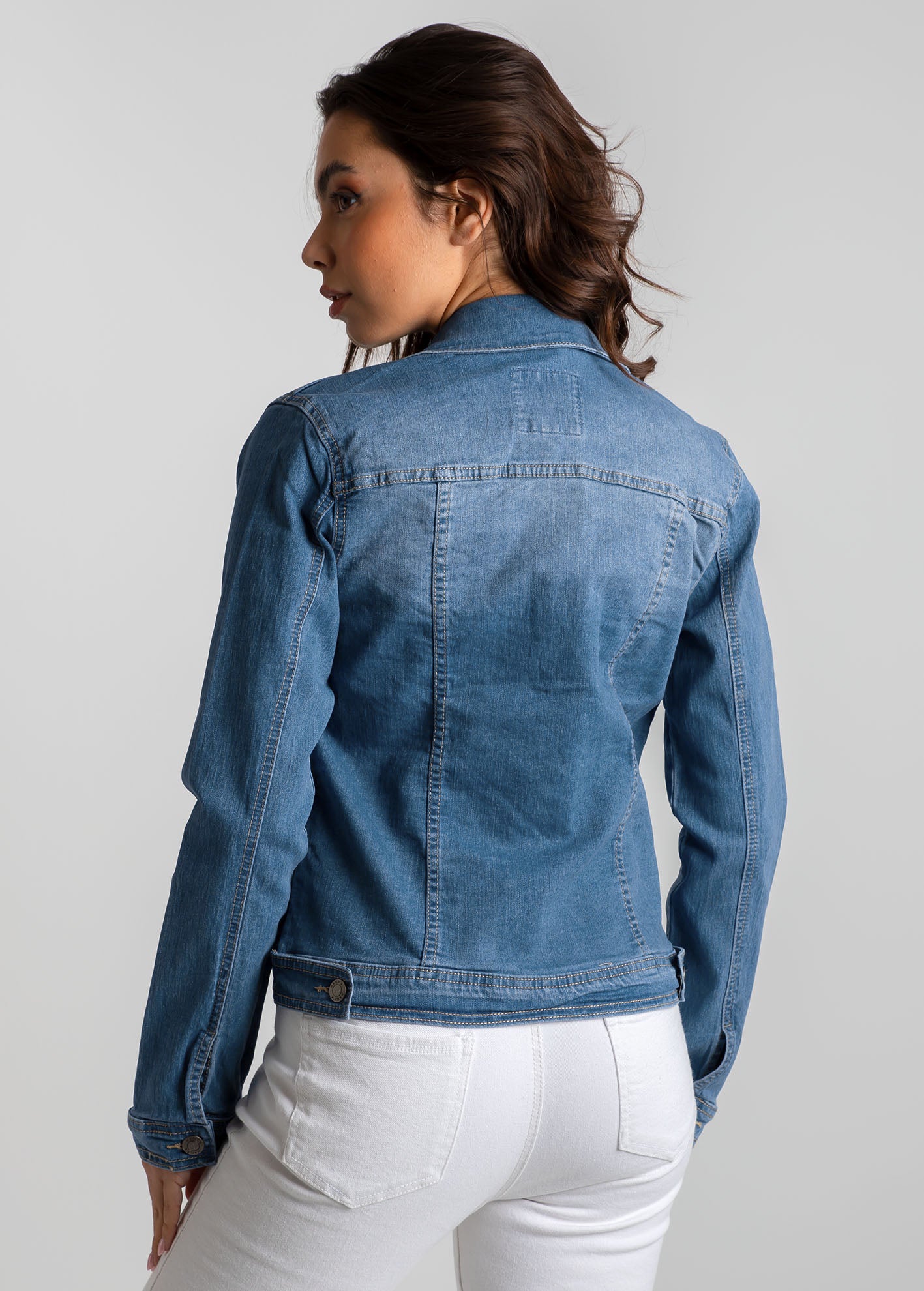 Ντένιμ τζάκετ με μακρύ μανίκι, γιακά, τσέπες patch και κλείσιμο μπροστά με κουμπιά.