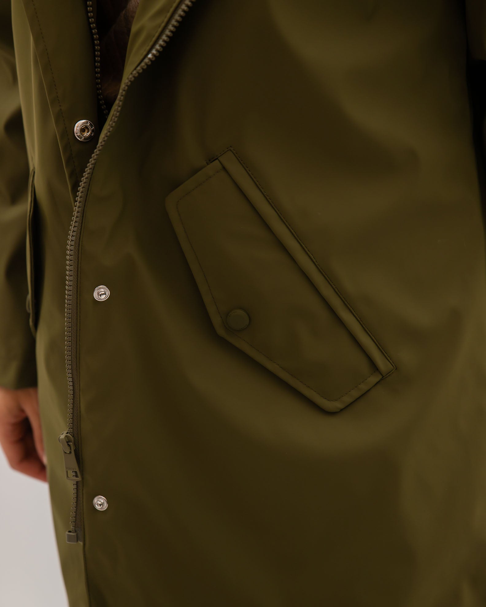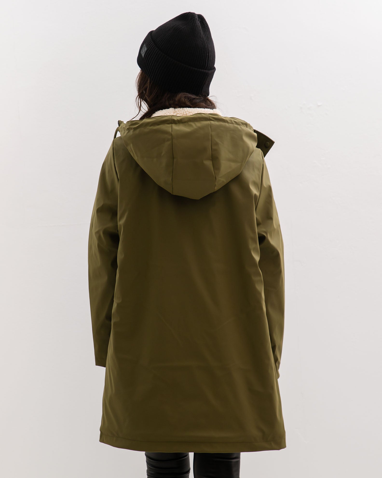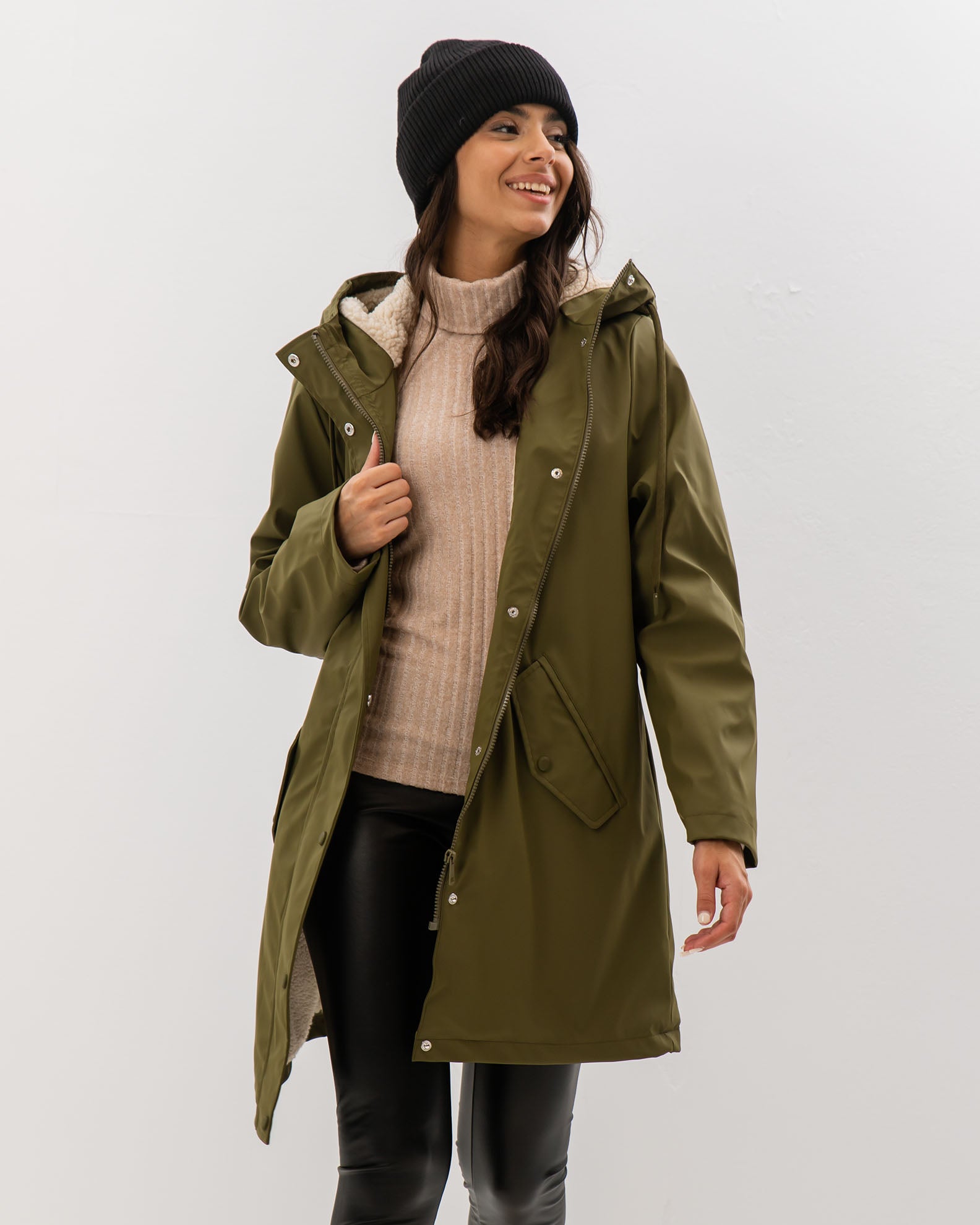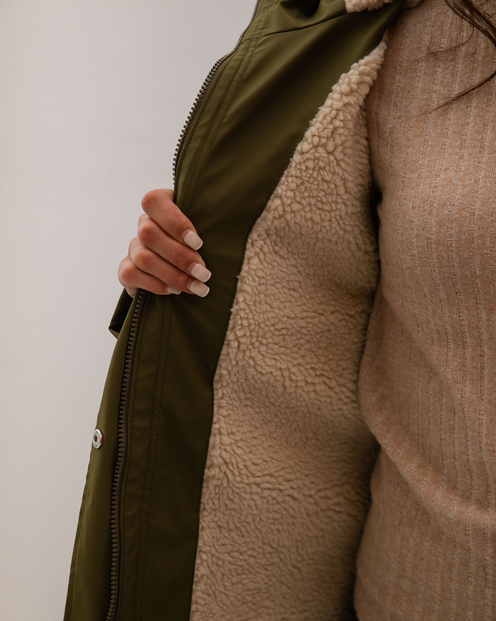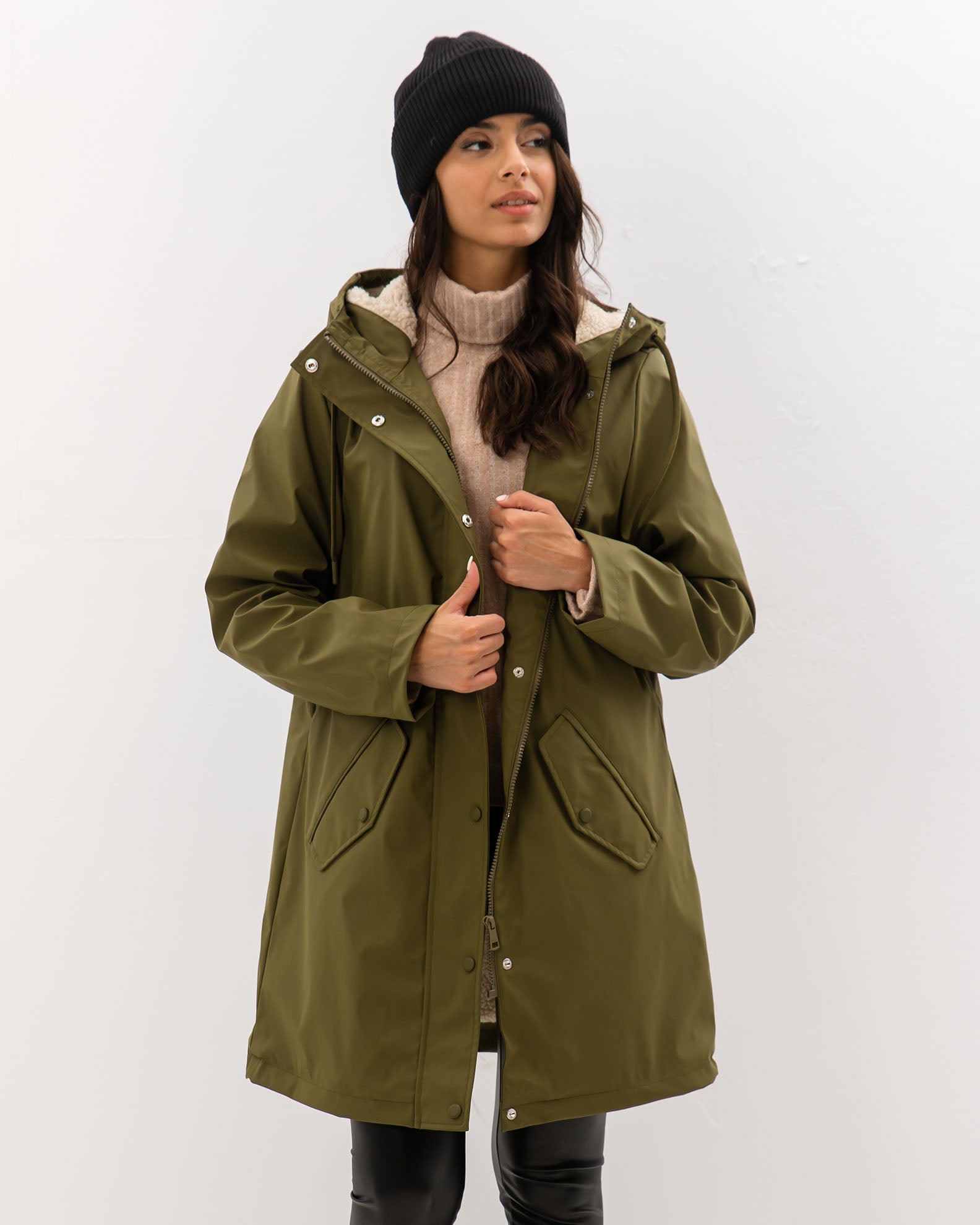 Αδιάβροχο αντιανεμικό μπουφάν με επένδυση τύπου προβάτου στο εσωτερικό, στην κουκούλα και στα μανίκια. Τσέπες στα πλάγια και κλείσιμο μπροστά με φερμουάρ και κουμπί.