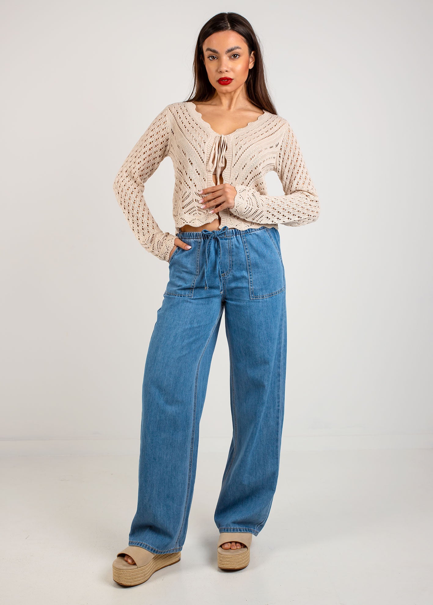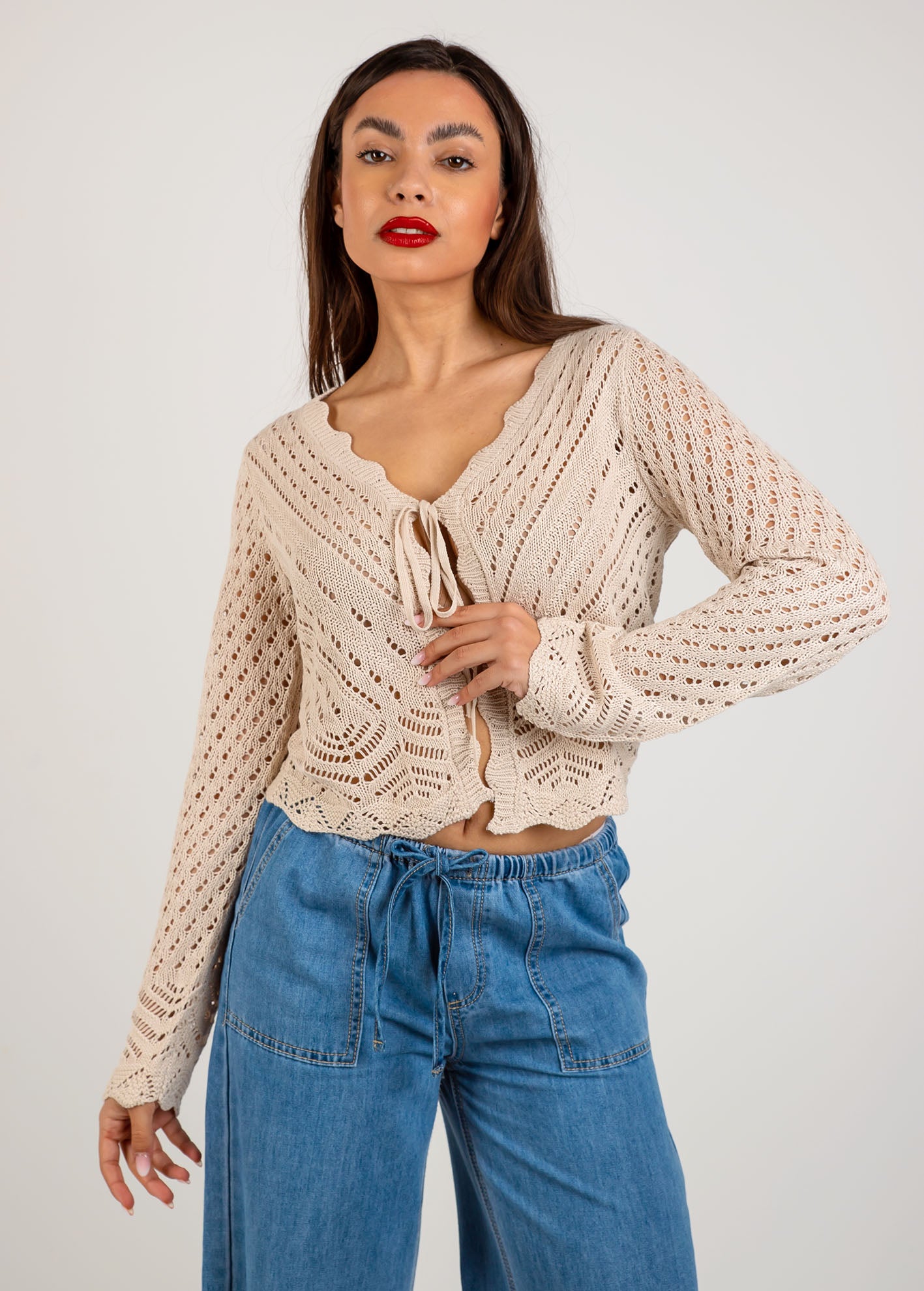 Ελαφριά πλεκτή ζακέτα με διάτρητο σχέδιο, μακρύ μανίκι και V ντεκολτέ.