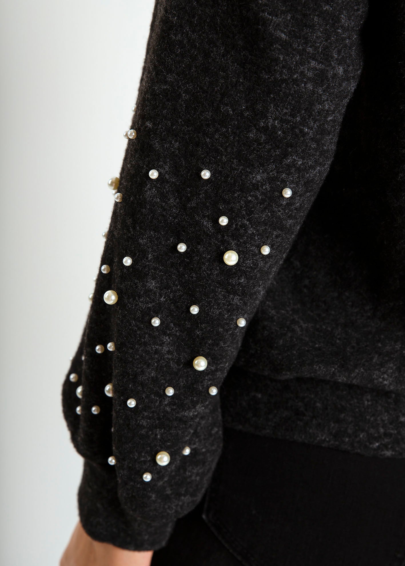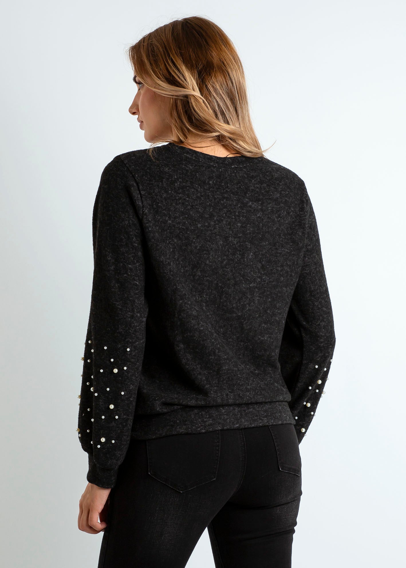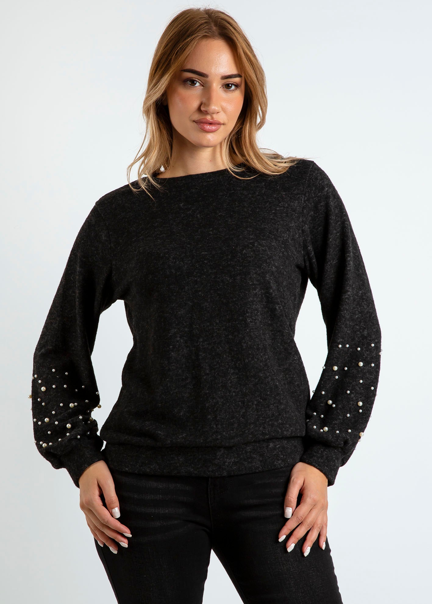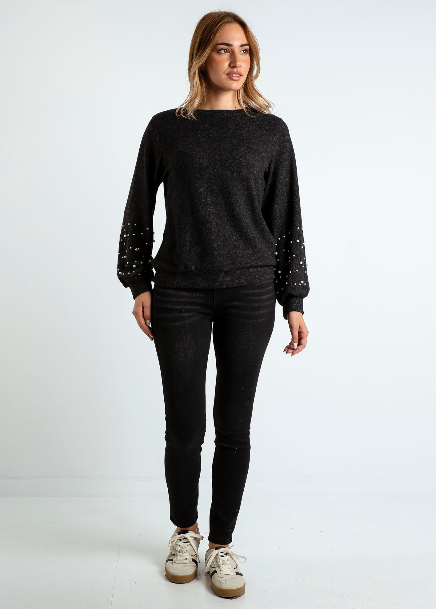 Πλεκτή ελαφριά μπλούζα με απαλή υφή, στρογγυλή λαιμόκοψη και μακρύ φουσκωτό μανίκι διακοσμημένο με πέρλες.