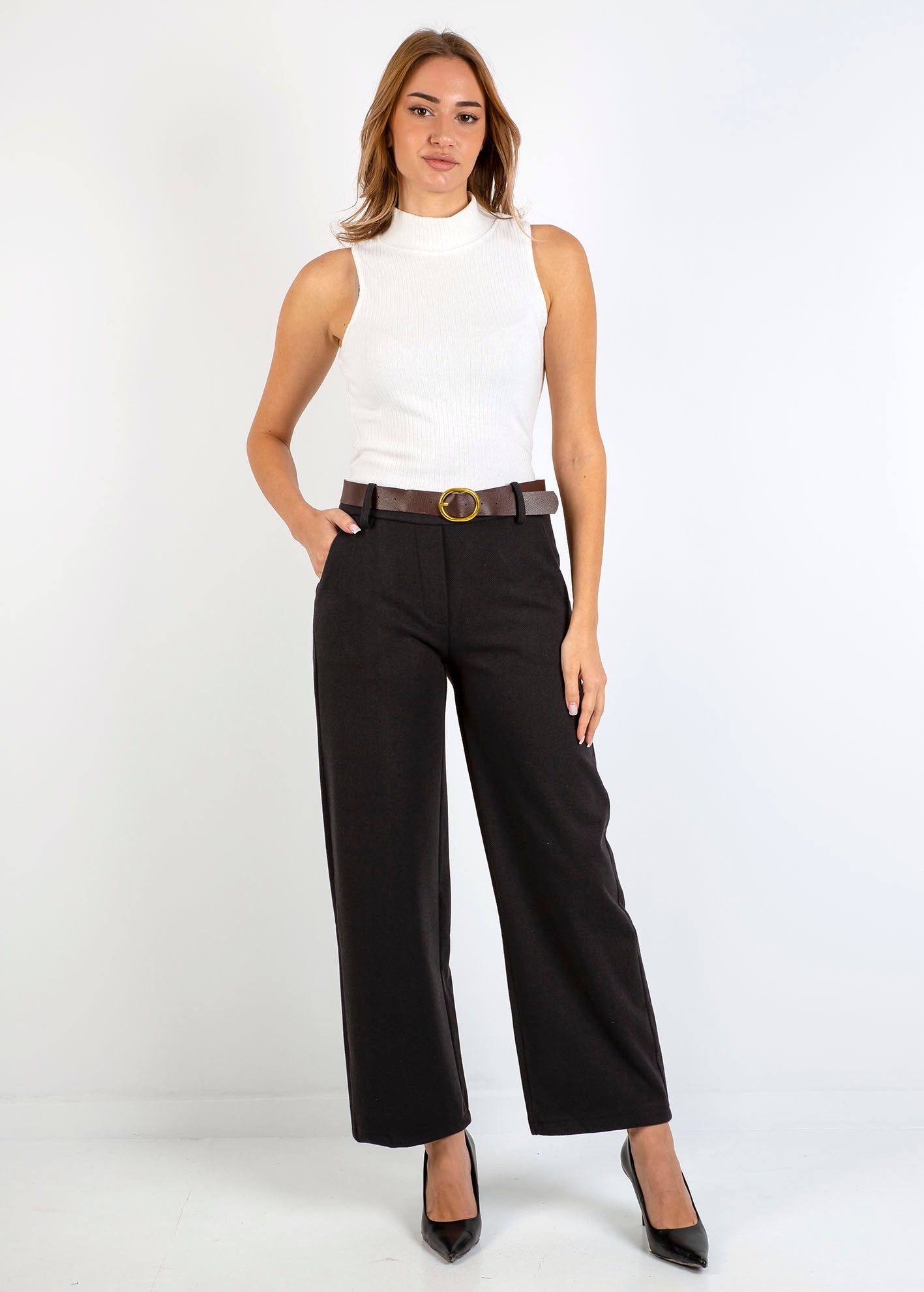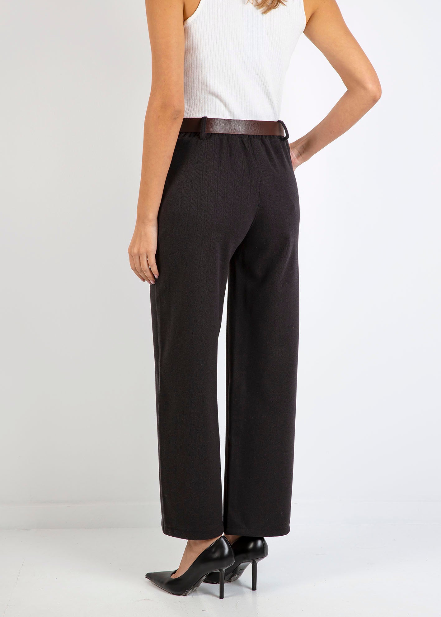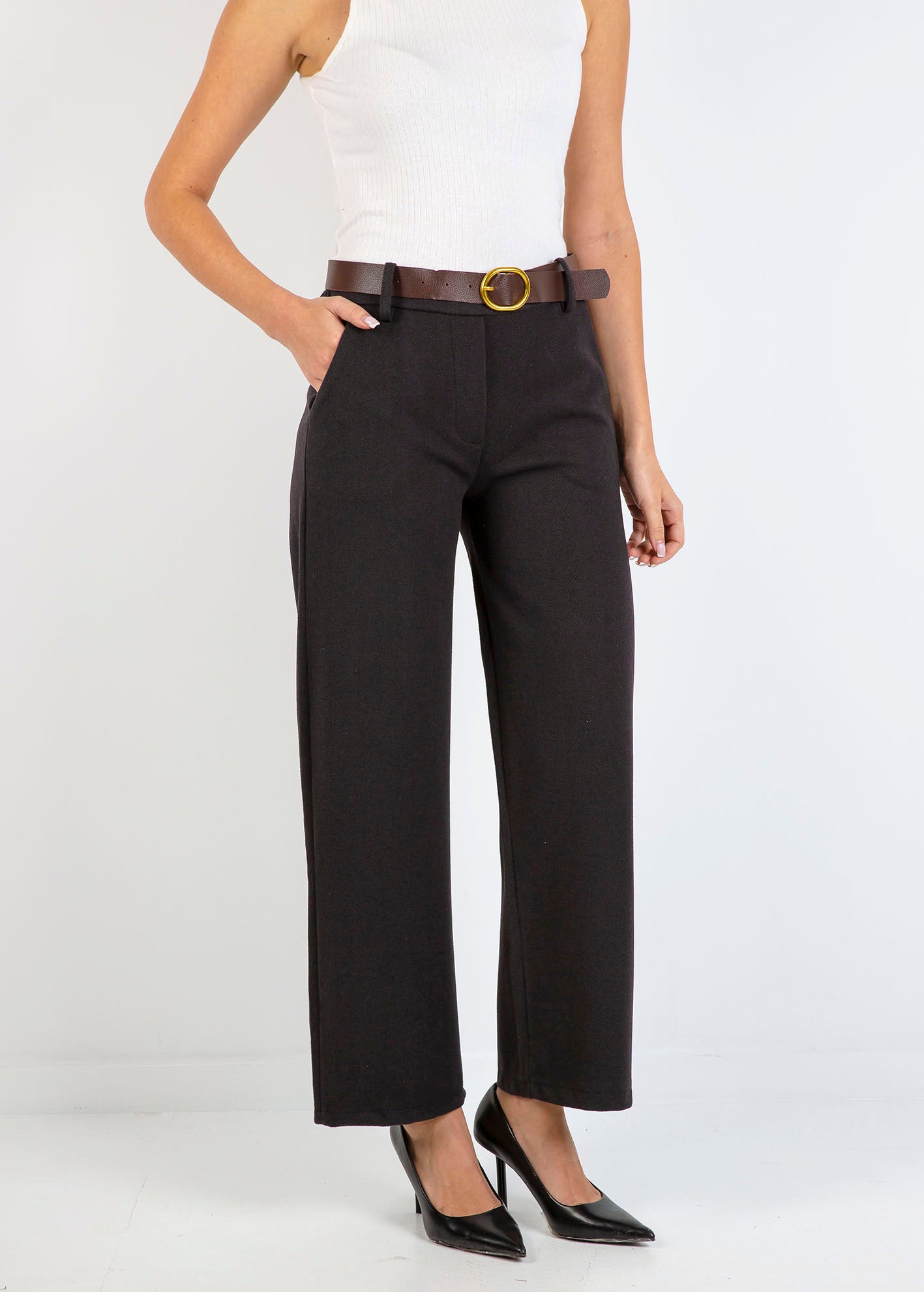Ψηλόμεσο παντελόνι με σχέδιο ψαροκόκκαλο, σε ίσια γραμμή, με φαρδύ μπατζάκι και τσέπες στα πλάγια. Λεπτομέρεια με ζώνη σε αντίθεση, κλείσιμο μπροστά με κουμπί και φερμουάρ.