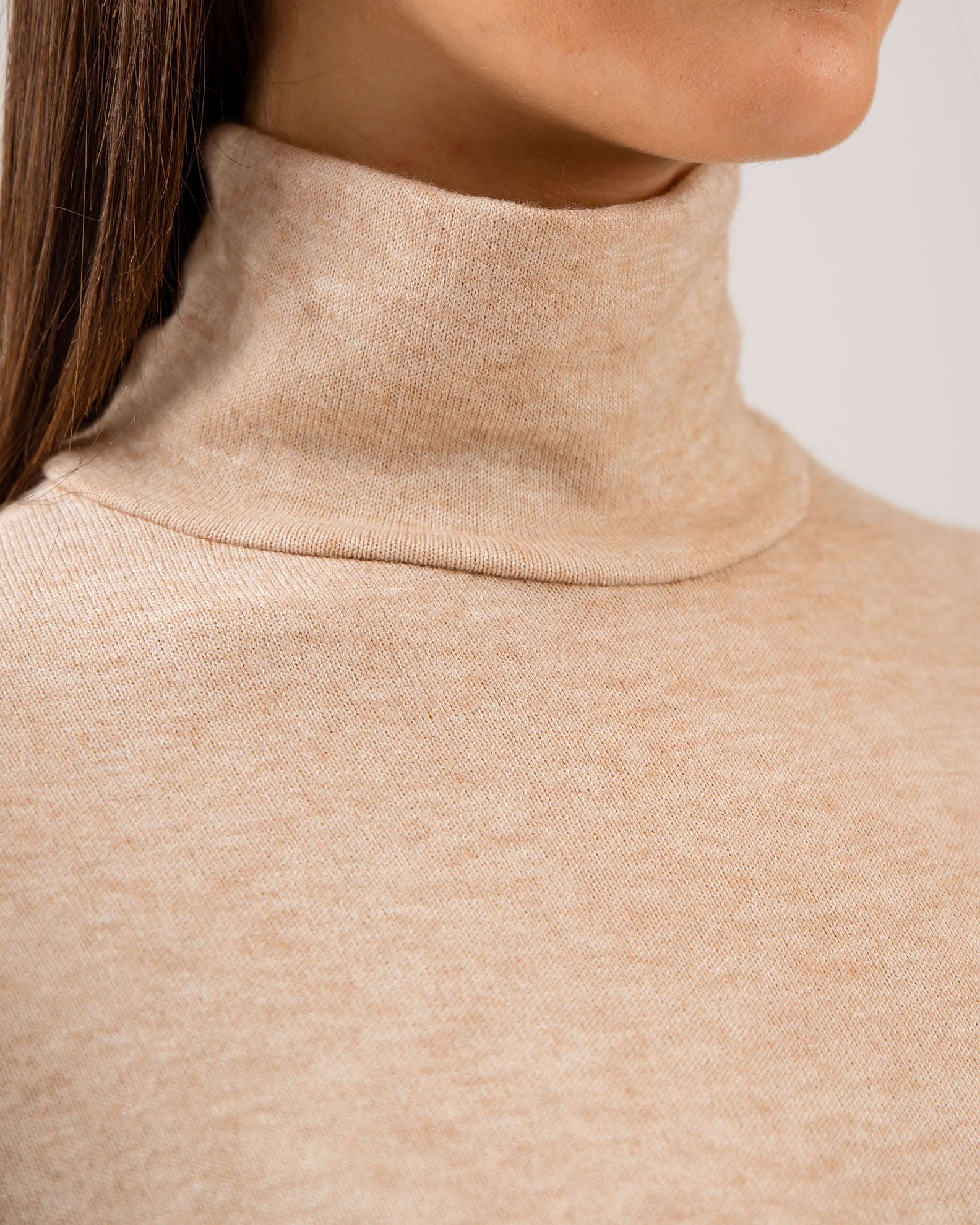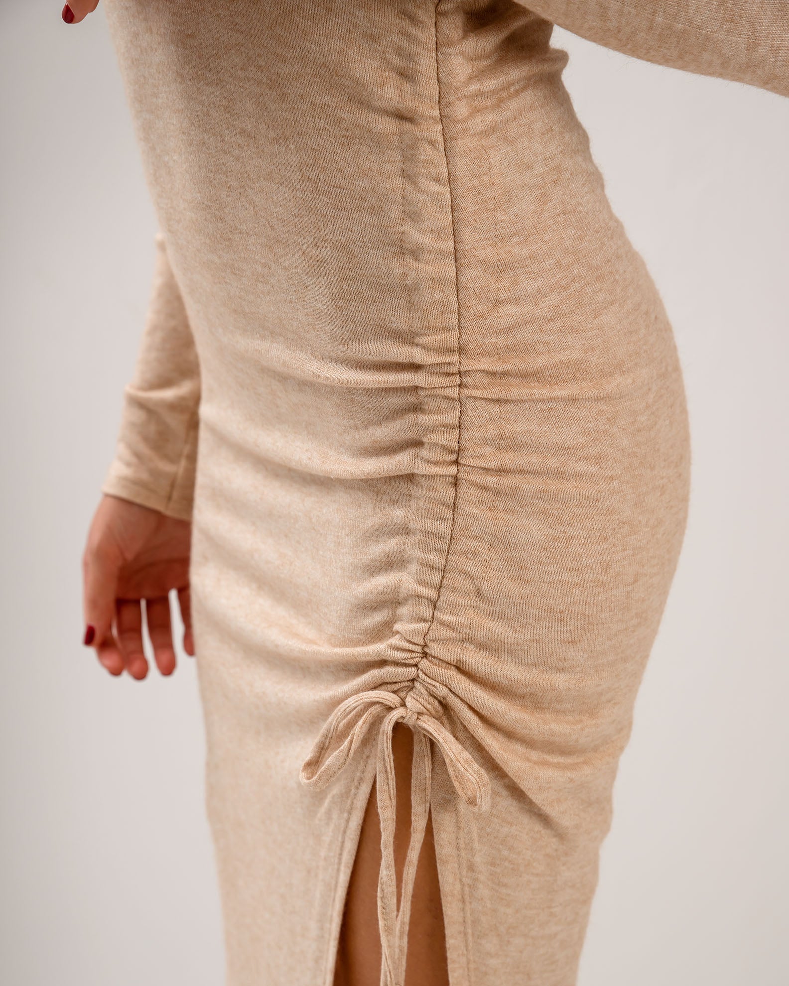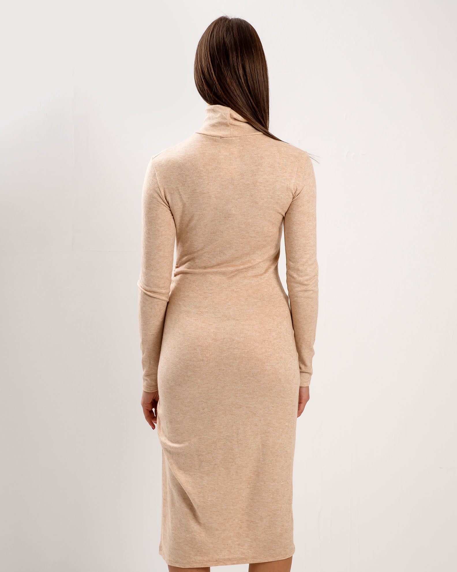 Φόρεμα μίντι με μακρύ μανίκι, όρθιο γιακά και άνοιγμα με σούρα στο πλάι.