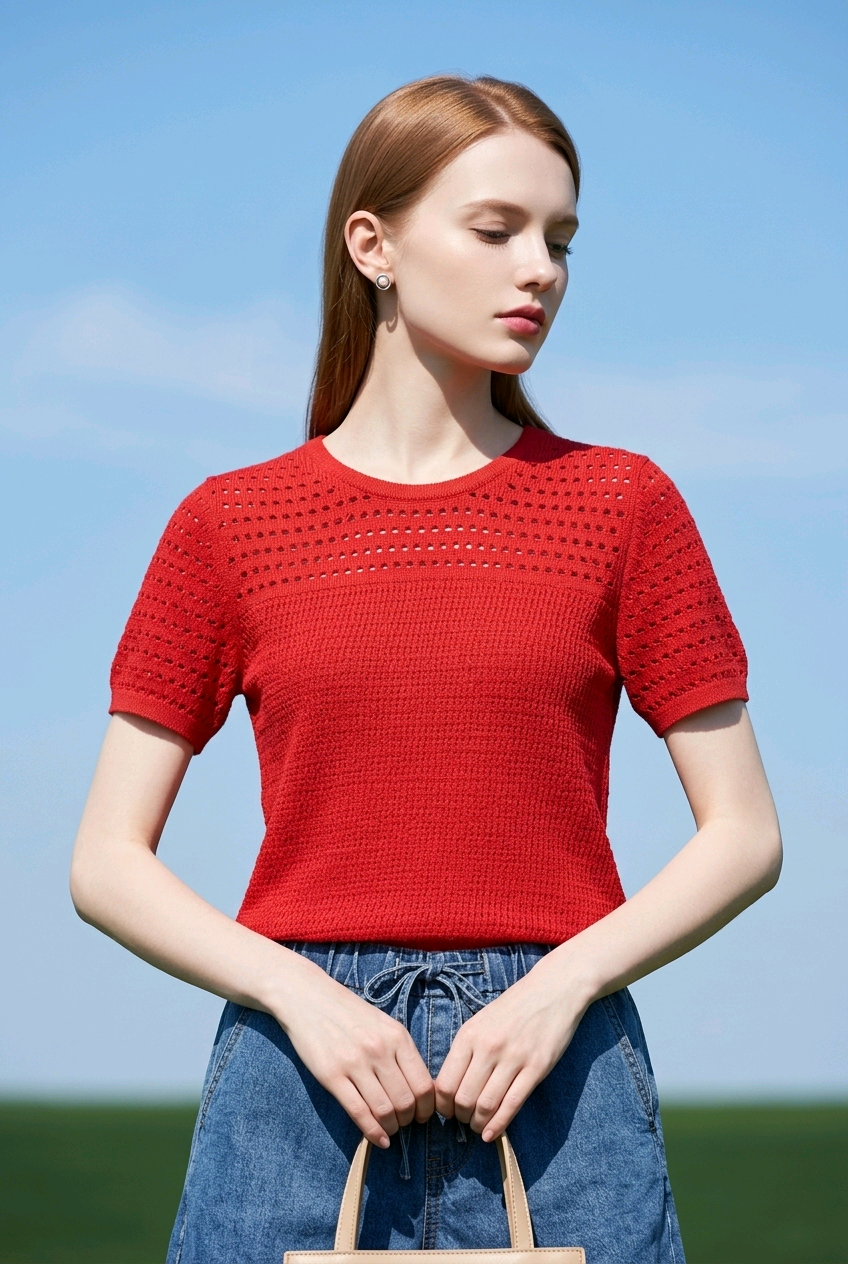 Μπλούζα πλεκτή με σχέδιο πλέξης, κοντό μανίκι στρογγυλή λαιμόκοψη.