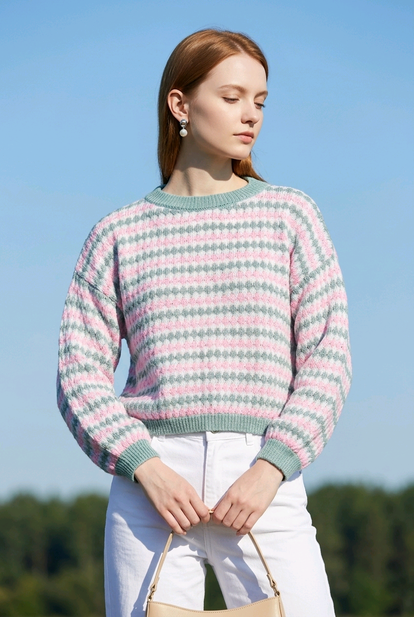 Πλεκτή μπλούζα ριγέ με σχέδιο πλέξης, μακρύ μανίκι και στρογγυλή λαιμόκοψη.