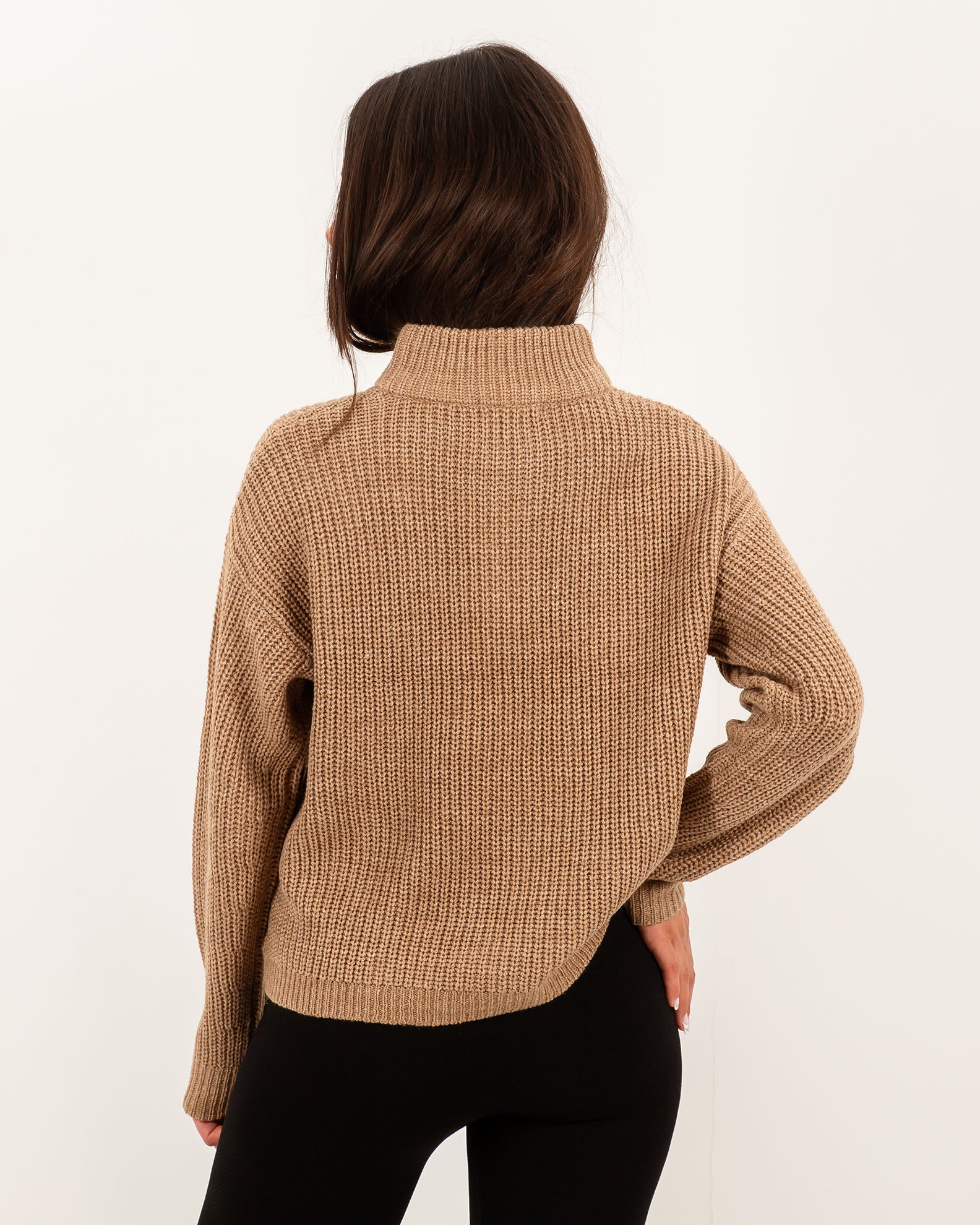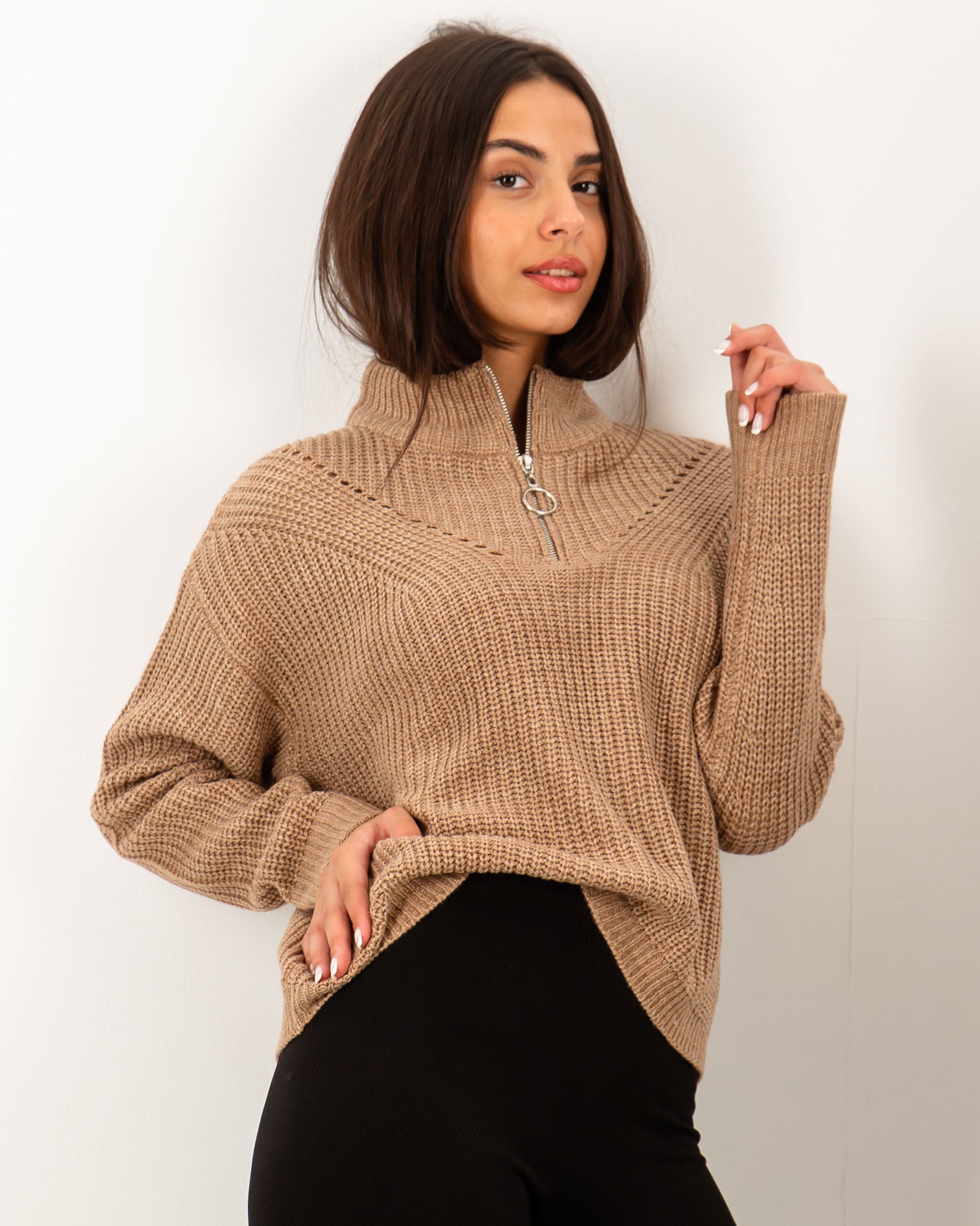 Πλεκτή μπλούζα με σχέδιο πλέξης, μακρύ μανίκι, όρθιο γιακά και κλείσιμο μπροστά με φερμουάρ.