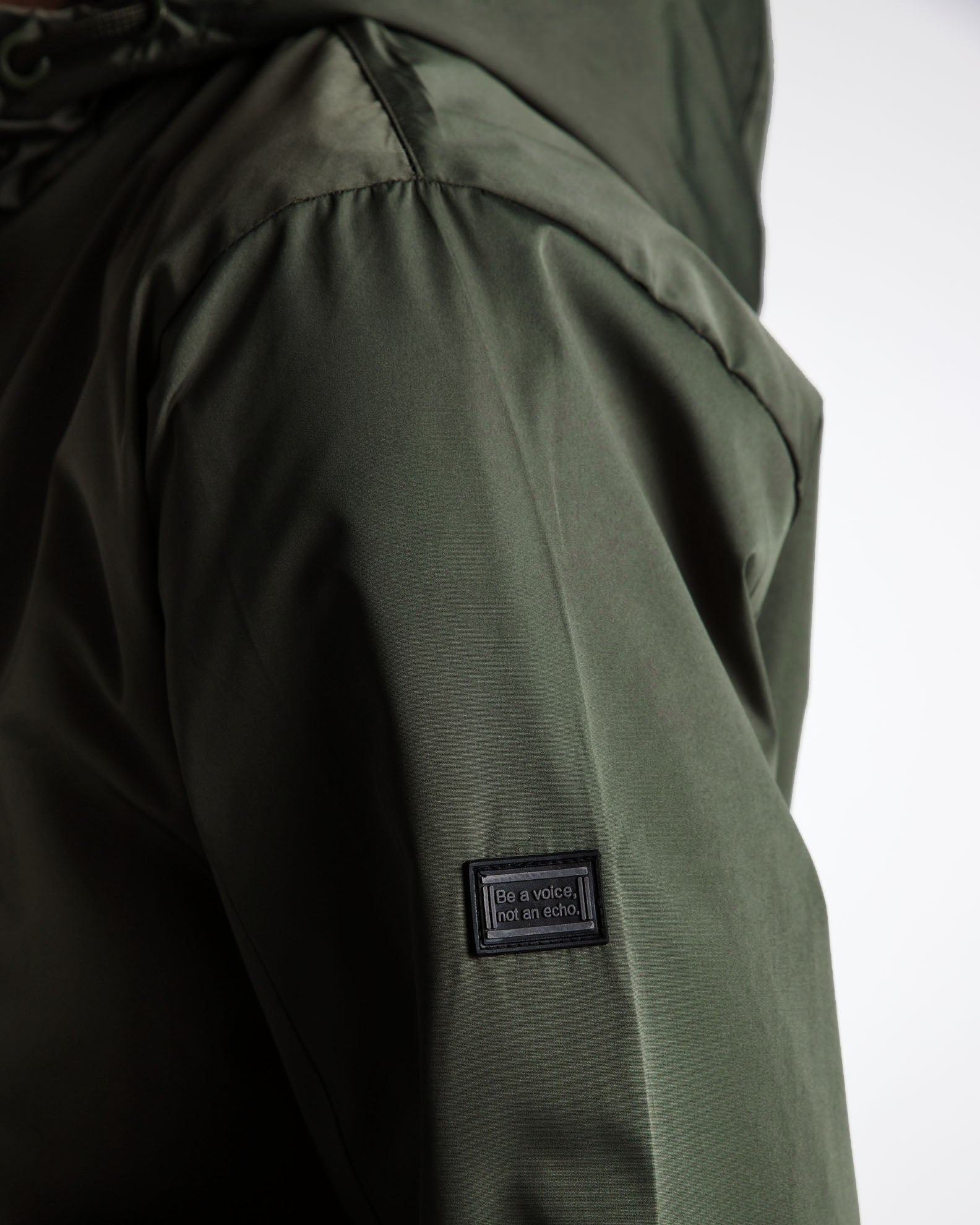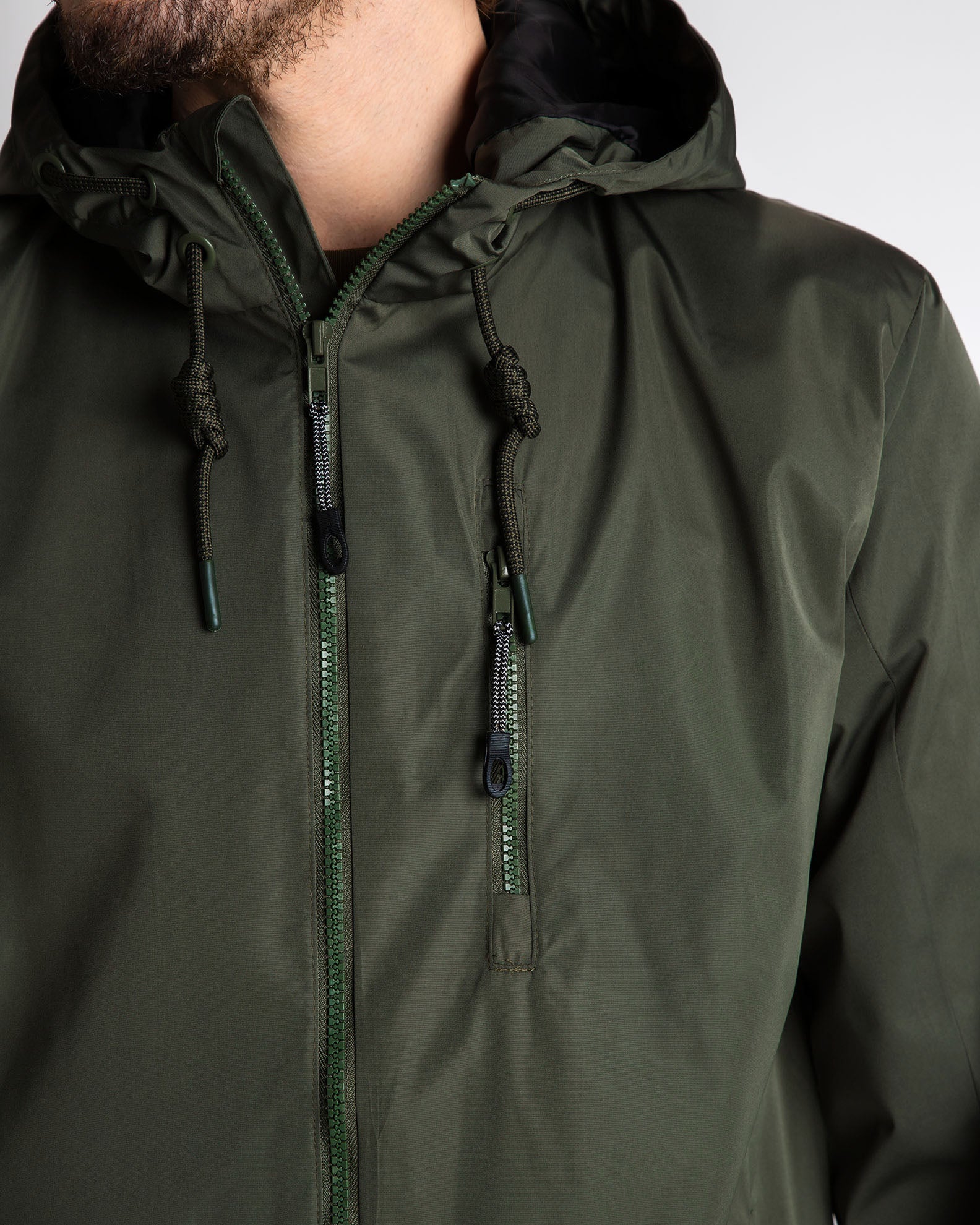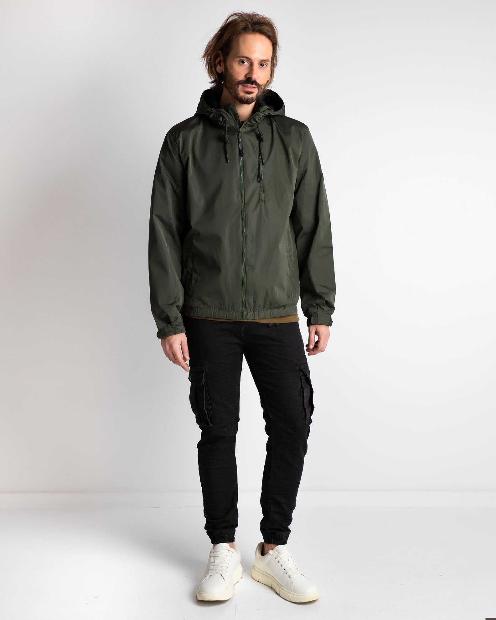 Μπουφάν με όρθιο γιακά και ρυθμιζόμενη κουκούλα. Μακρύ μανίκι που καταλήγει σε μανσέτα με πατ. Τσέπες στους γοφούς και τσεπη με φερμουάρ στο στήθος. Κλείσιμο μπροστά με φερμουάρ.