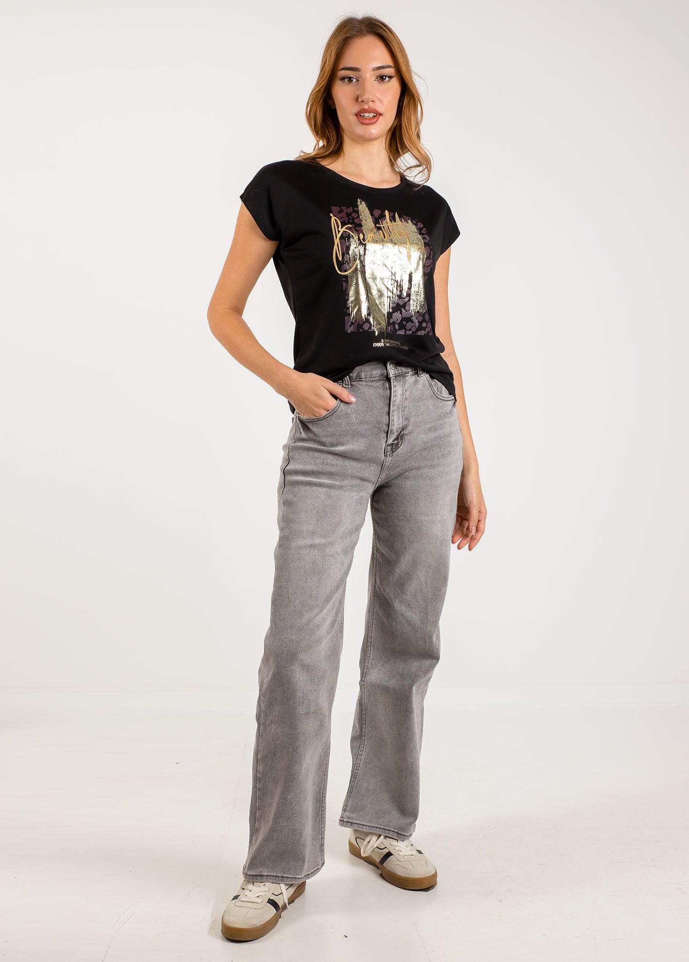 Μπλούζα με κοντό μανίκι, στρογγυλή λαιμόκοψη και σχέδιο με τύπωμα μπροστά σε αντίθεση.