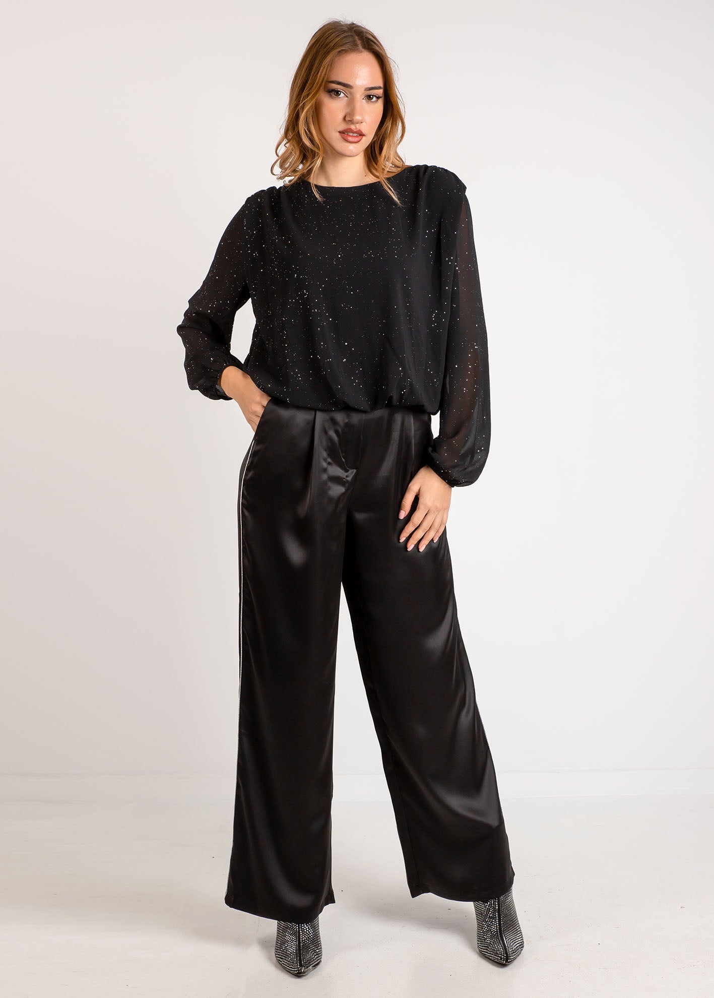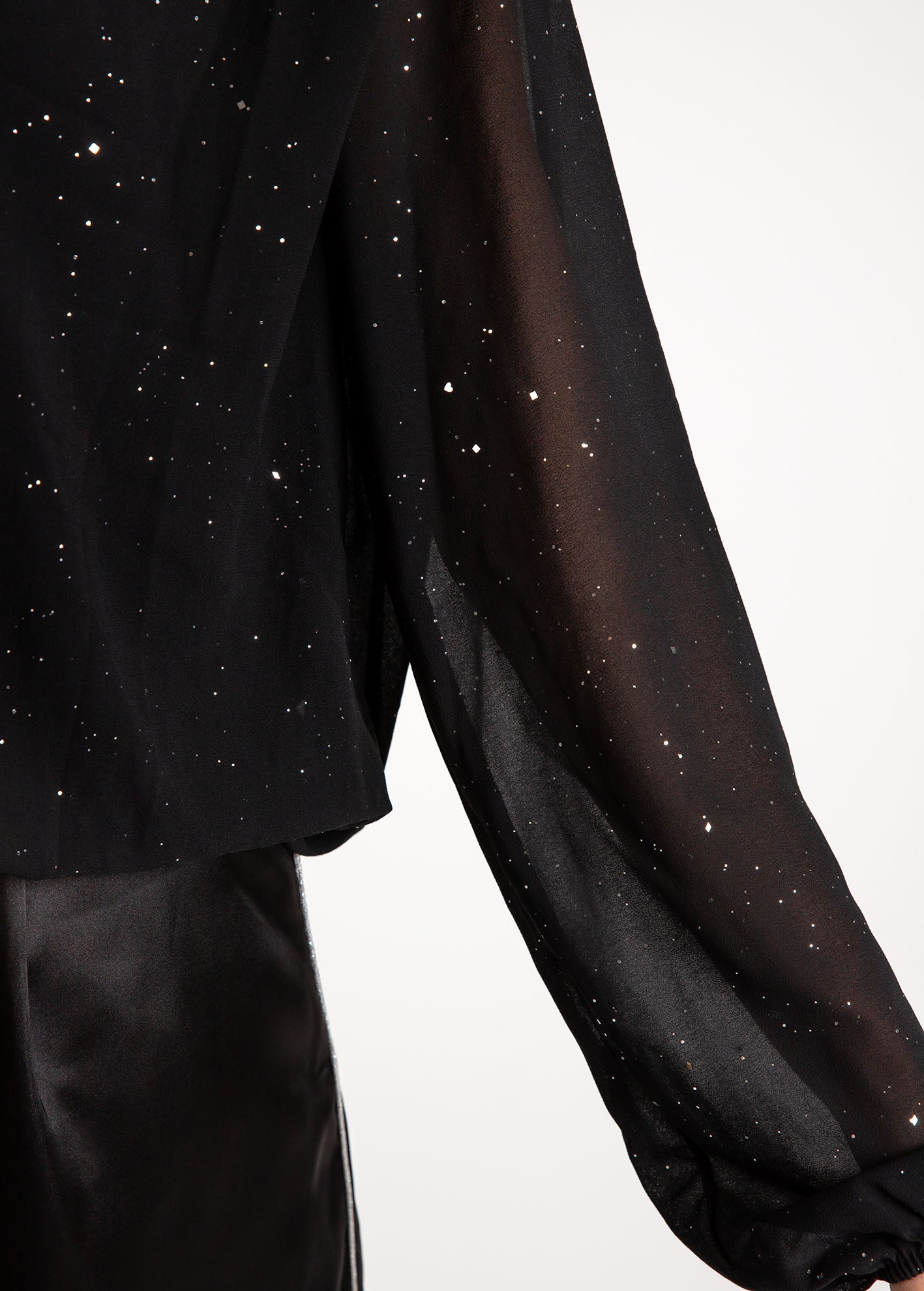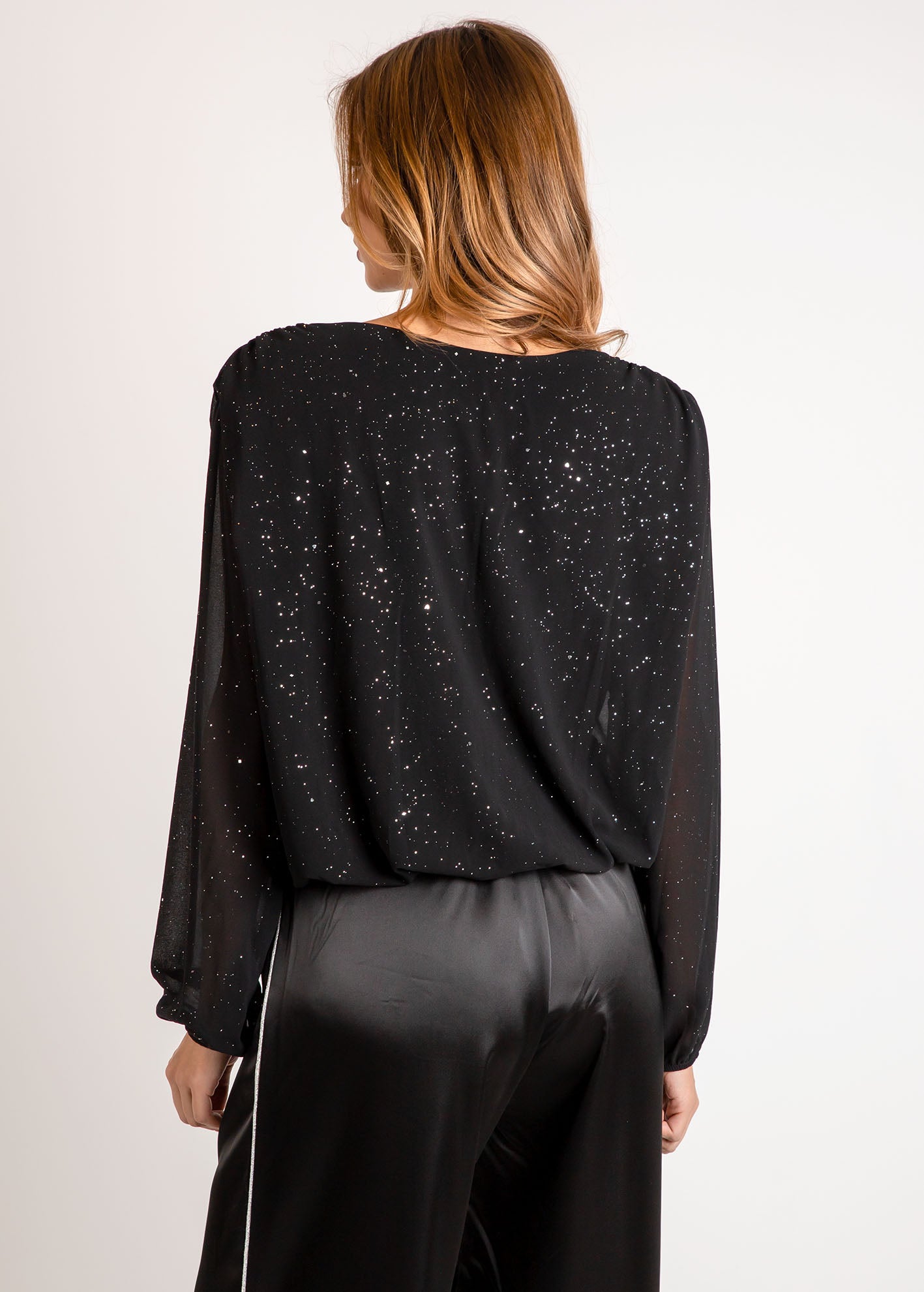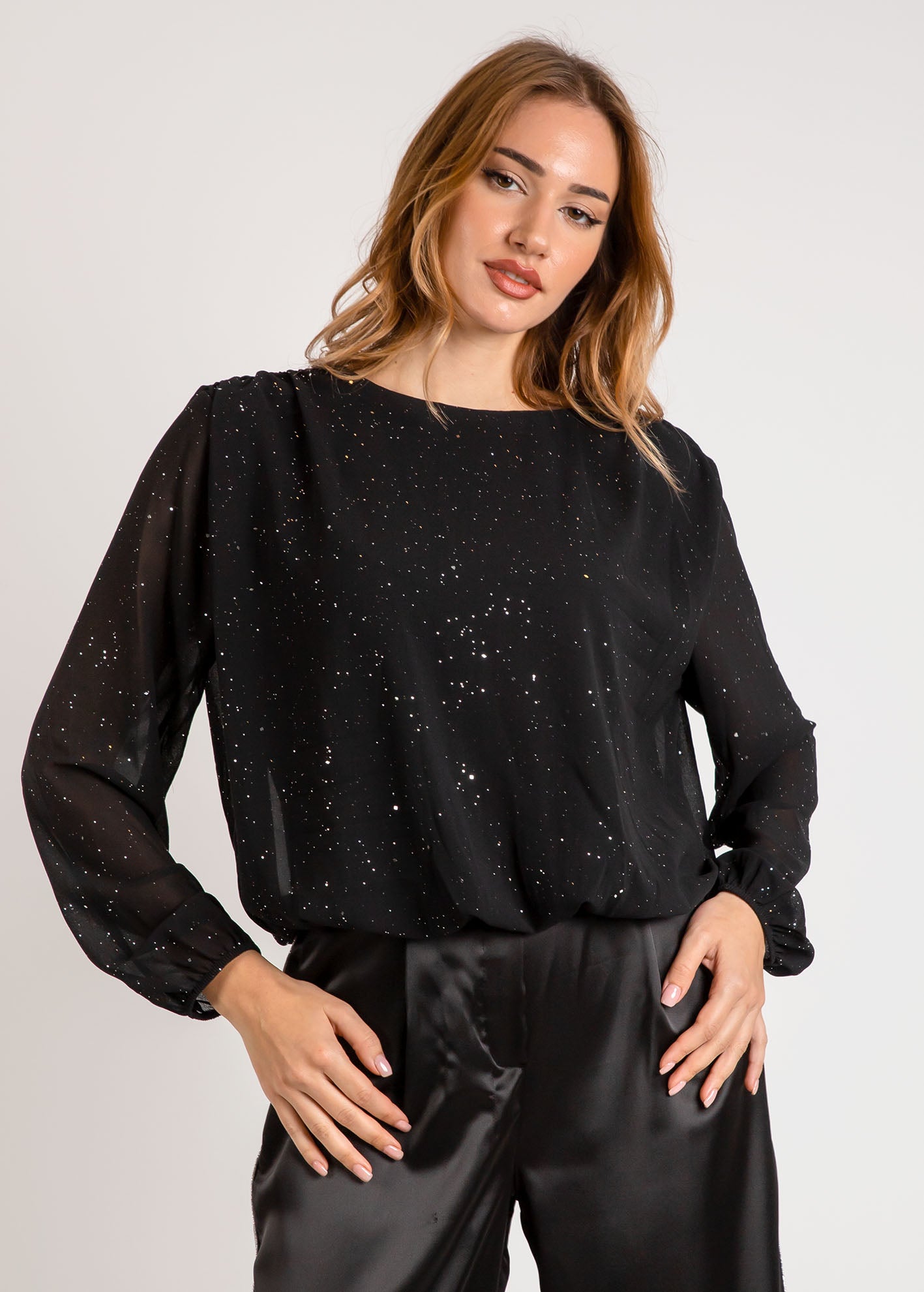 Μπλούζα με μακριά μανίκια σε μαύρο χρώμα με διακριτικές γκλίτερ λεπτομέρειες. Στρογγυλή λαιμόκοψη και ελαφρώς φουσκωτό τελείωμα.