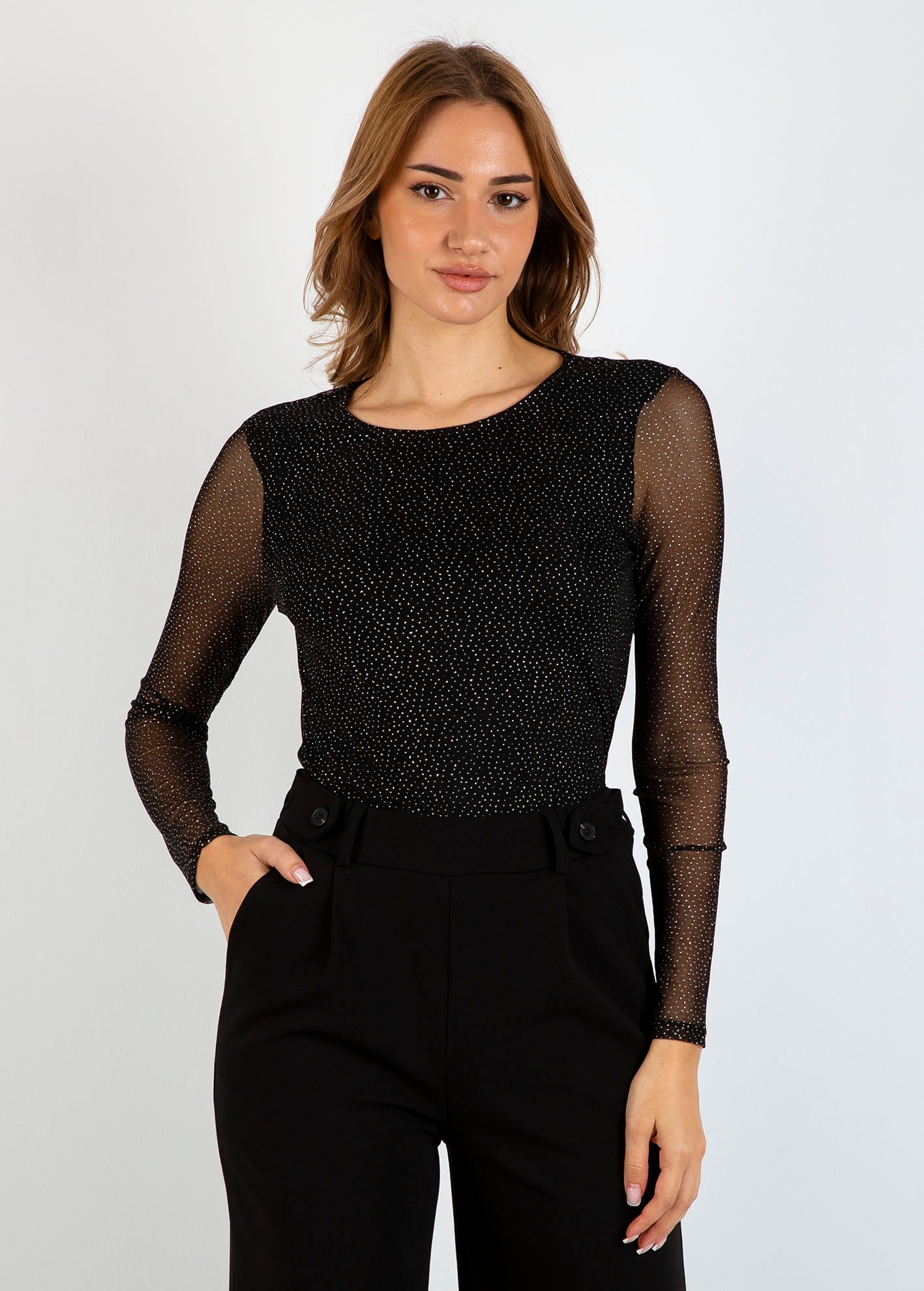 Μπλούζα εφαρμοστή από διαφανές τούλι σε μαύρο χρώμα με διακριτικές γκλίτερ λεπτομέρειες, μακριά μανίκια και στρογγυλή λαιμόκοψη. Λεπτομέρεια με διαφάνεια στα μανίκια και στην πλάτη.