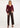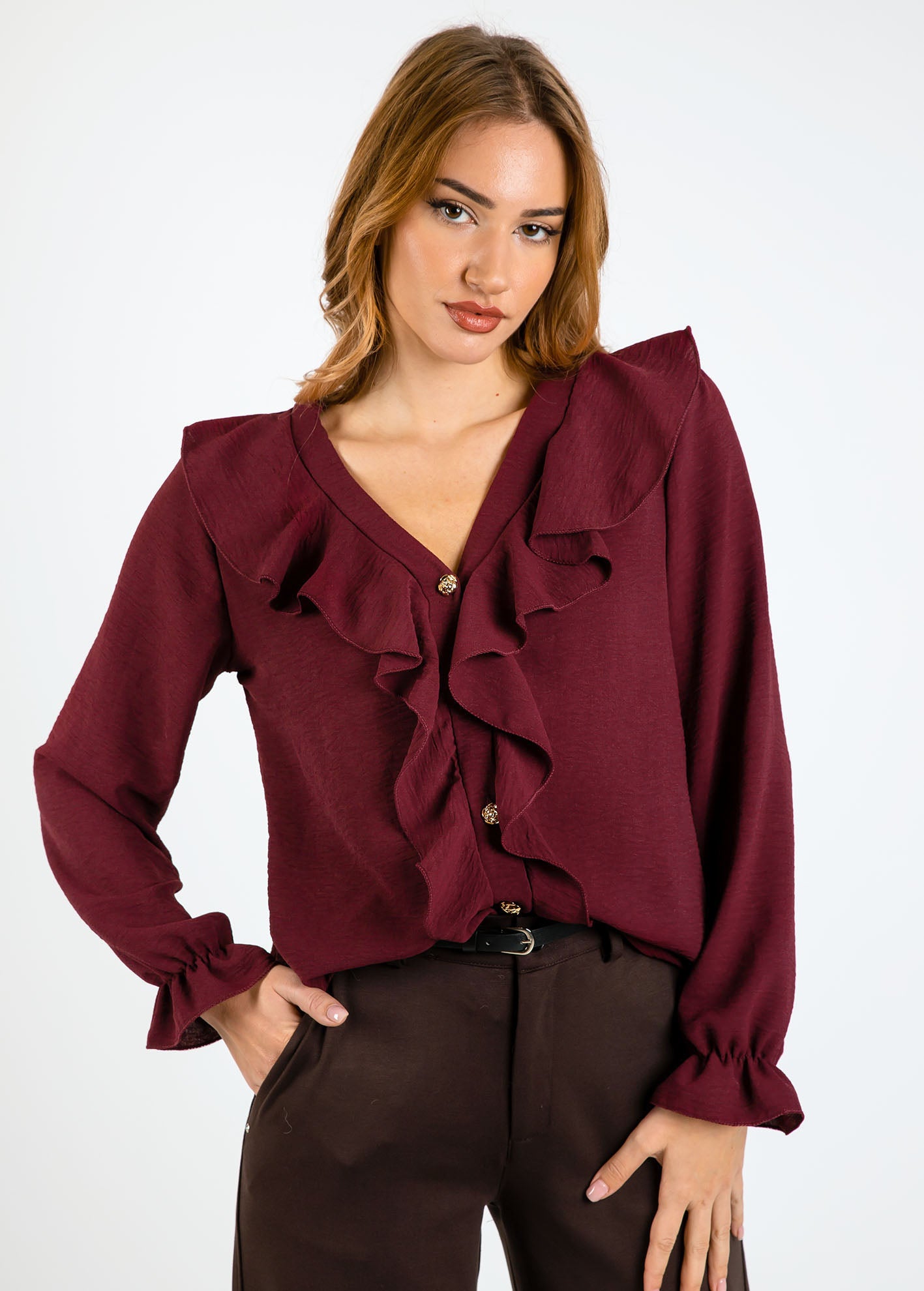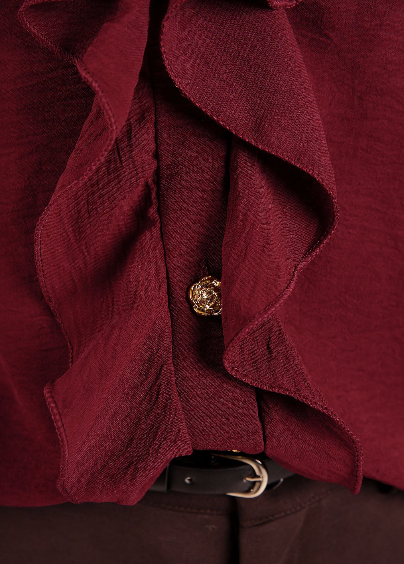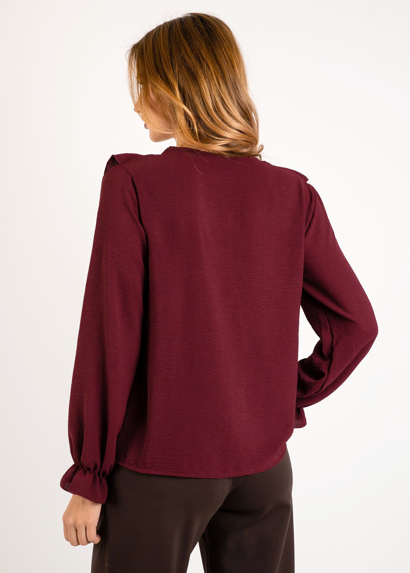 Πουκάμισο σε μπορντό απόχρωση με βολάν στο ντεκολτέ και στο μπροστινό μέρος, με κουμπιά μπροτστά και μακριά μανίκια με ελαστικό τελείωμα.
